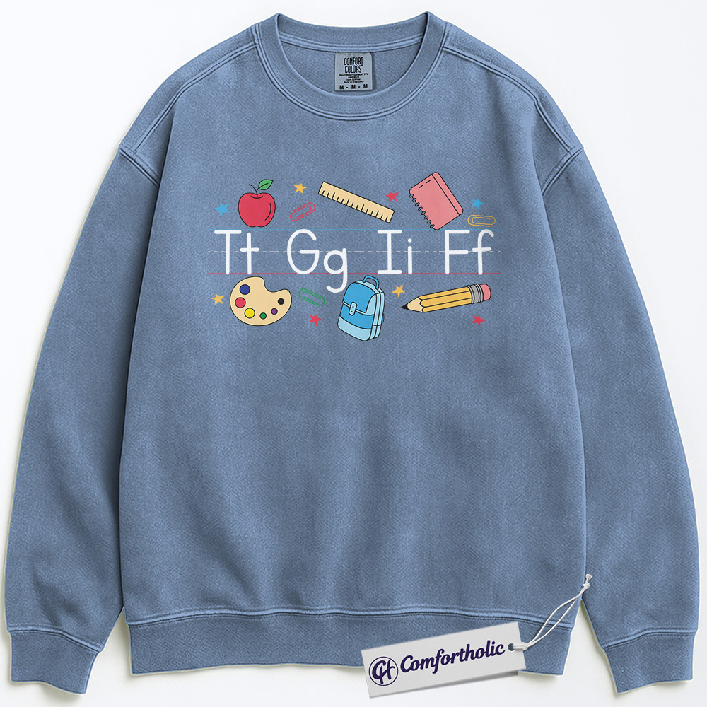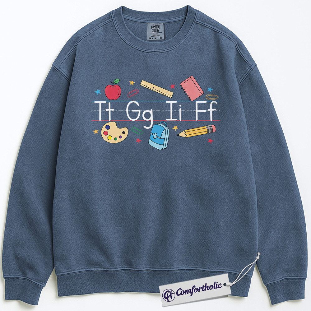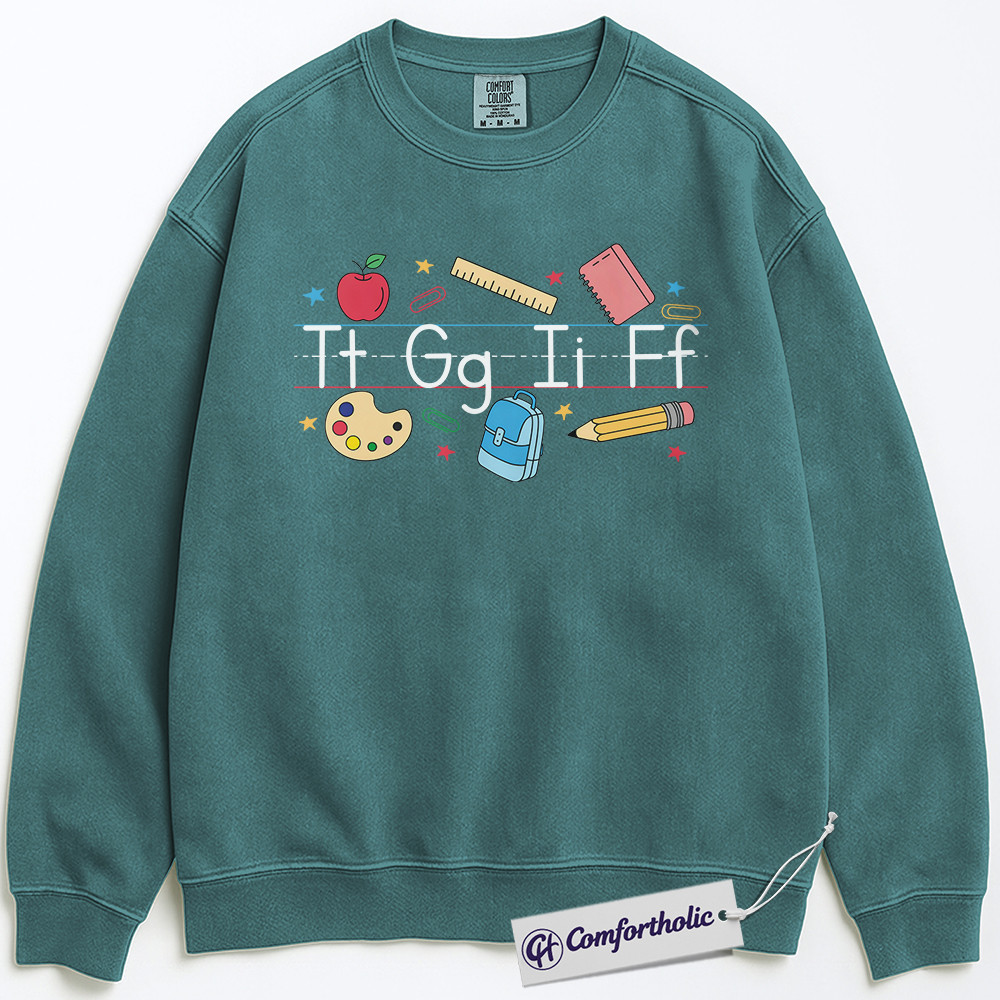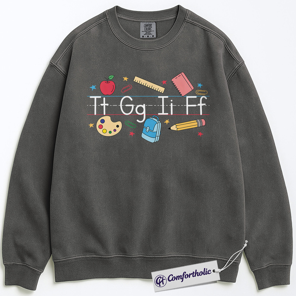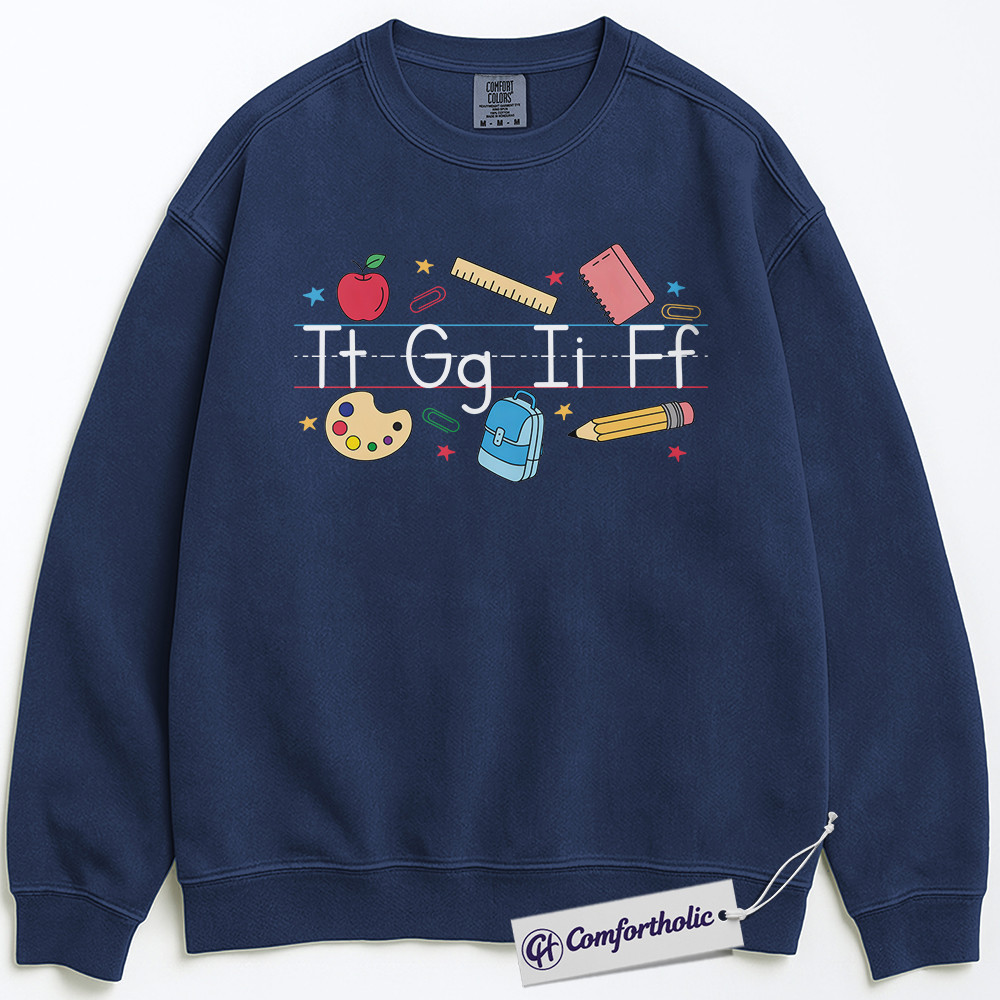 Alphabet Teacher Sweatshirt, Colorful Back to School Crewneck, Cute Kindergarten Graphic Pullover, Fun Elementary Educator Gift, Comfort Colors Sweatshirt