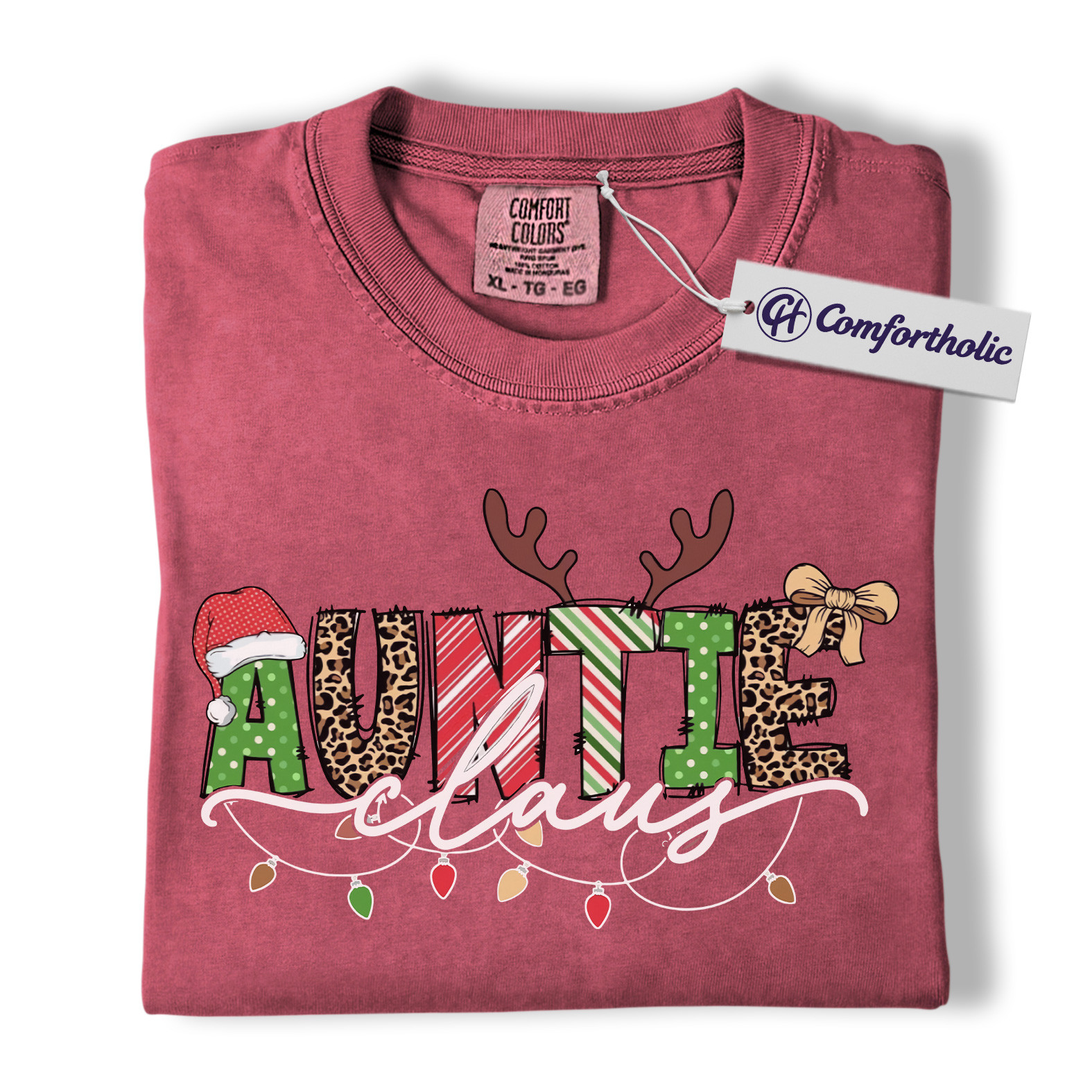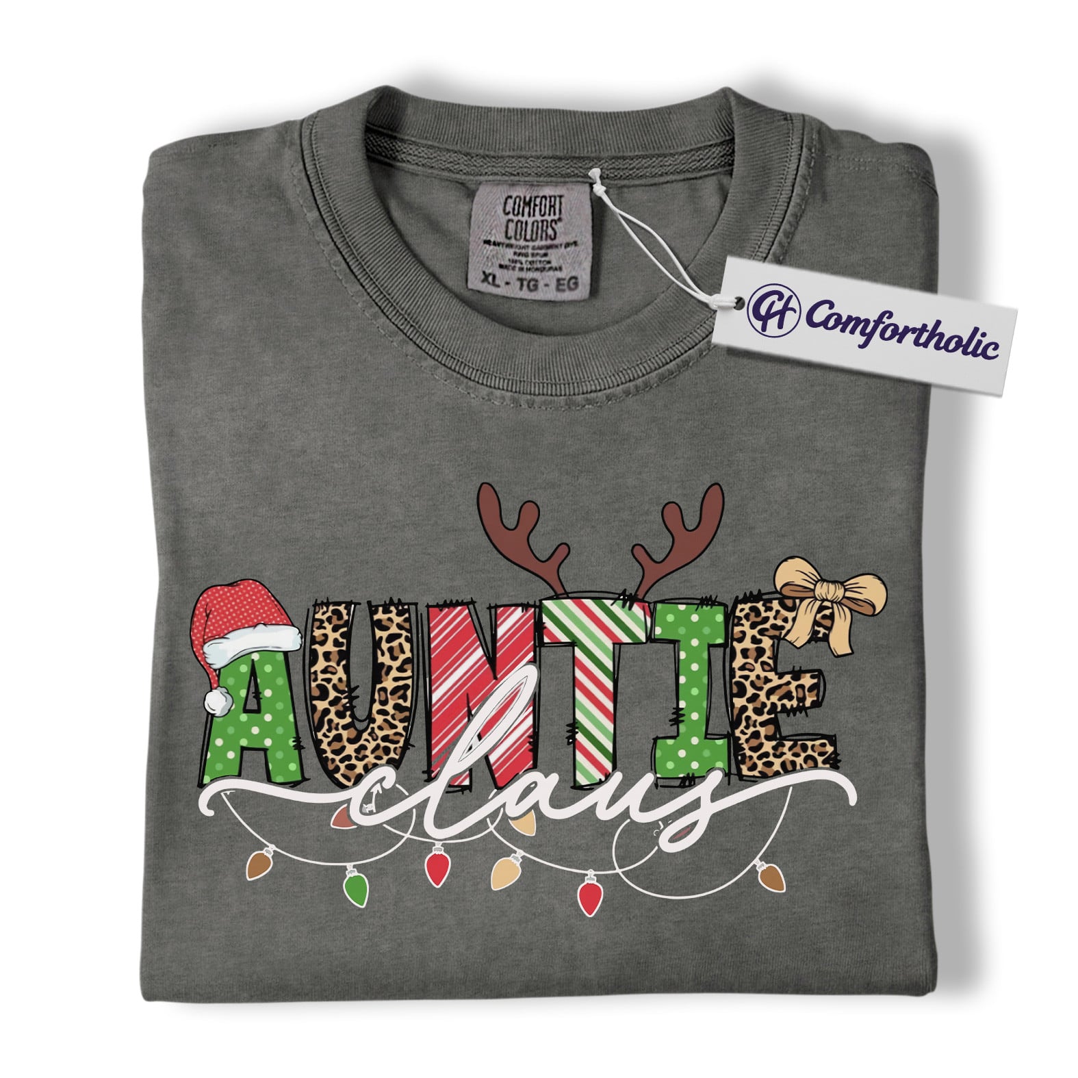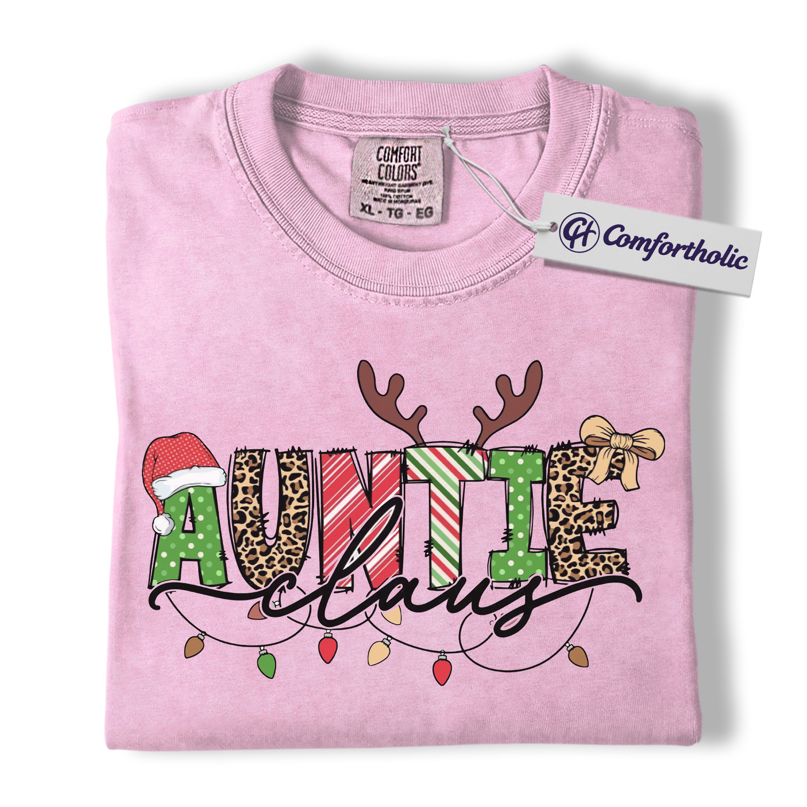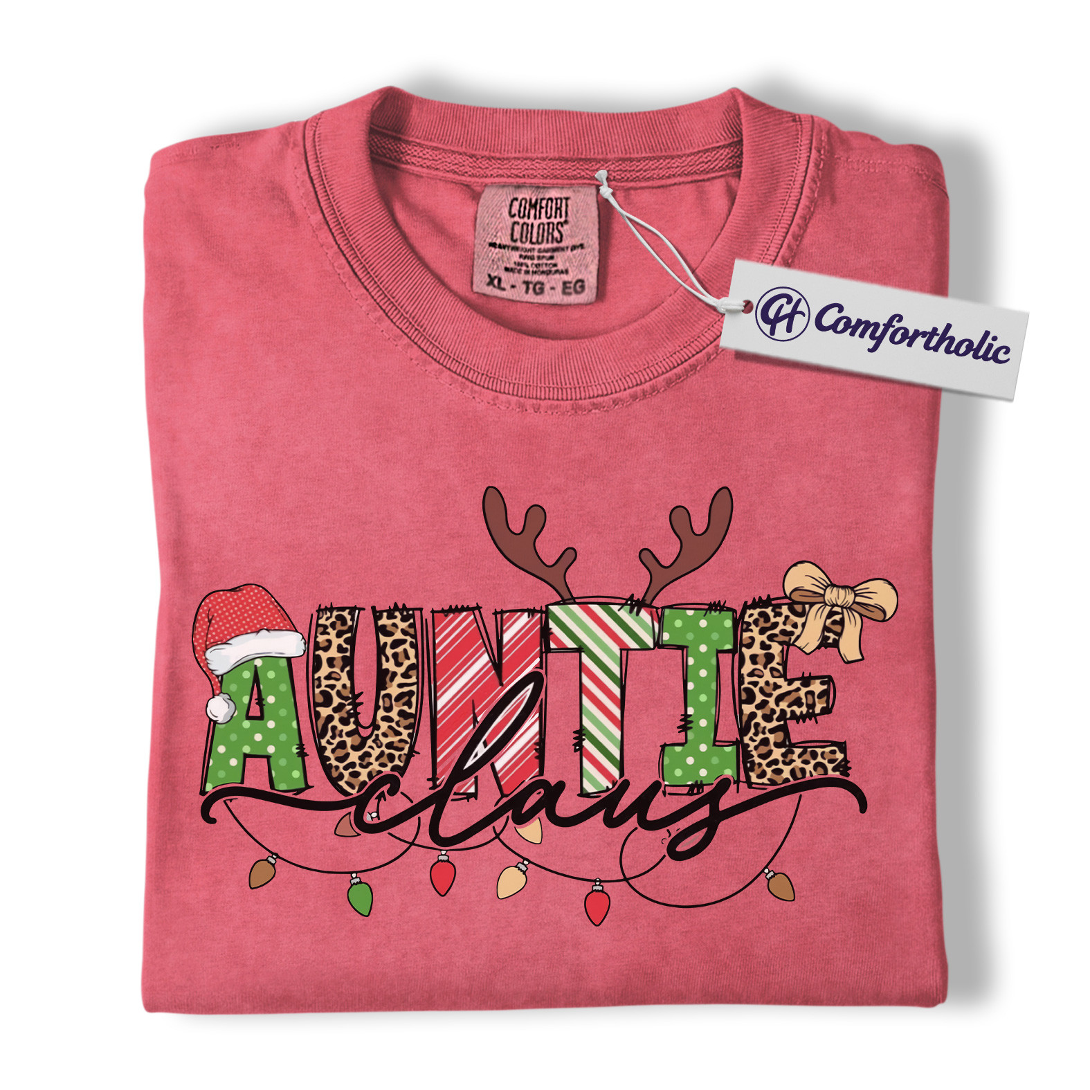 Auntie Claus Christmas Shirt, Funny Holiday Aunt T-Shirt, Cute Leopard Print Graphic Tee, Family Comfort Colors Shirt