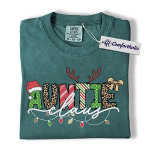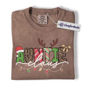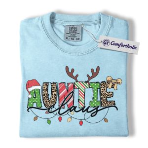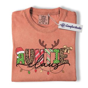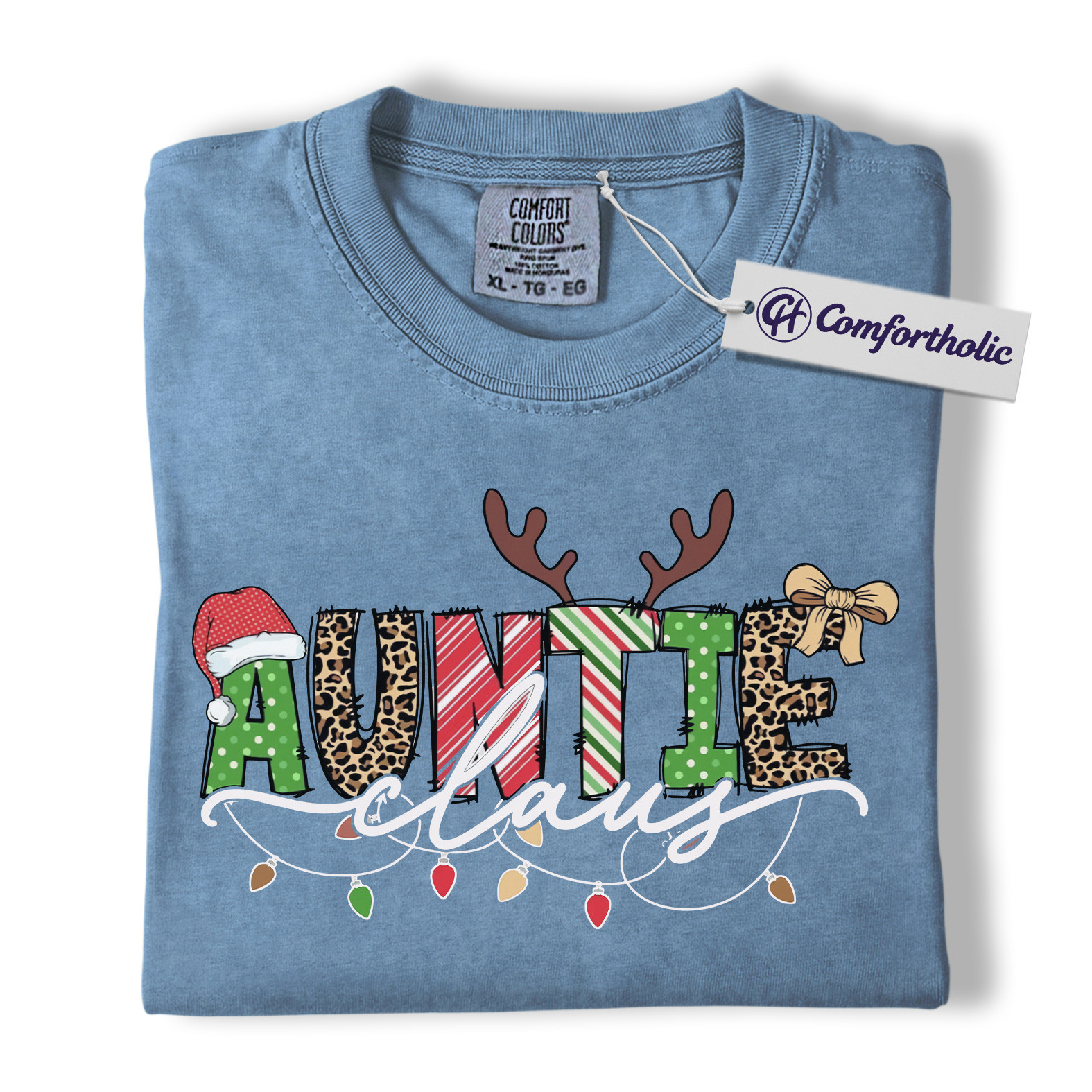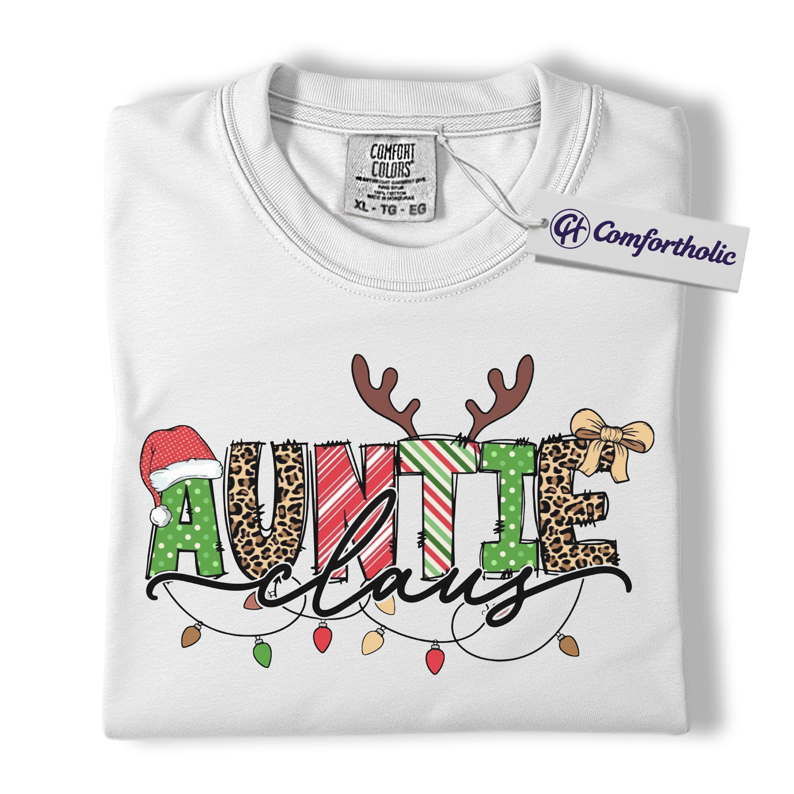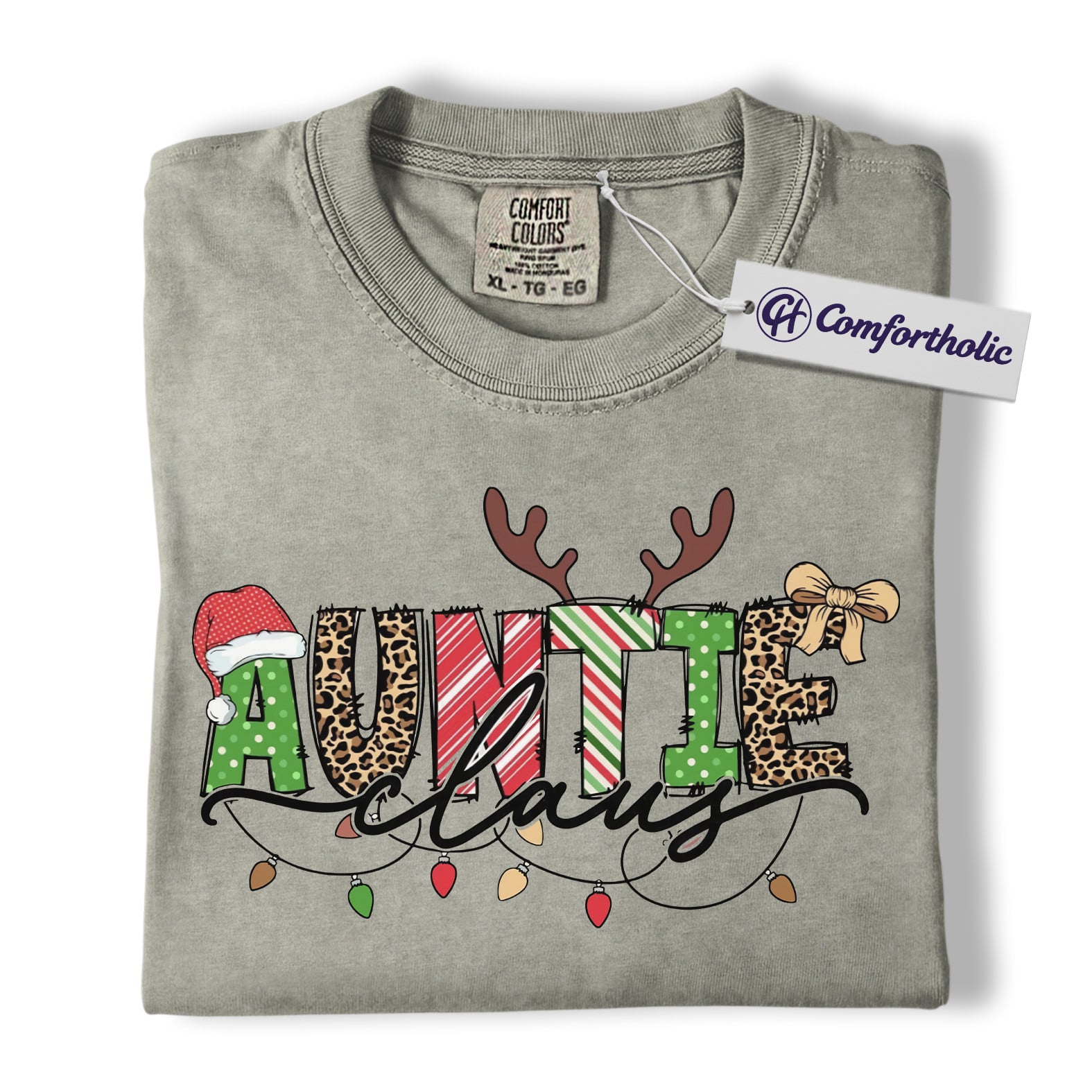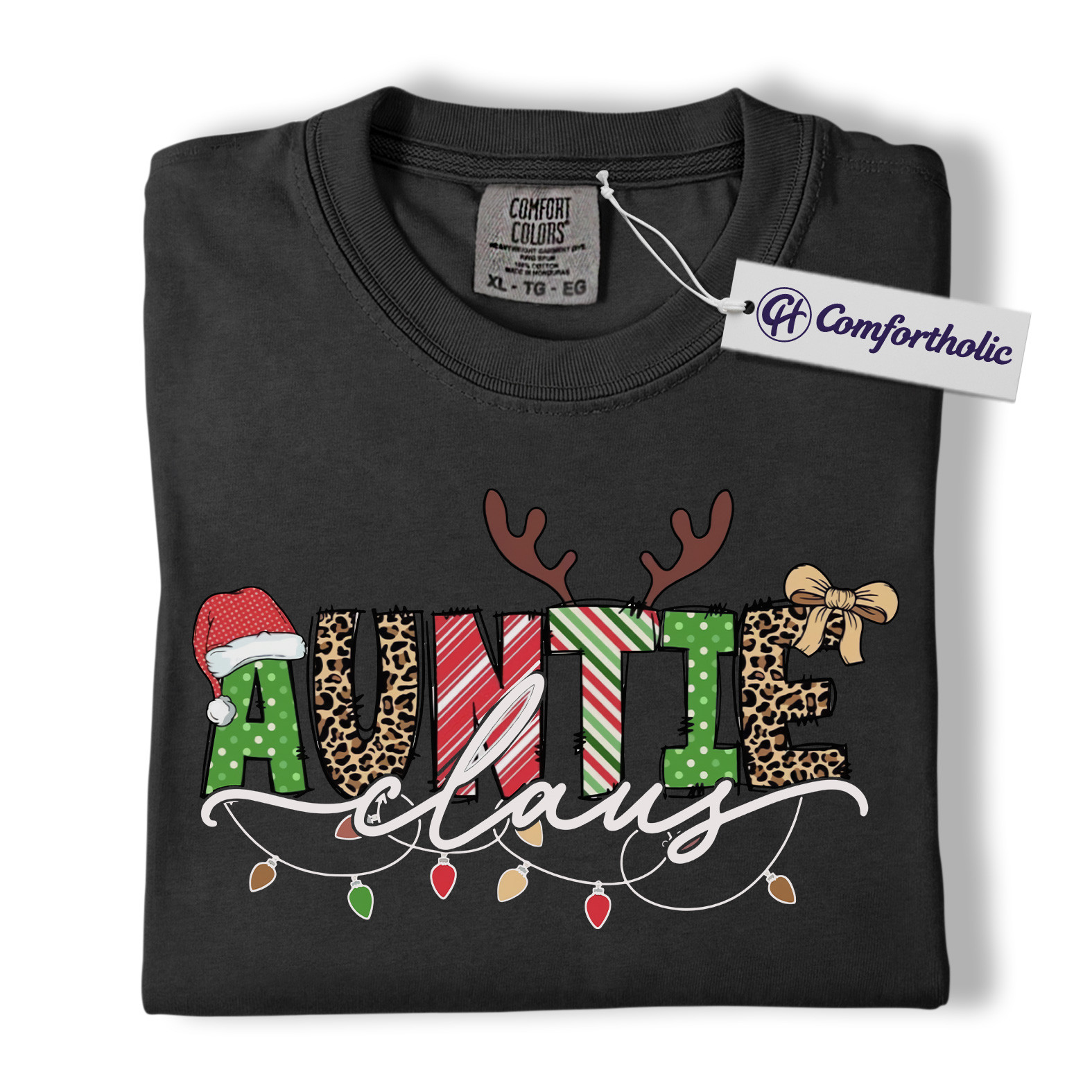 Auntie Claus Christmas Shirt, Funny Holiday Aunt T-Shirt, Cute Leopard Print Graphic Tee, Family Comfort Colors Shirt