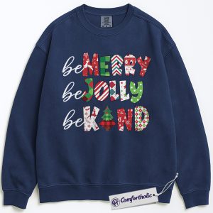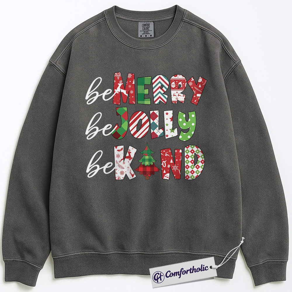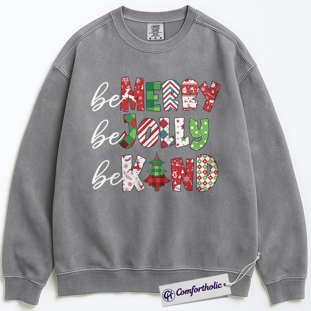Be Merry Be Jolly Be Kind Sweatshirt, Positive Christmas Quote Crewneck, Cute Holiday Kindness Graphic Pullover, Inspirational Gift for Teachers & Families, Christmas Comfort Colors Sweatshirt