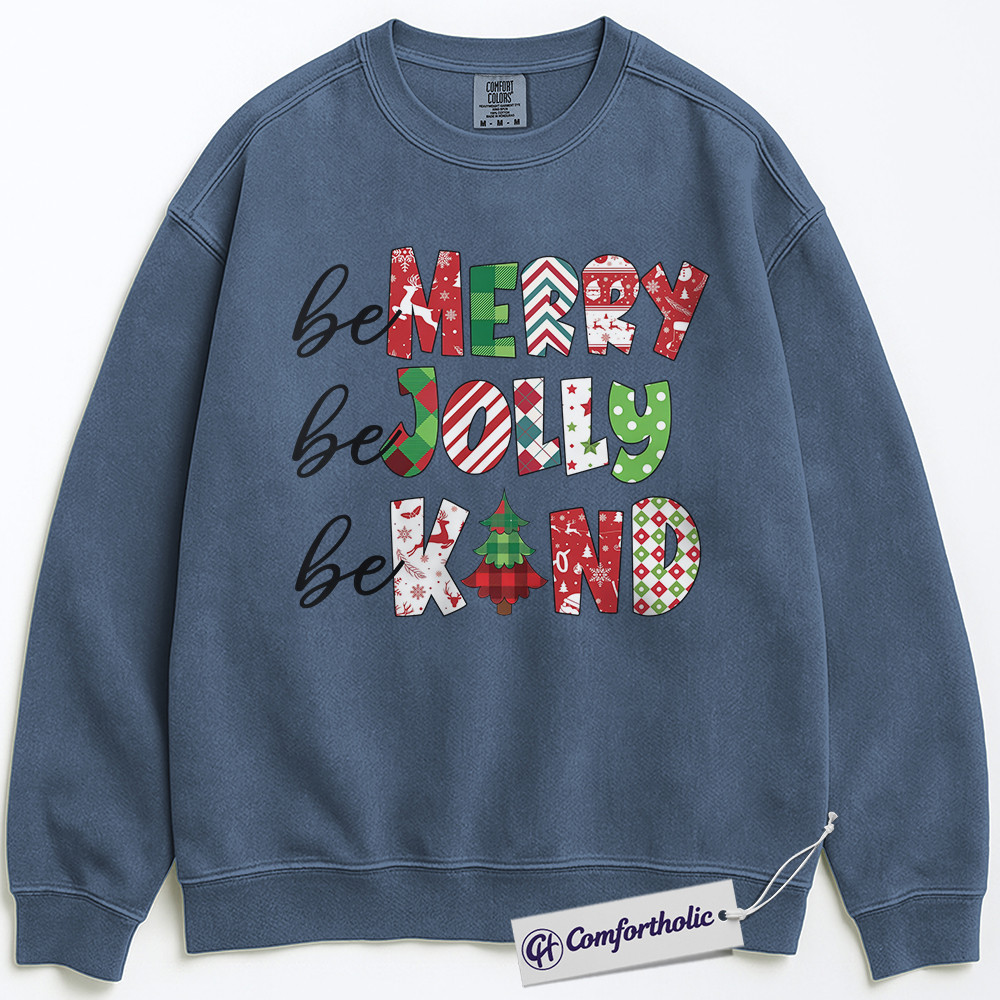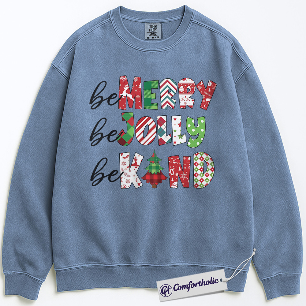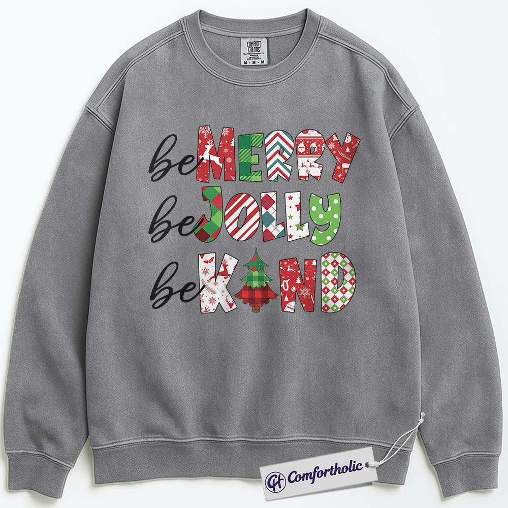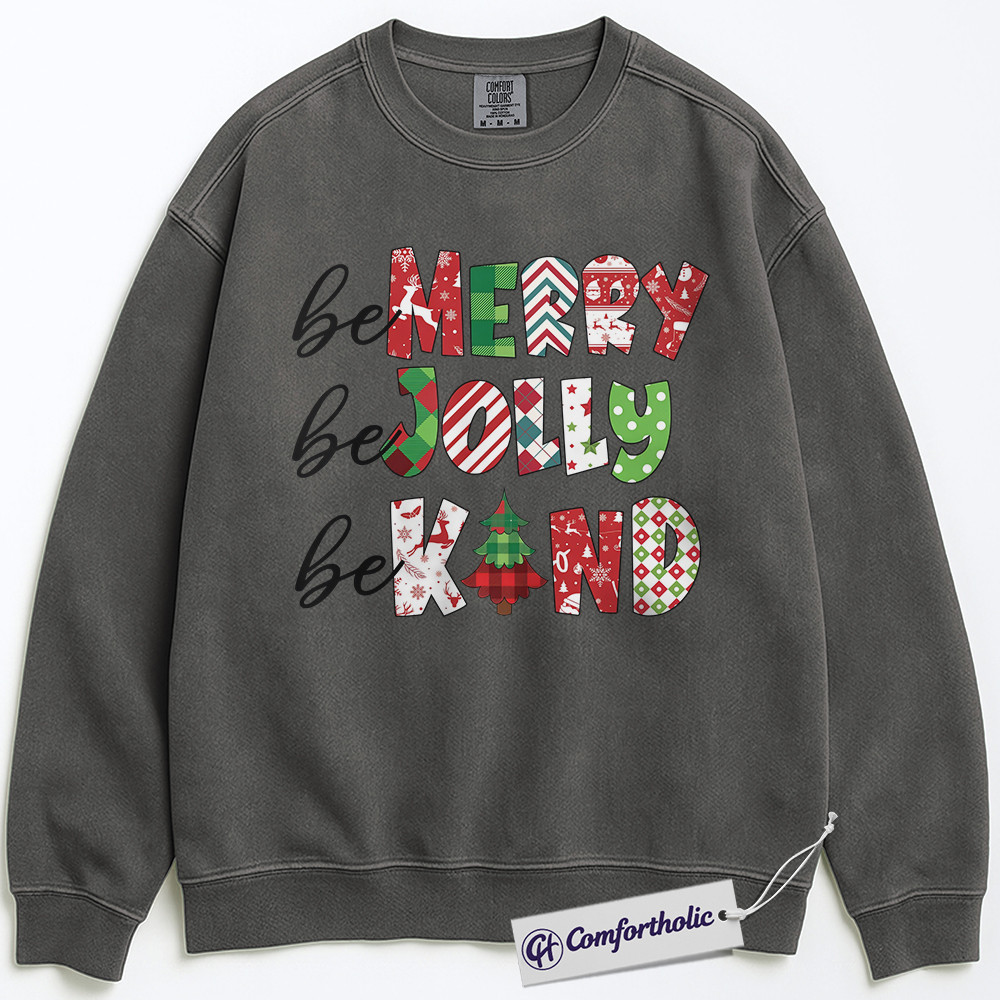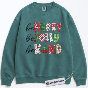 Be Merry Be Jolly Be Kind Sweatshirt, Positive Christmas Quote Pullover, Cute Holiday Kindness Graphic Crewneck, Inspirational Gift for Teachers & Families, Christmas Comfort Colors Sweatshirt