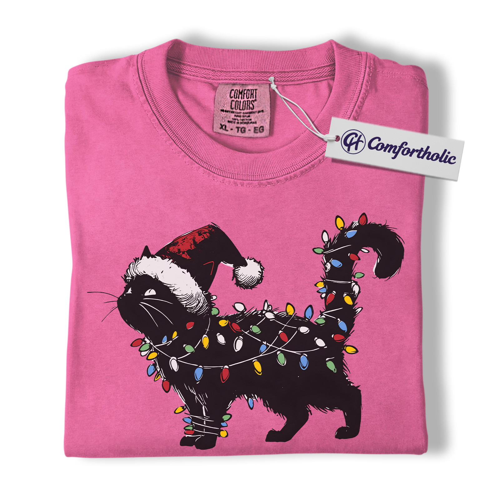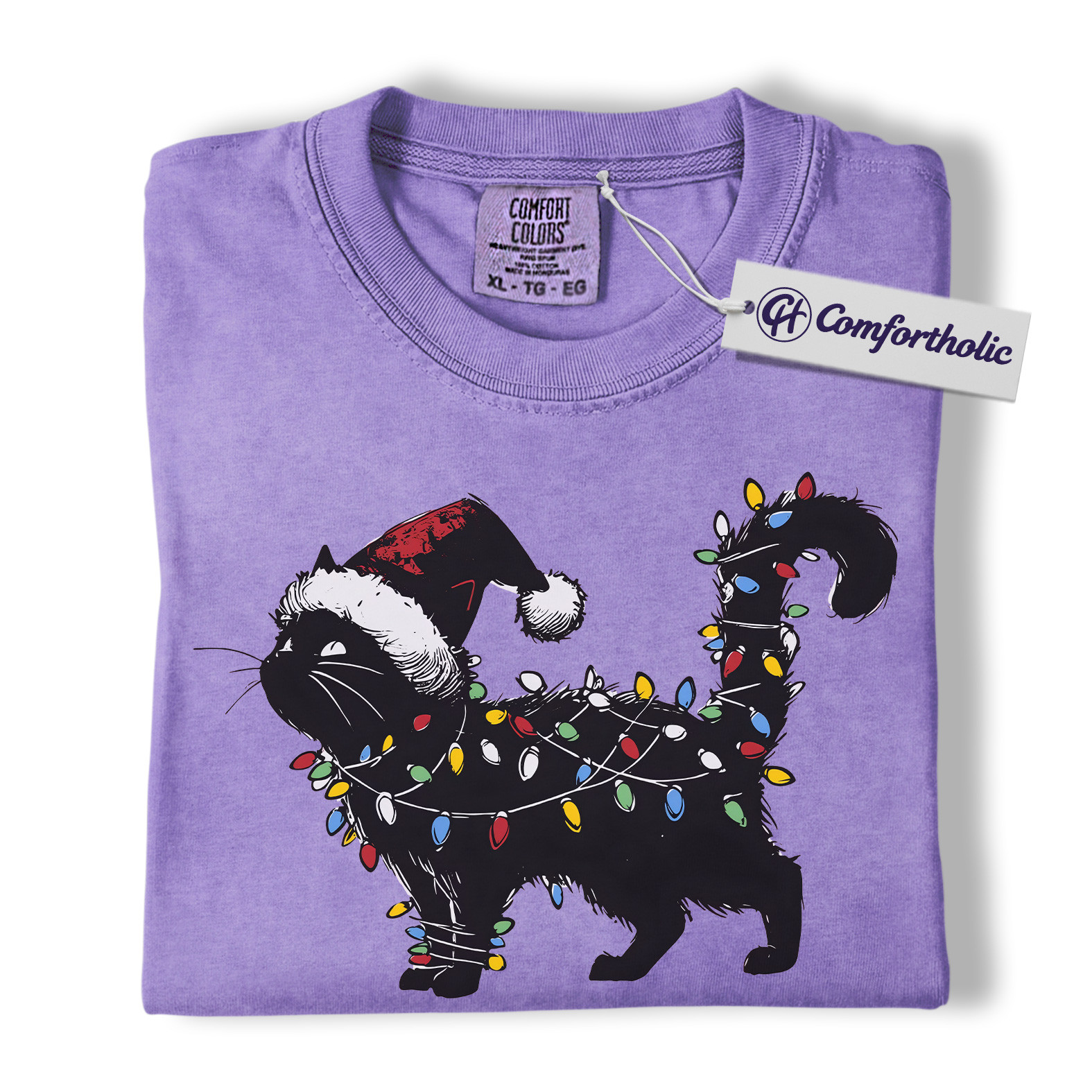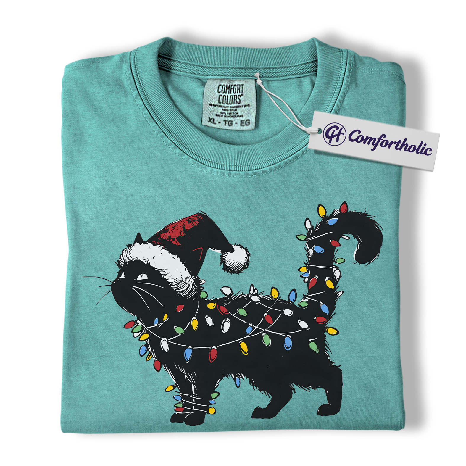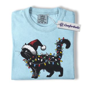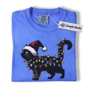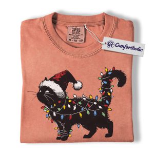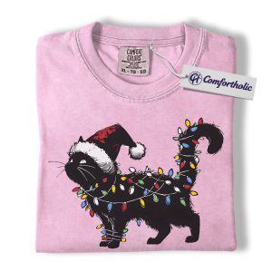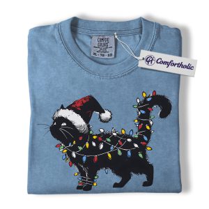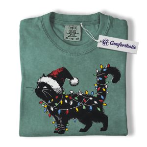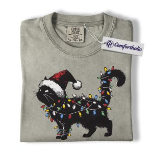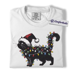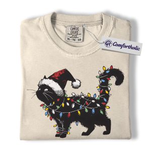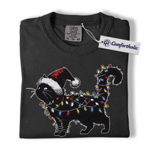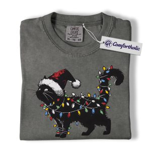 Black Cat Christmas Shirt, Funny Santa Hat Cat T-Shirt, Cute Festive Kitty Holiday Graphic Tee, Christmas Gift for Cat Lovers, Christmas Comfort Colors Shirt