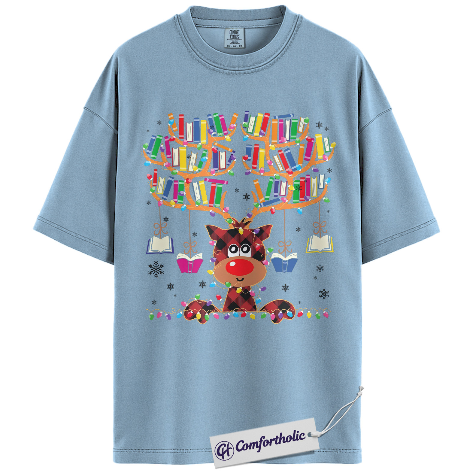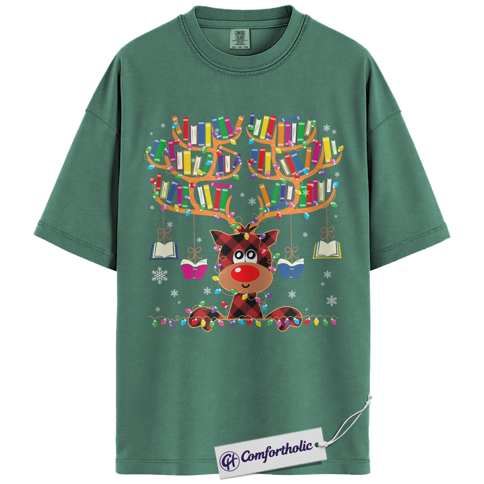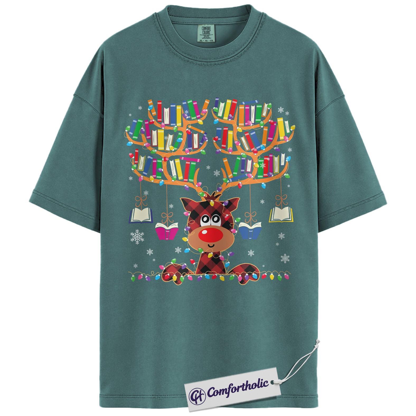 Book Lover Christmas Shirt, Cute Reindeer Reading T-Shirt, Funny Plaid Book Antler Graphic Tee, Holiday Gift for Teachers and Librarians, Christmas Comfort Colors Shirt