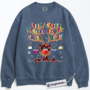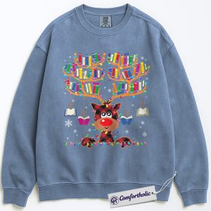 Book Lover Christmas Sweatshirt, Cute Reindeer Reading Sweatshirt, Funny Plaid Book Antler Graphic Sweatshirt, Holiday Gift for Teachers and Librarians, Christmas Comfort Colors Sweatshirt