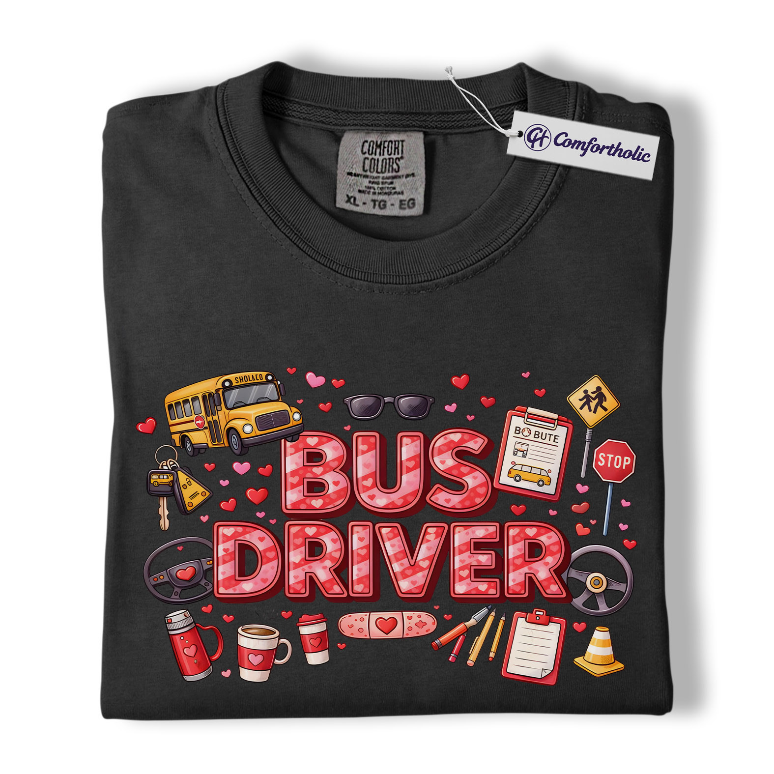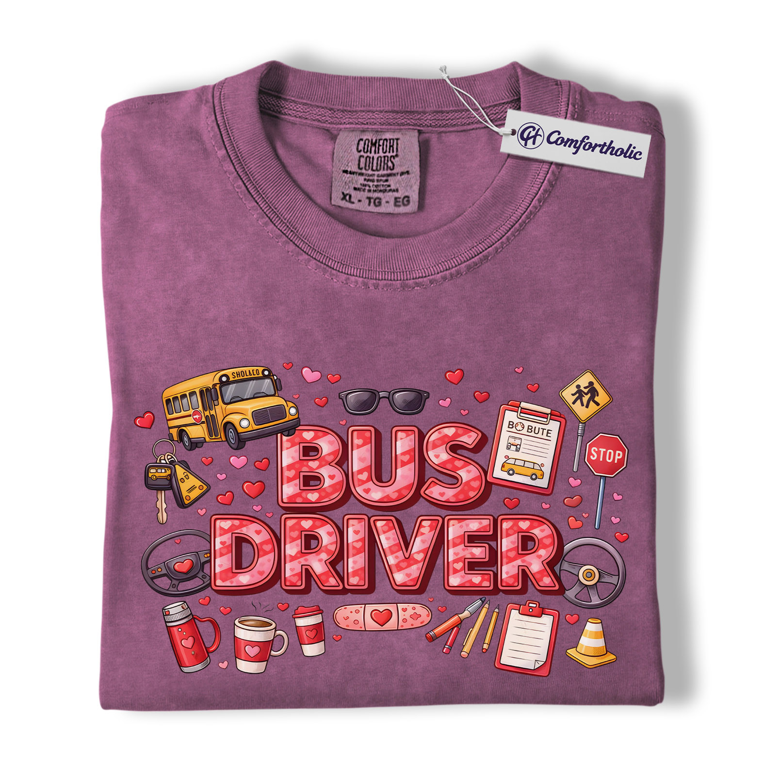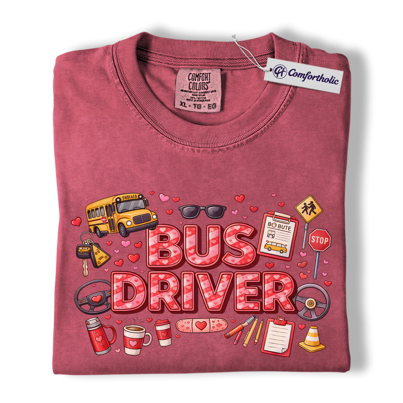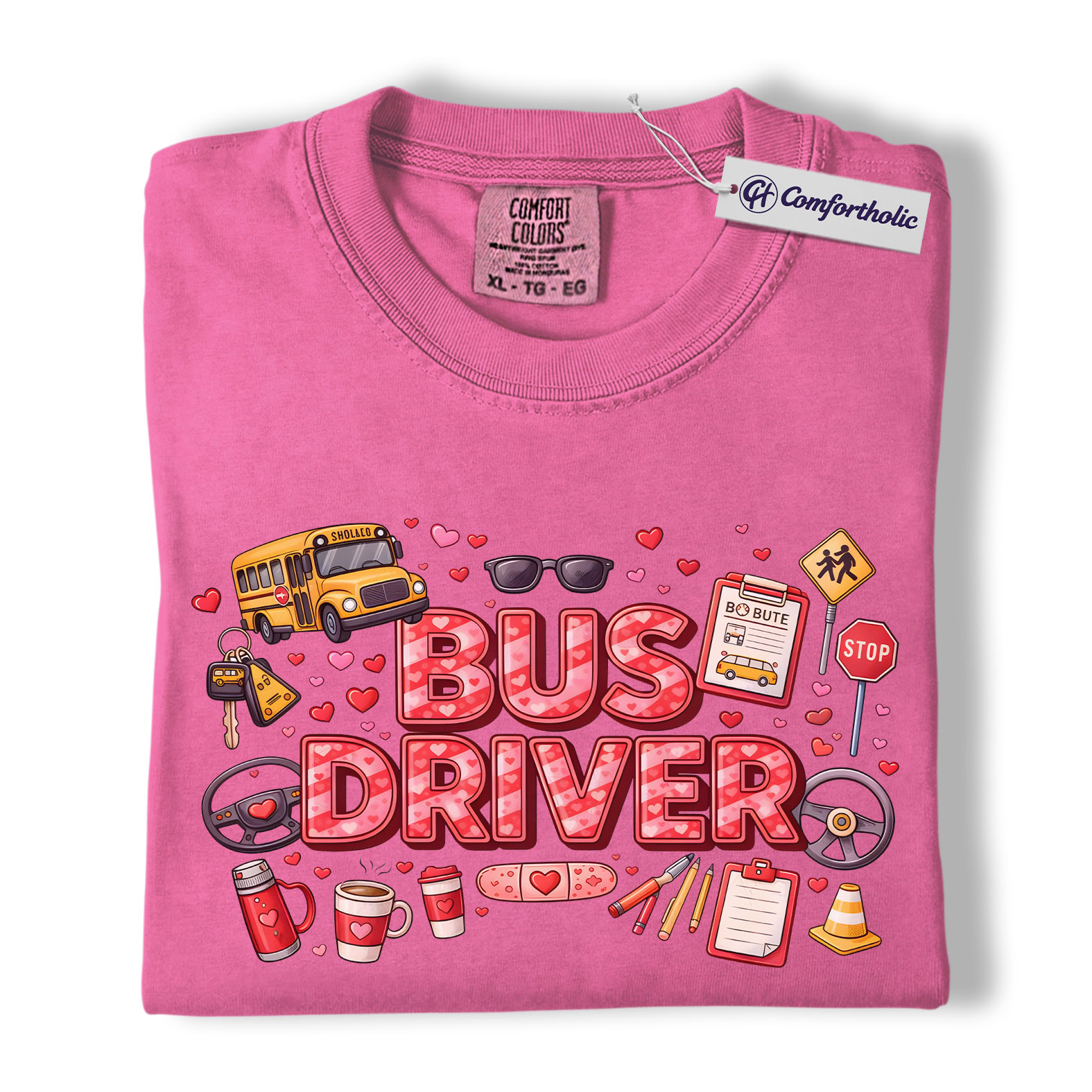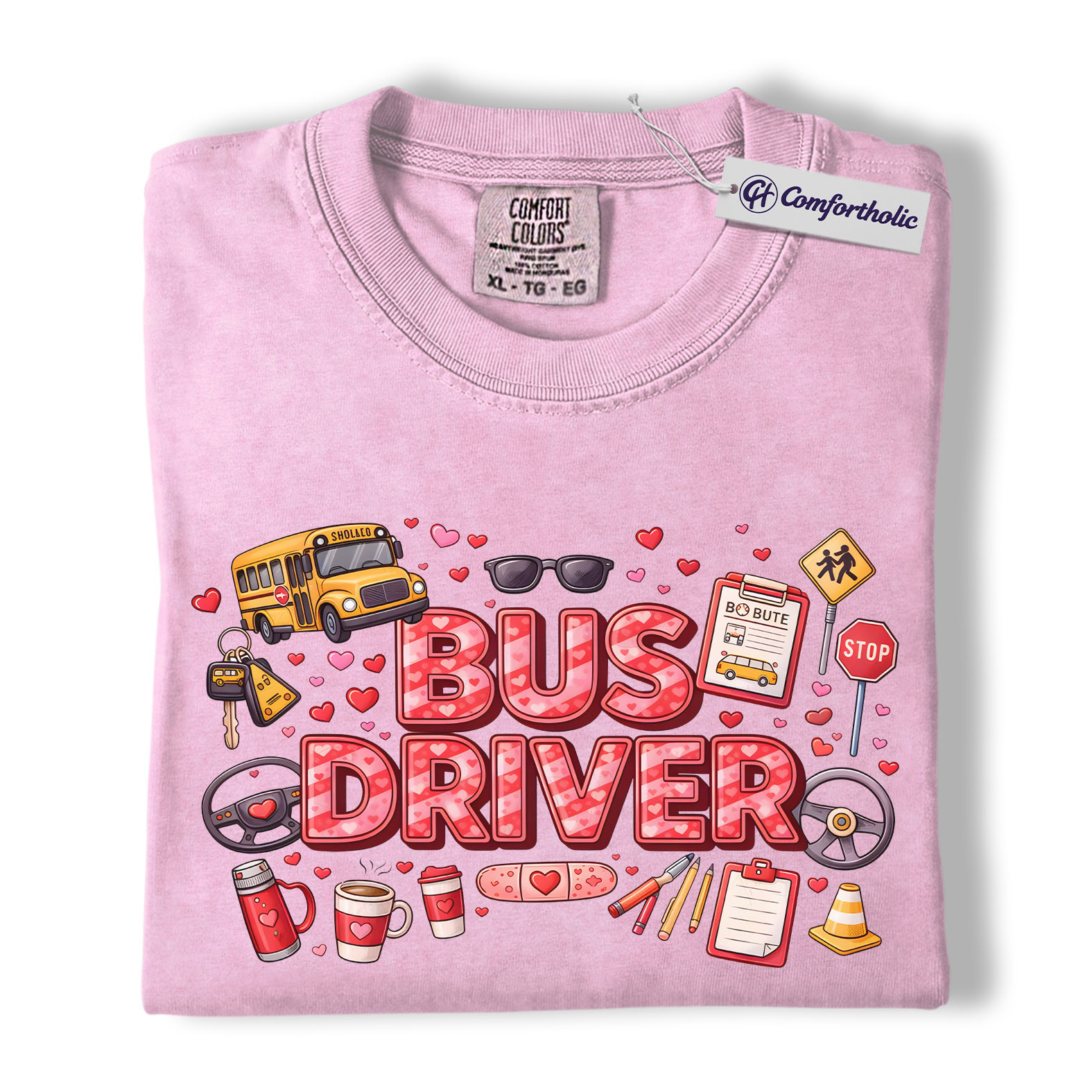 Bus Driver Valentine Shirt, Pink Heart Bus Graphic Tee, School Bus Driver Appreciation T-Shirt, Valentine’s Day Gift for Bus Drivers, Comfort Colors Shirt