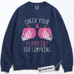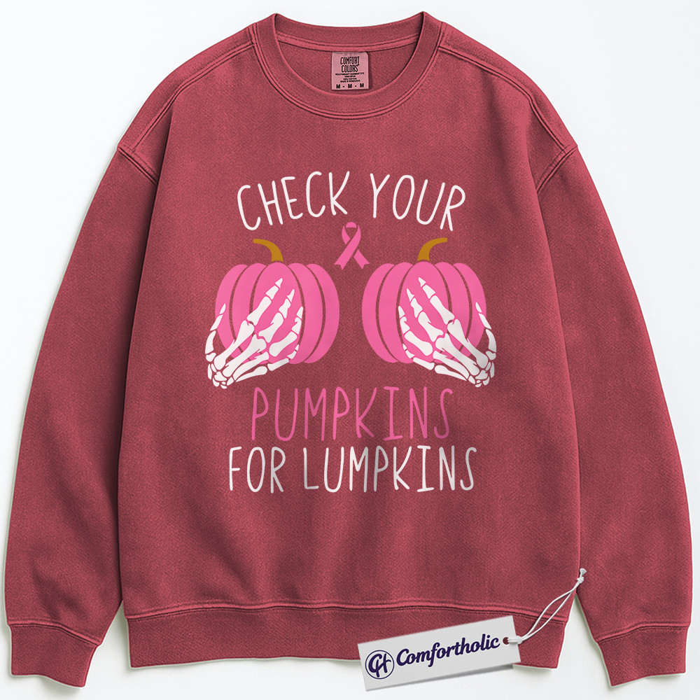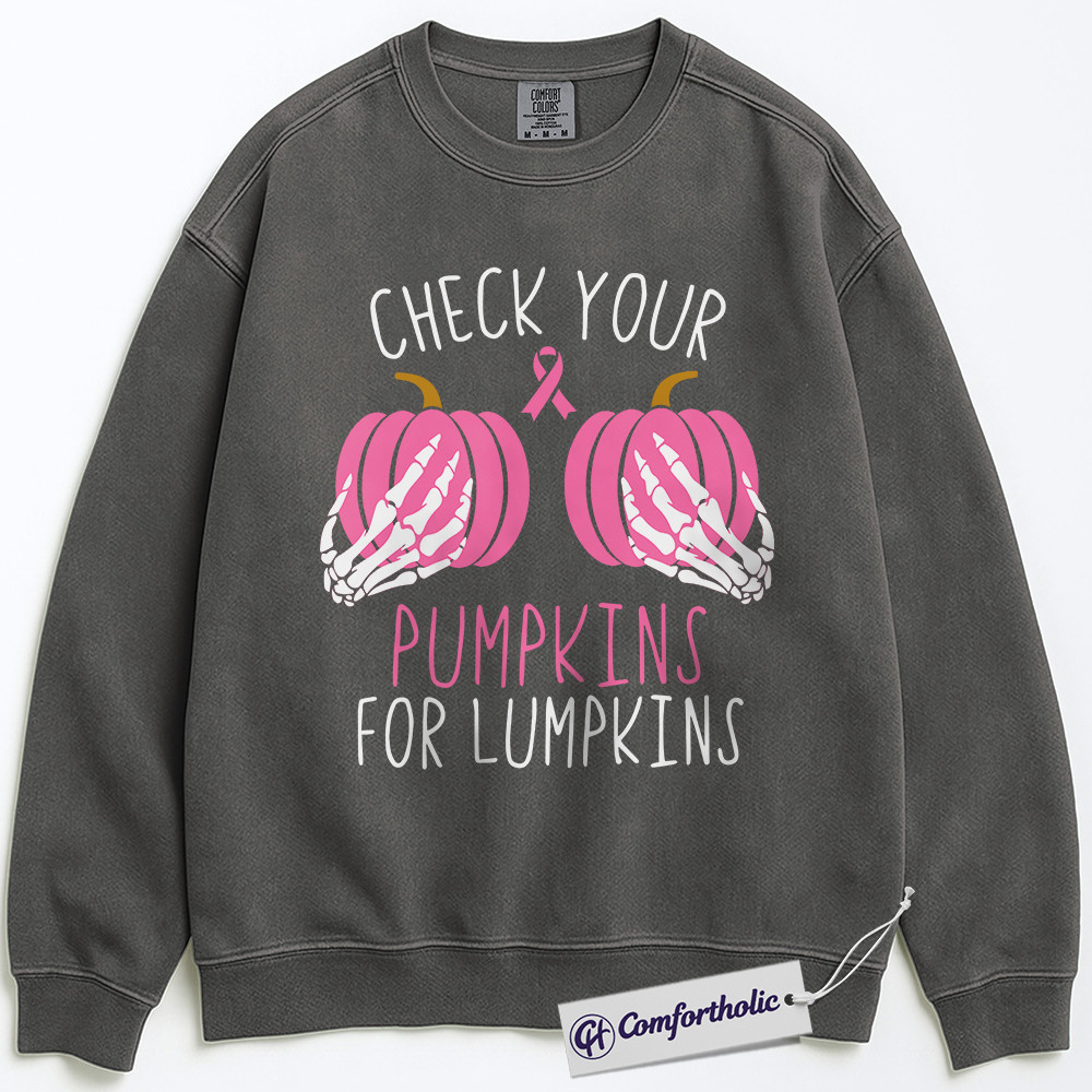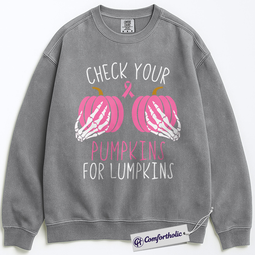 Check Your Pumpkins for Lumpkins Sweatshirt, Funny Breast Cancer Awareness Crewneck, Pink Ribbon Pullover, October Support Gift, Halloween Comfort Colors Sweatshirt
