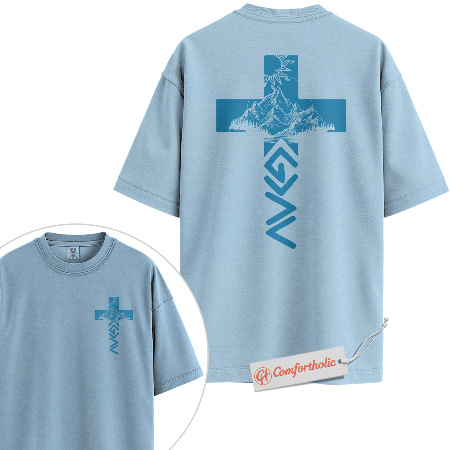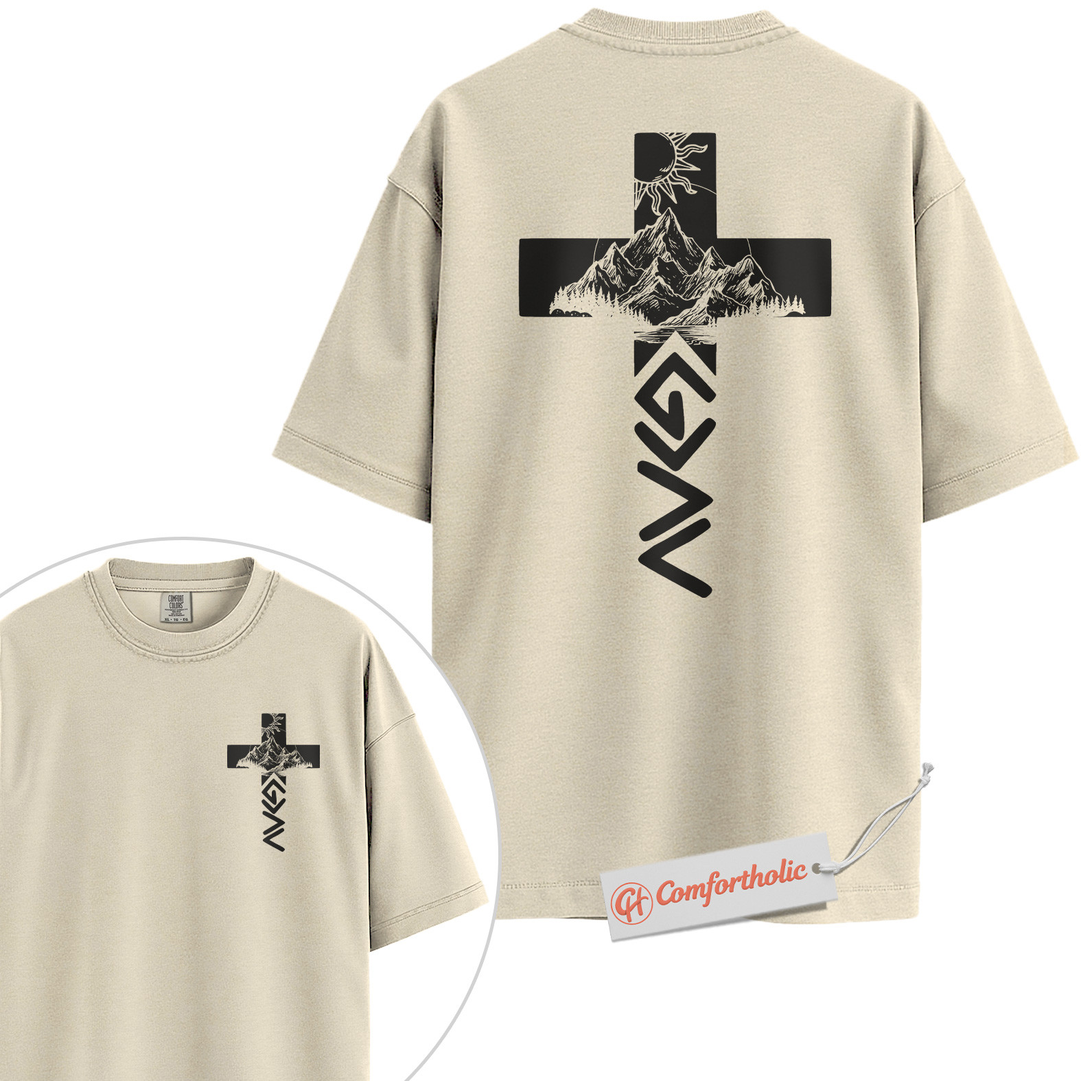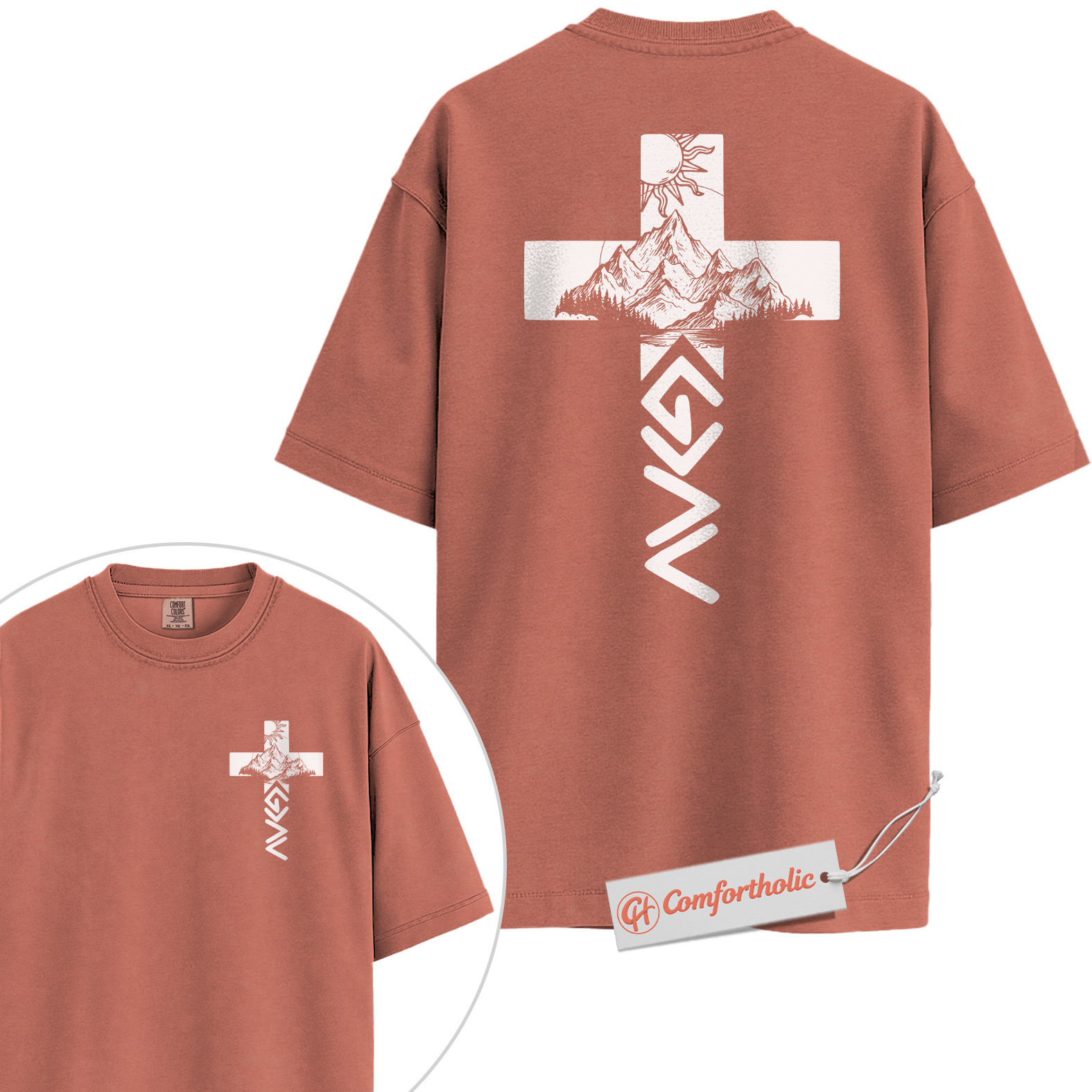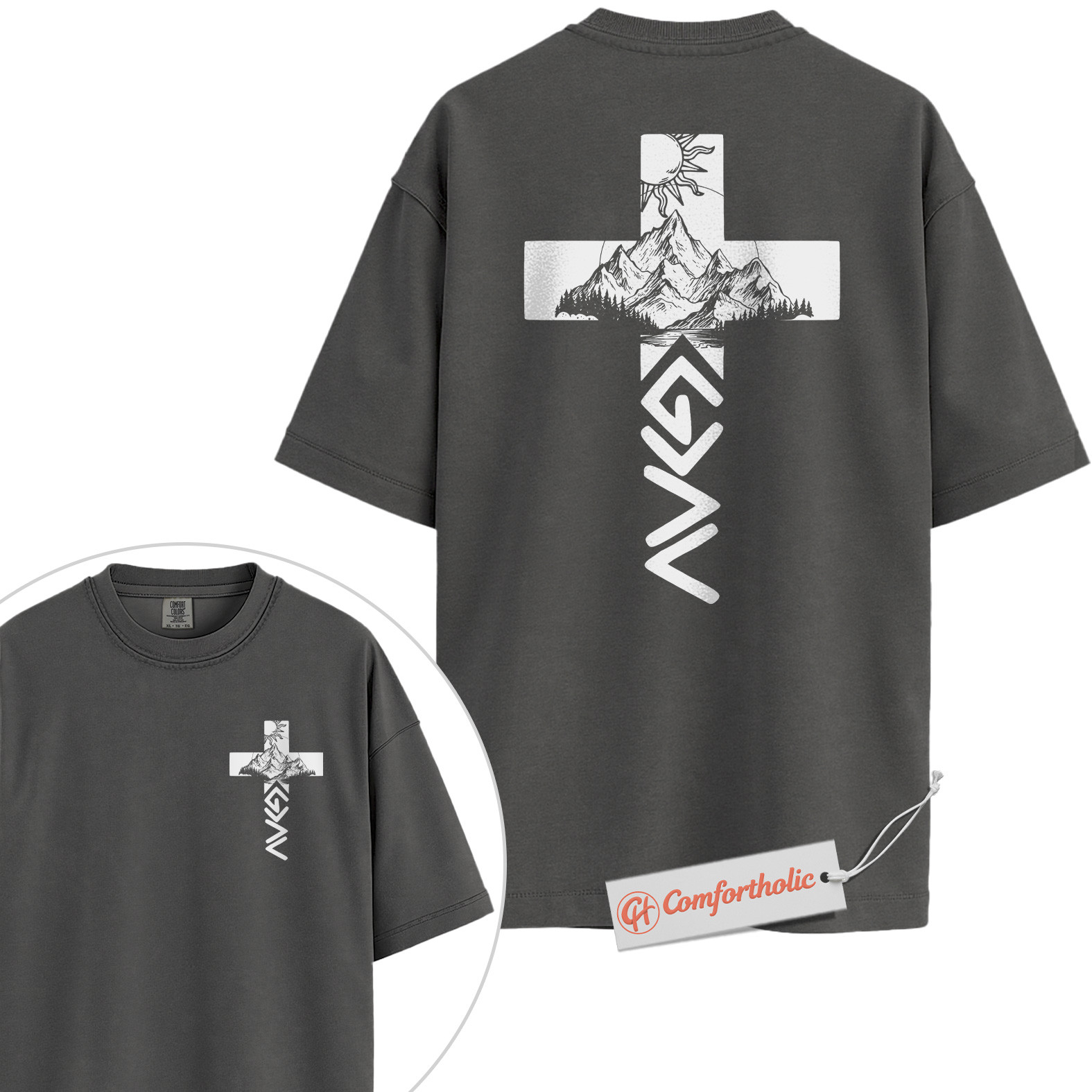 Christian Mountain Cross Shirt, Faith Graphic T-Shirt, Religious Nature Tee, Spiritual Hiking Gift, Comfort Colors Shirt 2-Sided