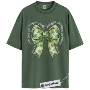 Christian Shamrock Bow Shirt, St Patrick’s Day Faith Graphic Tee, Matthew 19:26 Bible Verse T-Shirt, Irish Christian Gift for Women, Comfort Colors Shirt