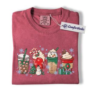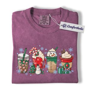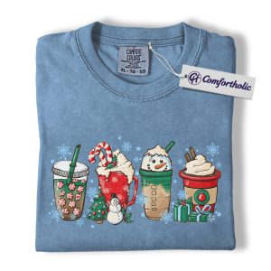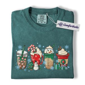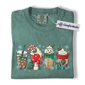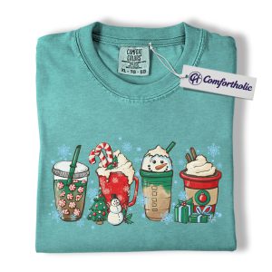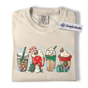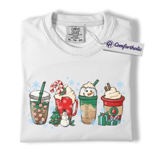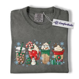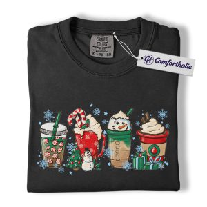 Christmas Coffee Drinks Shirt, Cute Holiday Latte and Cocoa T-Shirt, Festive Snowman and Peppermint Mocha Graphic Tee, Gift for Coffee Lovers, Christmas Comfort Colors Shirt