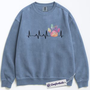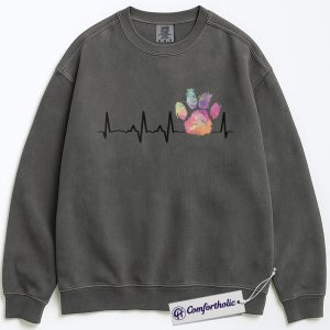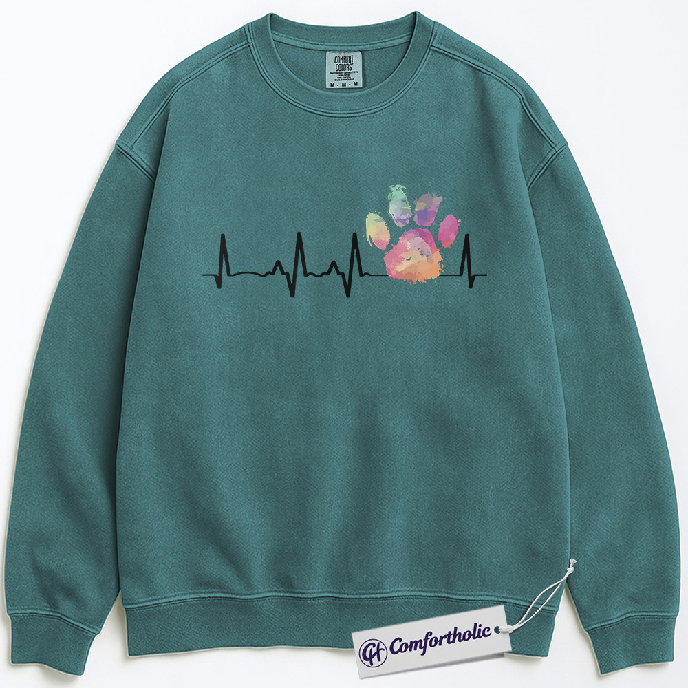 Colorful Paw Print Heartbeat Sweatshirt, Funny Vet Tech Pullover, Dog Cat Lover Graphic Crewneck, Rainbow Animal Rescue Gift, Comfort Colors Sweatshirt