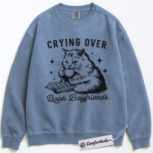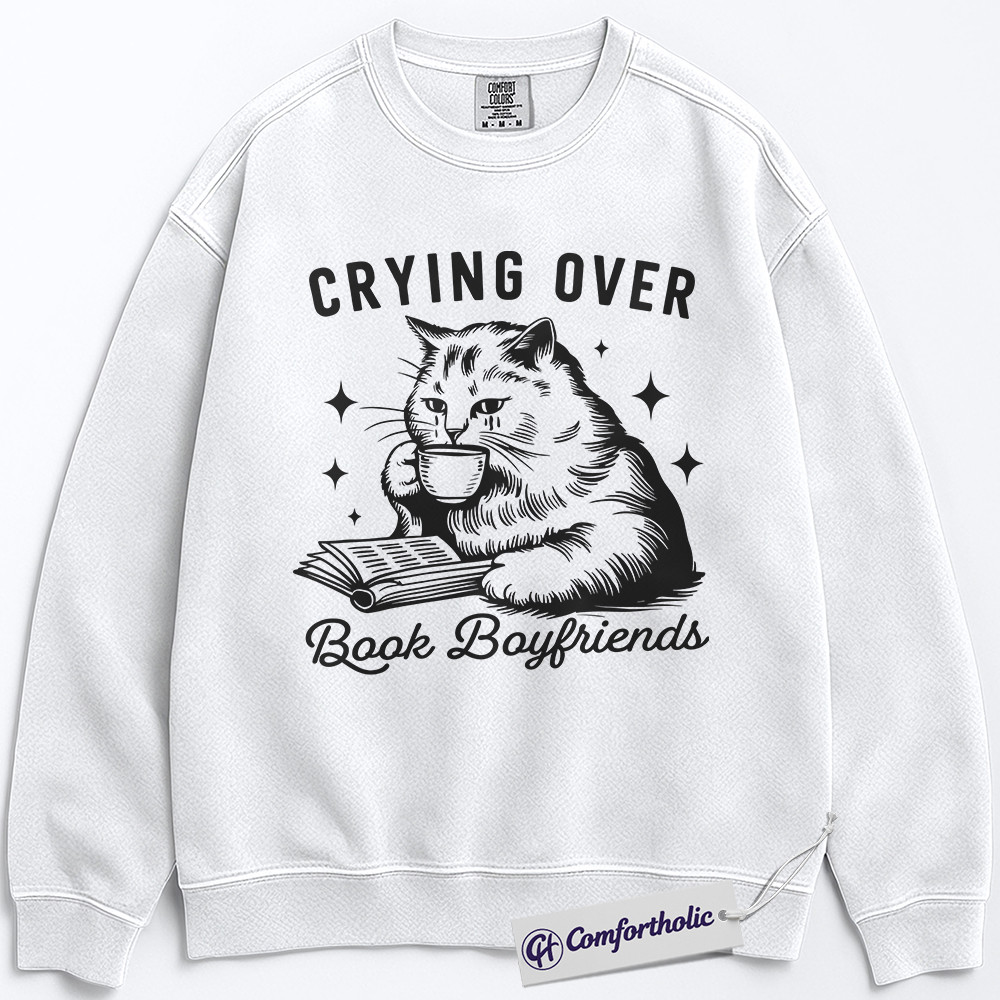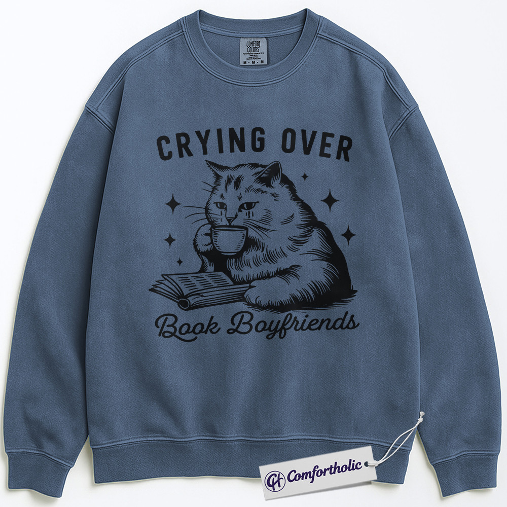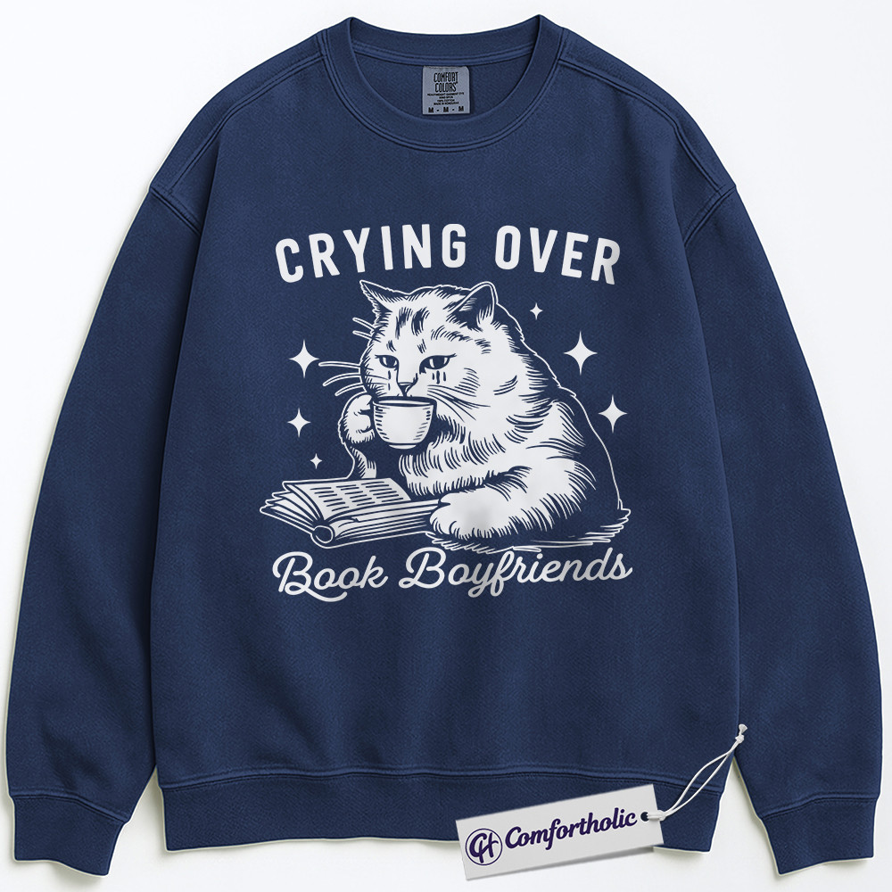 Crying Over Book Boyfriends Sweatshirt, Book Lover Graphic Pullover, Cat Lover Crewneck Sweatshirt, Funny Romance Reader Gift, Bookish Comfort Colors Sweatshirt