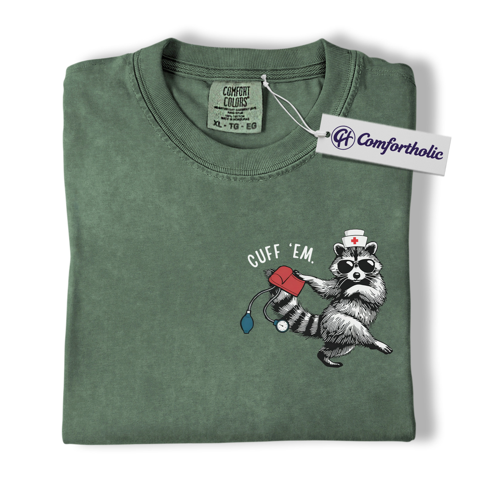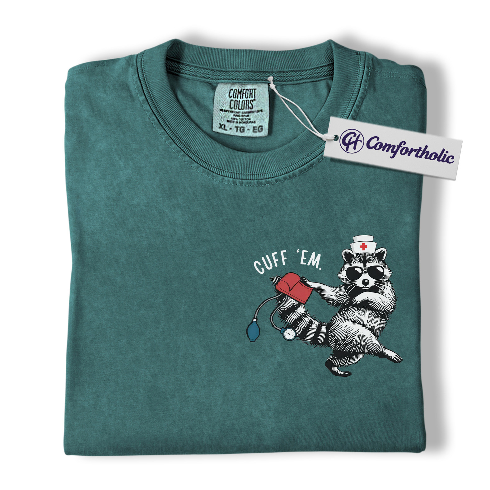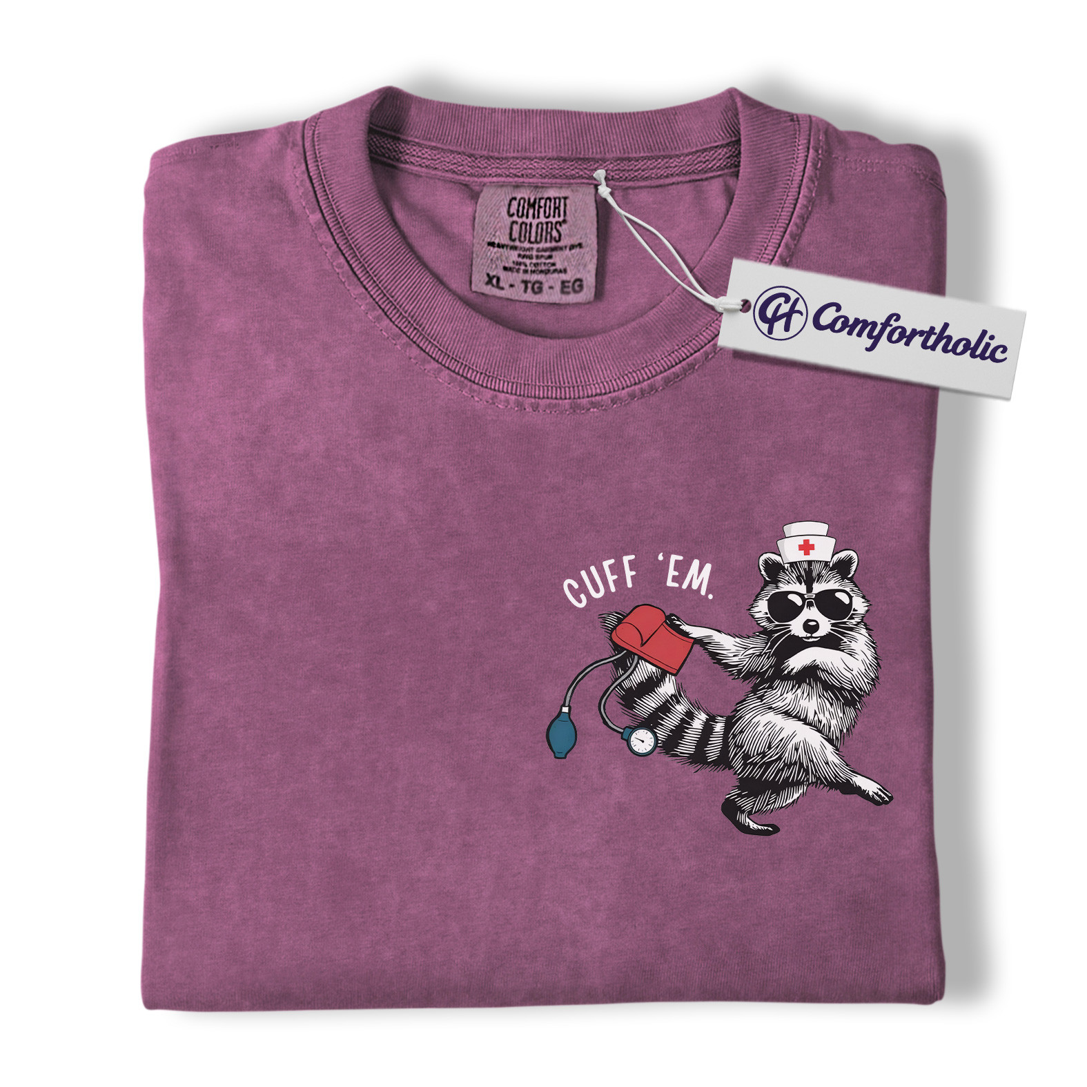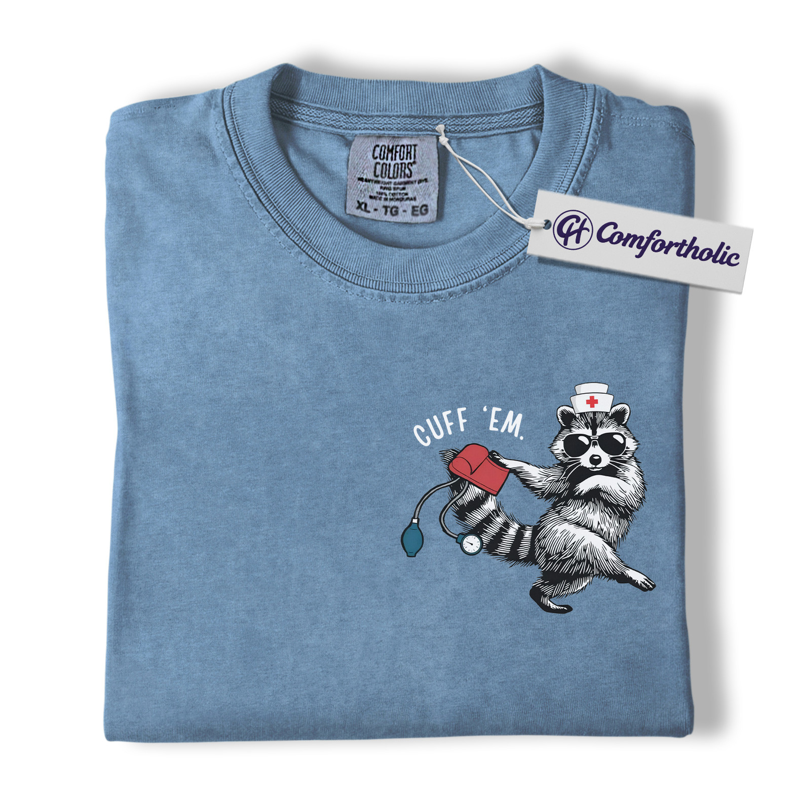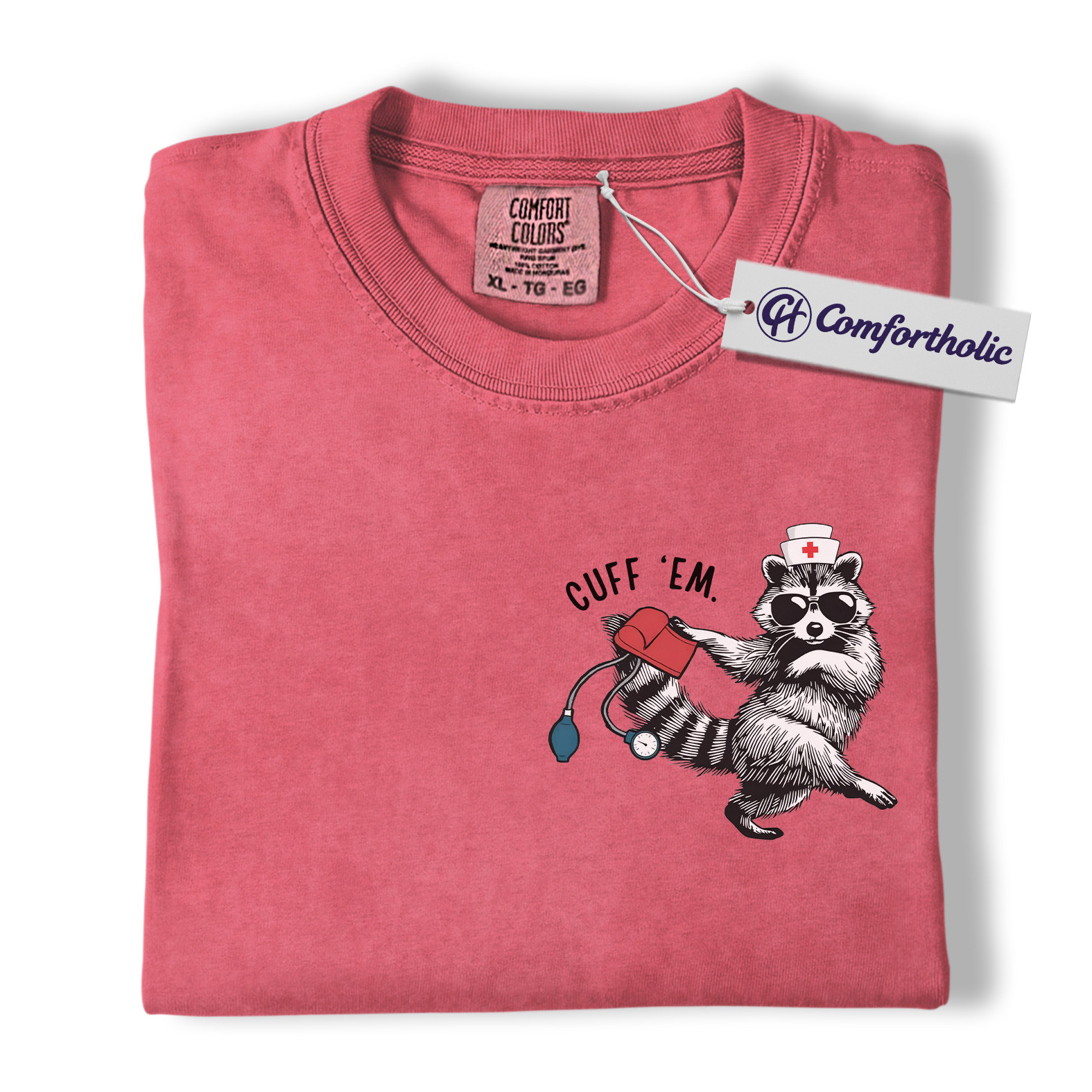 Cuff ’Em Raccoon Nurse Shirt, Funny Medical Worker T-Shirt, Cute Healthcare Animal Graphic Tee, Nurse Appreciation Gift, Comfort Colors Shirt