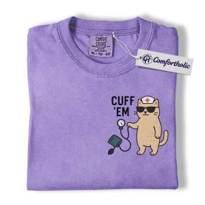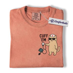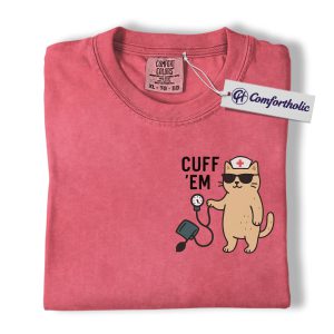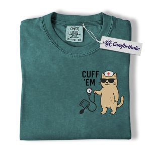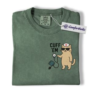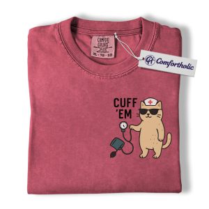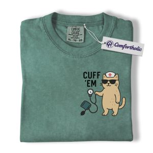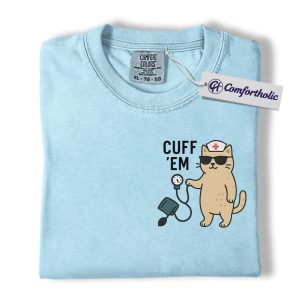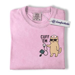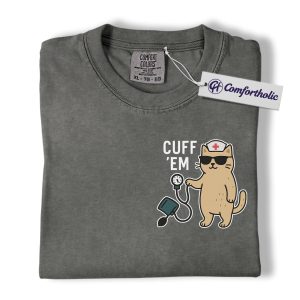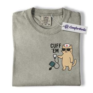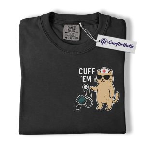 Cuff ’Em Shirt, Funny Nurse Cat T-Shirt, Cute Medical Worker Graphic Tee, Gift for Nurses, Comfort Colors Shirt