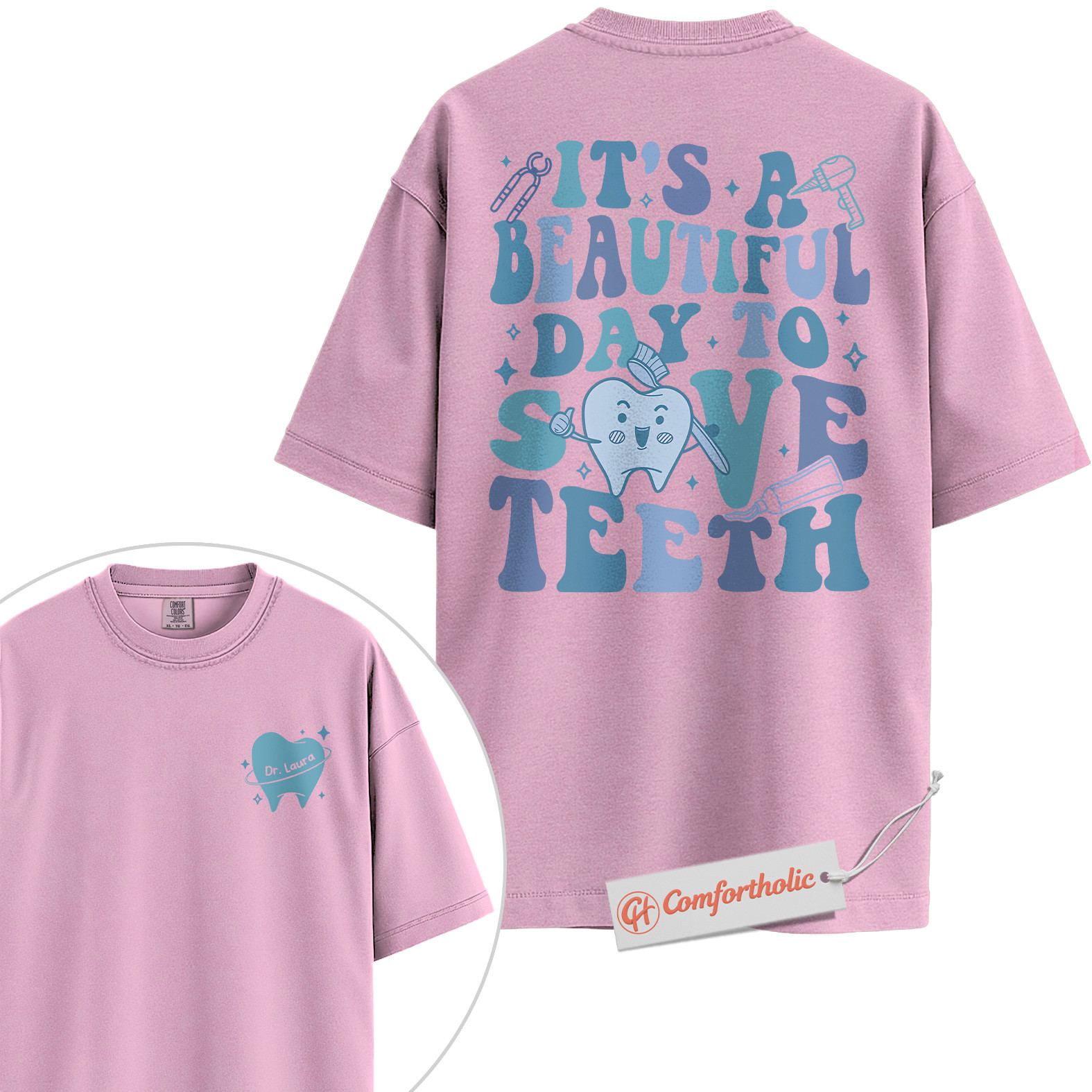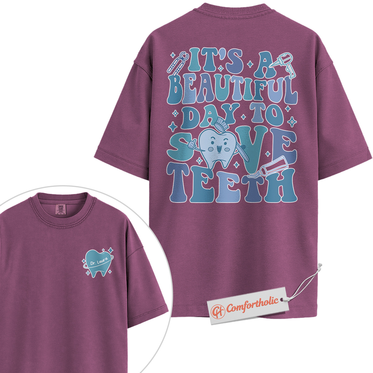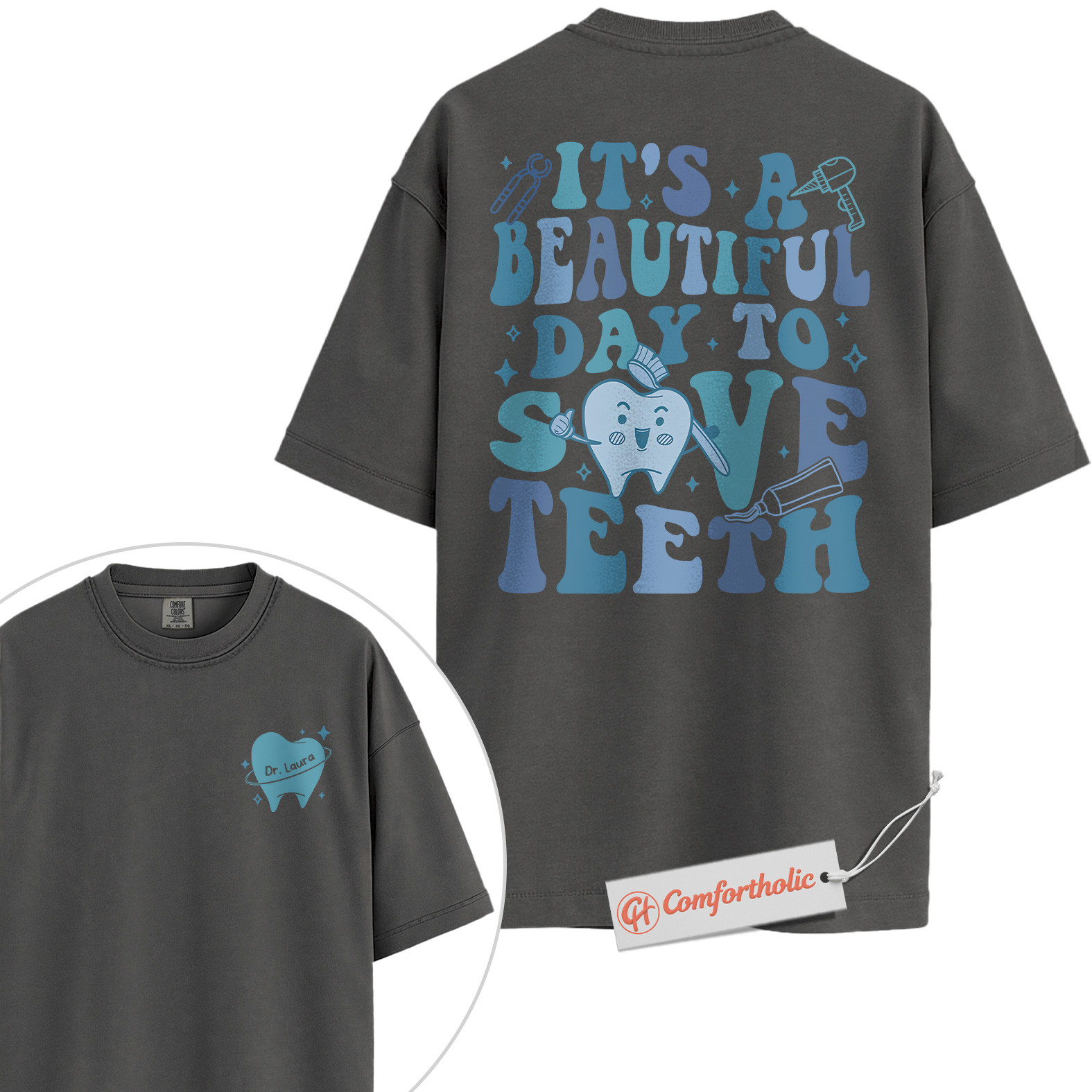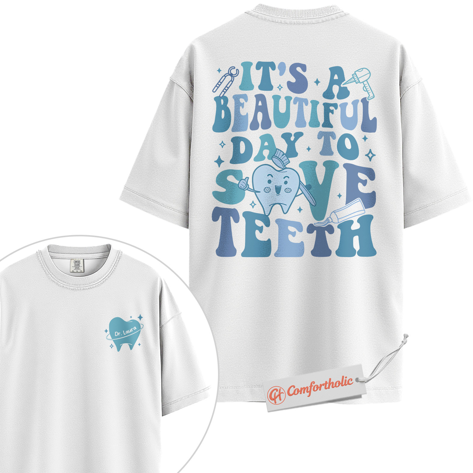 Custom Dentist Shirt, It’s a Beautiful Day to Save Teeth T-Shirt, Cute Tooth Graphic Tee, Personalized Gift for Dental Hygienists, Dental Comfort Colors Shirt 2-Sided