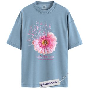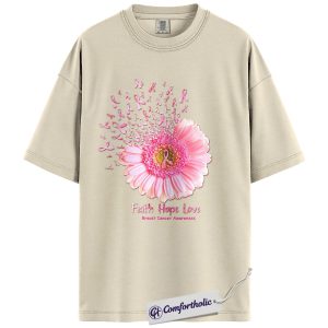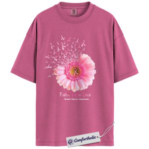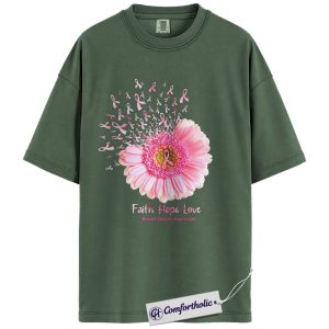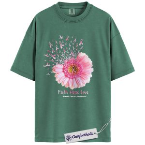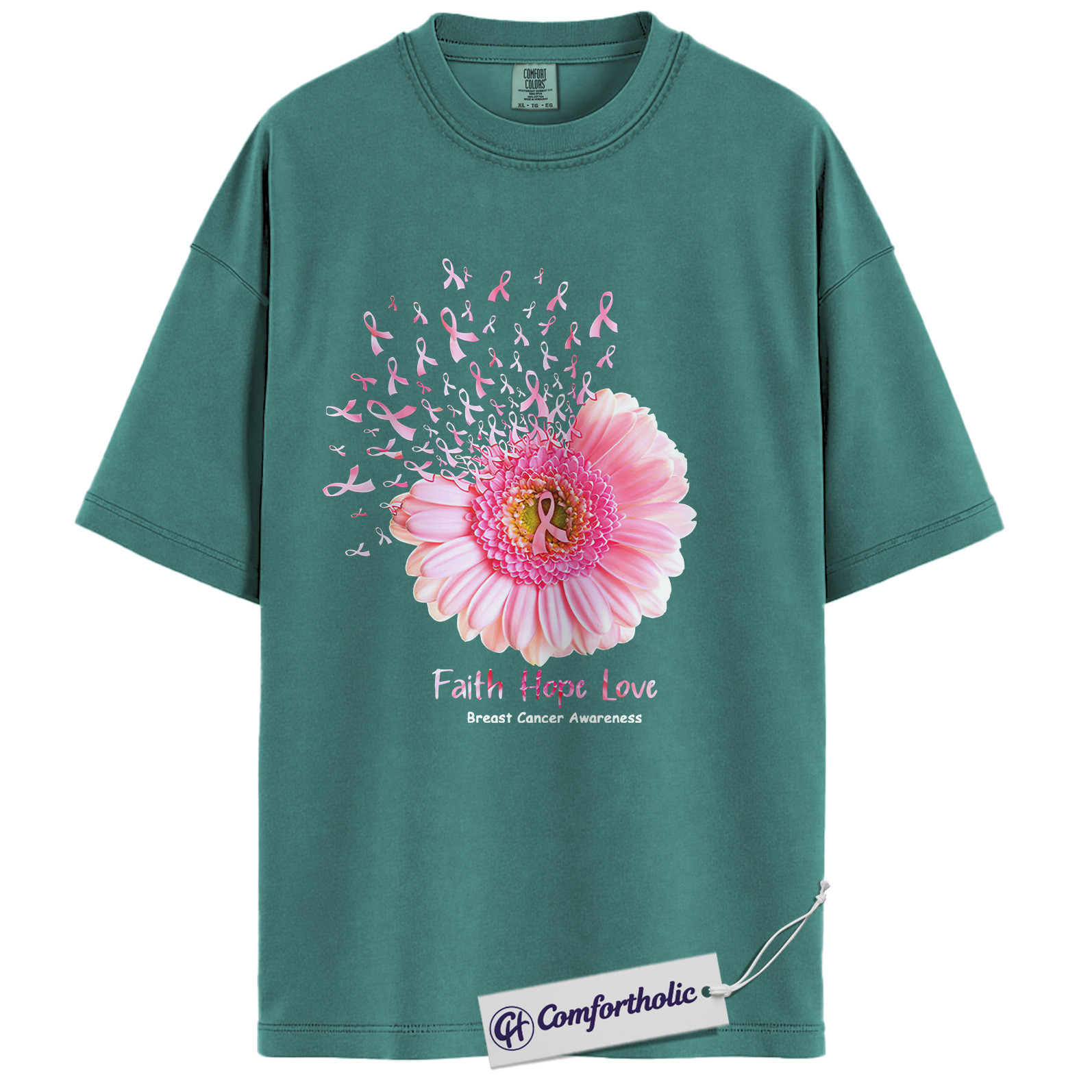 Faith Hope Love Shirt, Pink Flower Ribbon Breast Cancer Awareness T-Shirt, Inspirational Floral Graphic Tee, Support Gift for Women, Comfort Colors Shirt