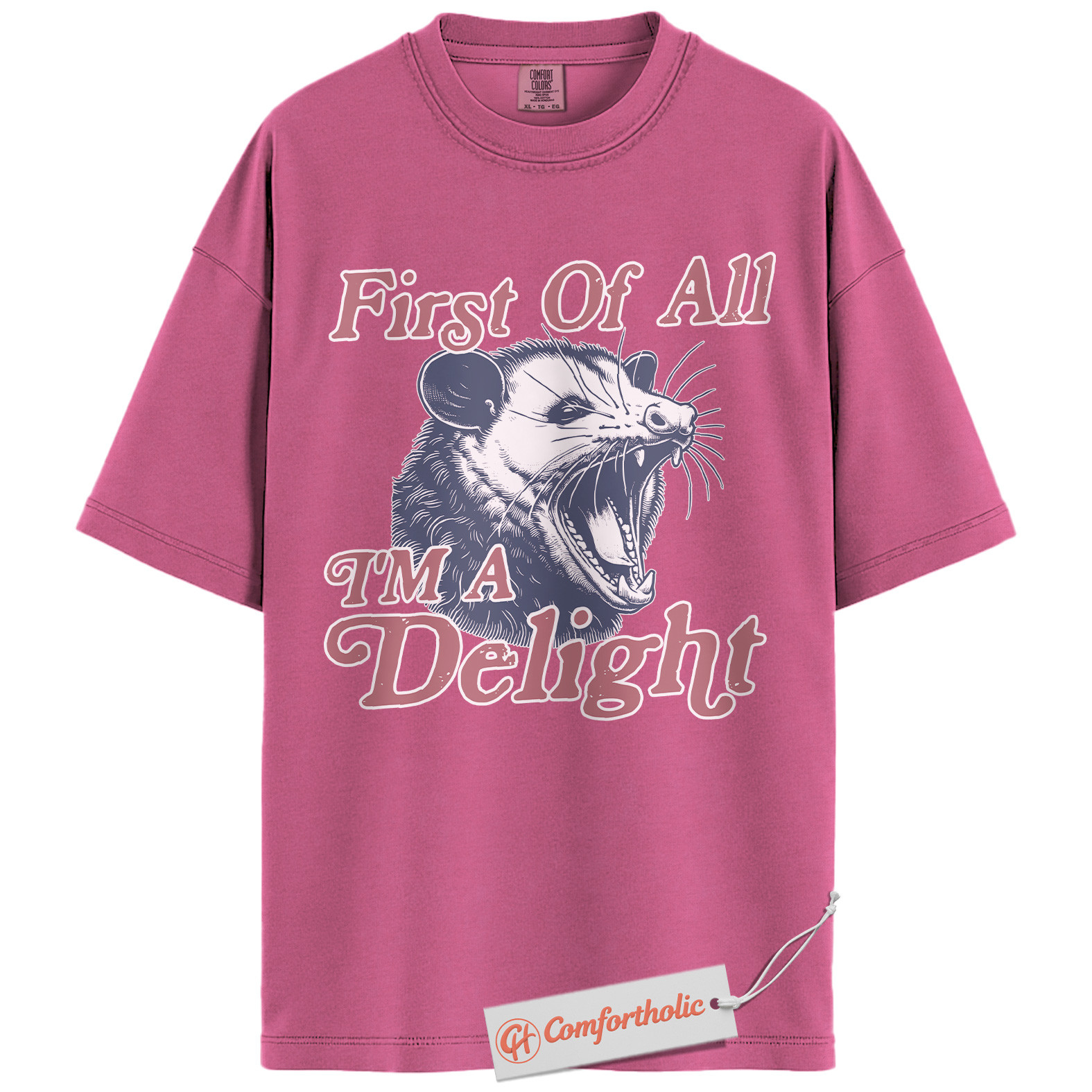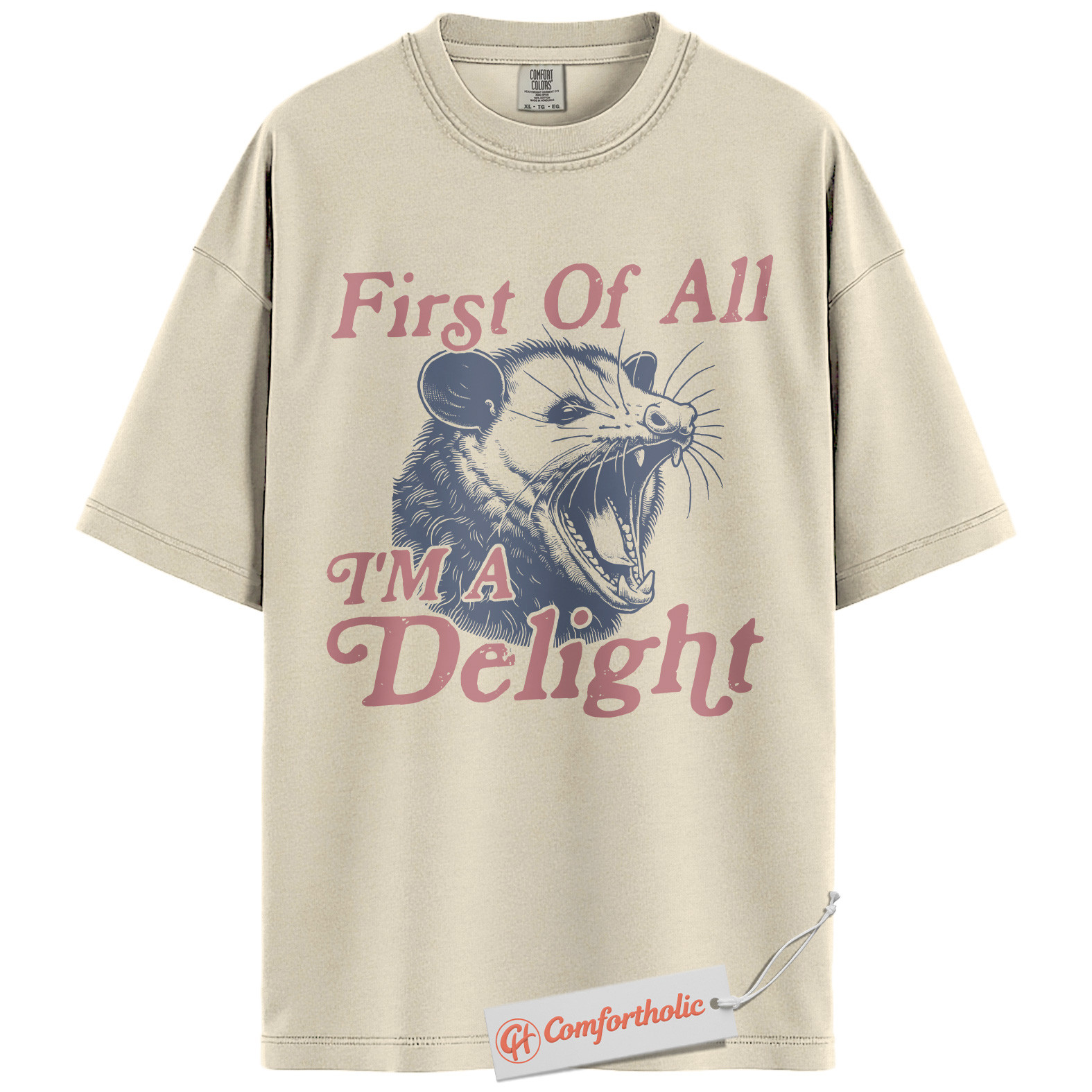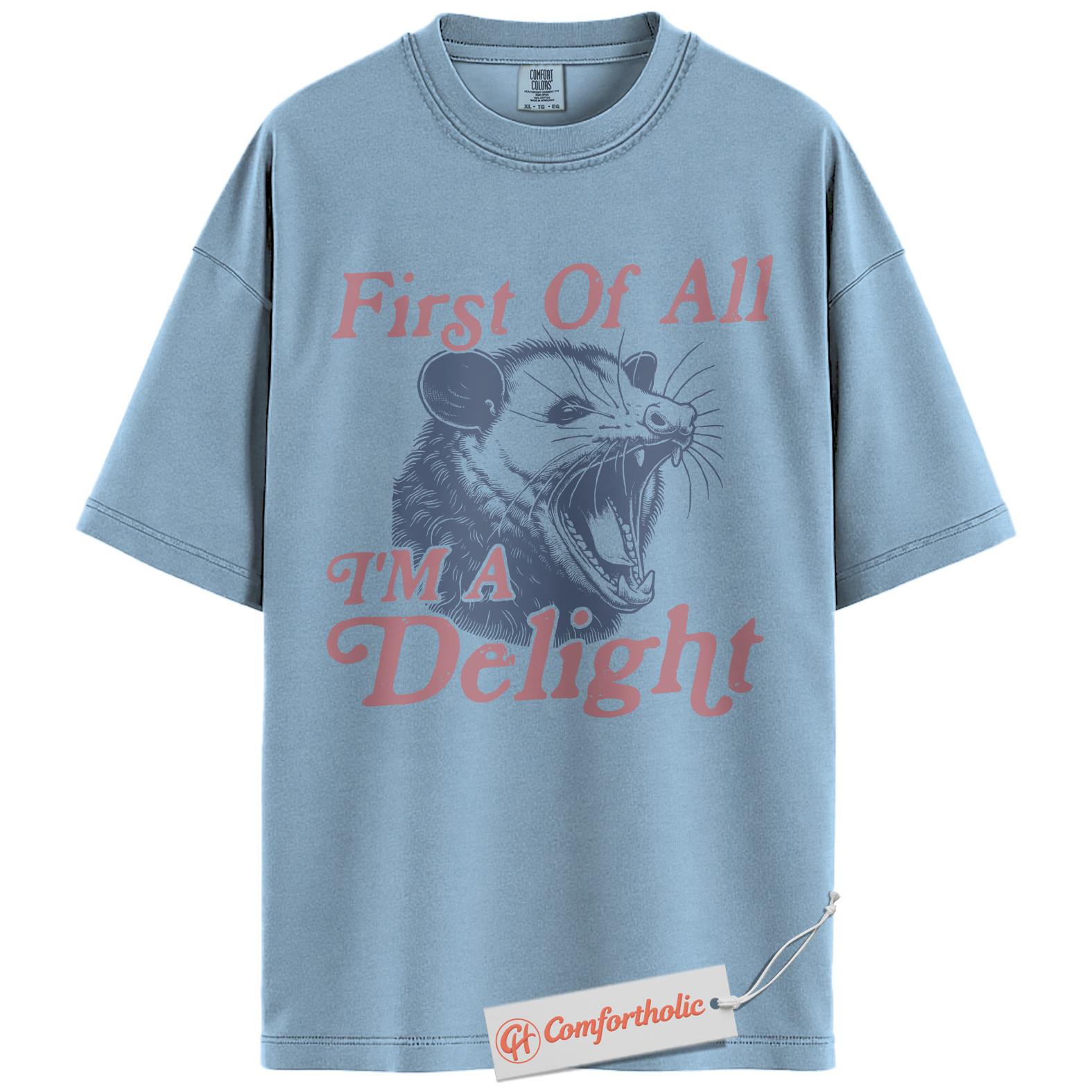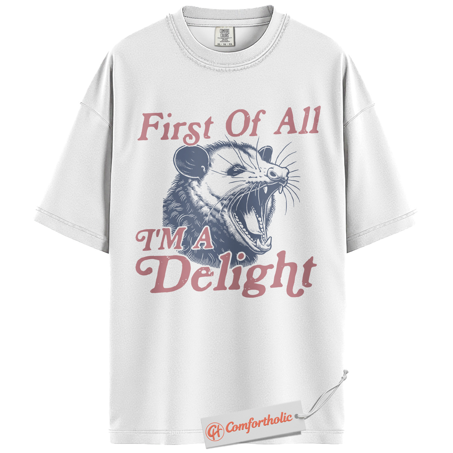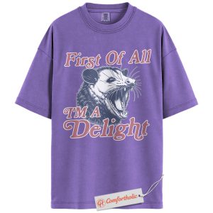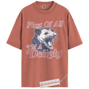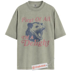 First of All I’m a Delight Shirt, Funny Opossum T-Shirt, Sarcastic Animal Graphic Tee, Humorous Gift for Wildlife Lovers, Animal Comfort Colors Shirt