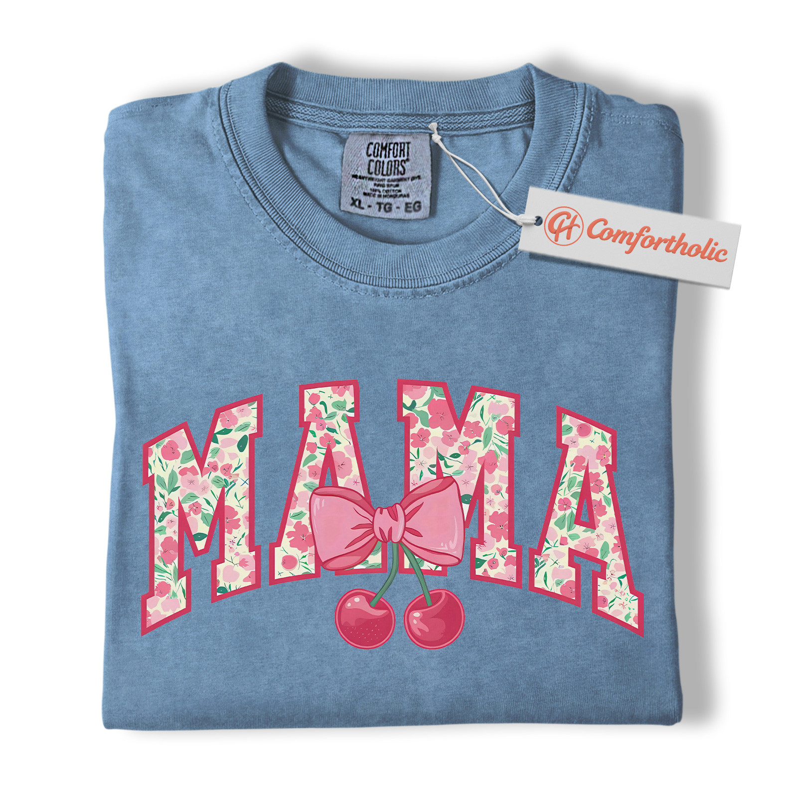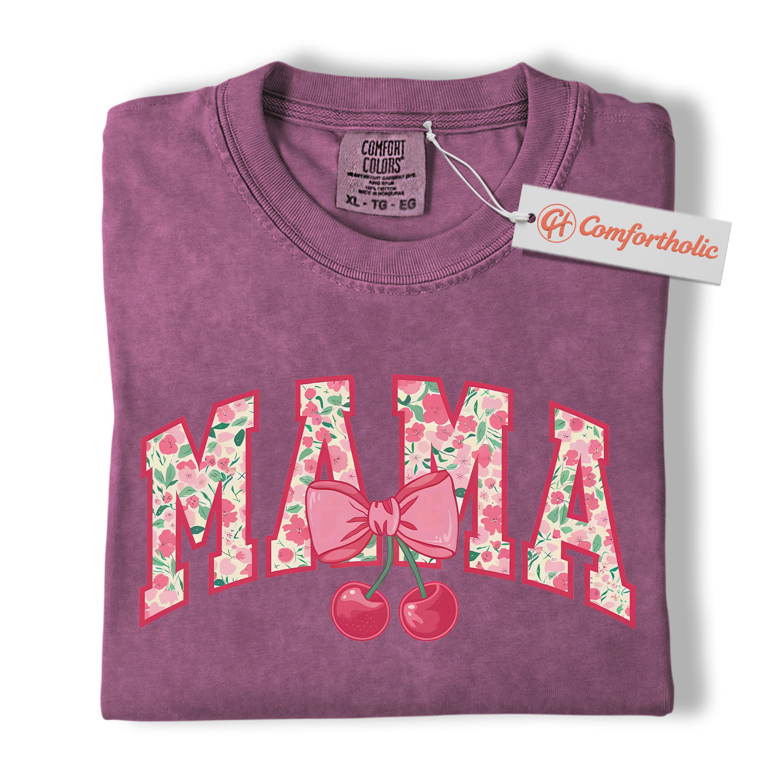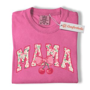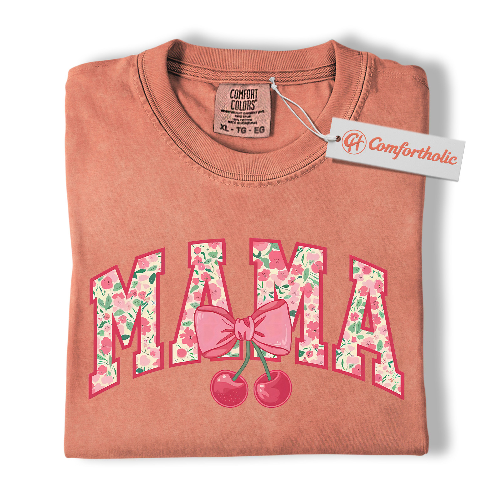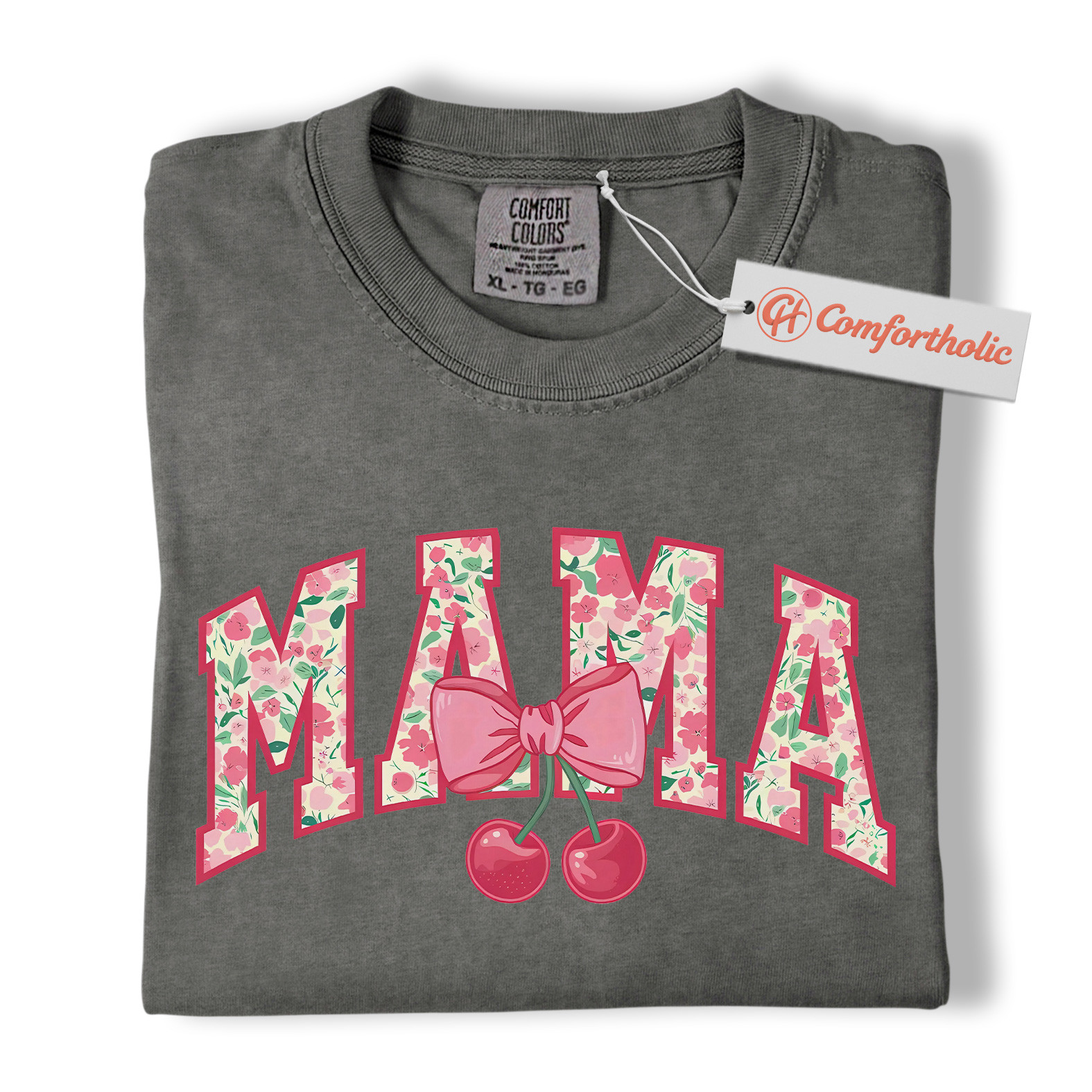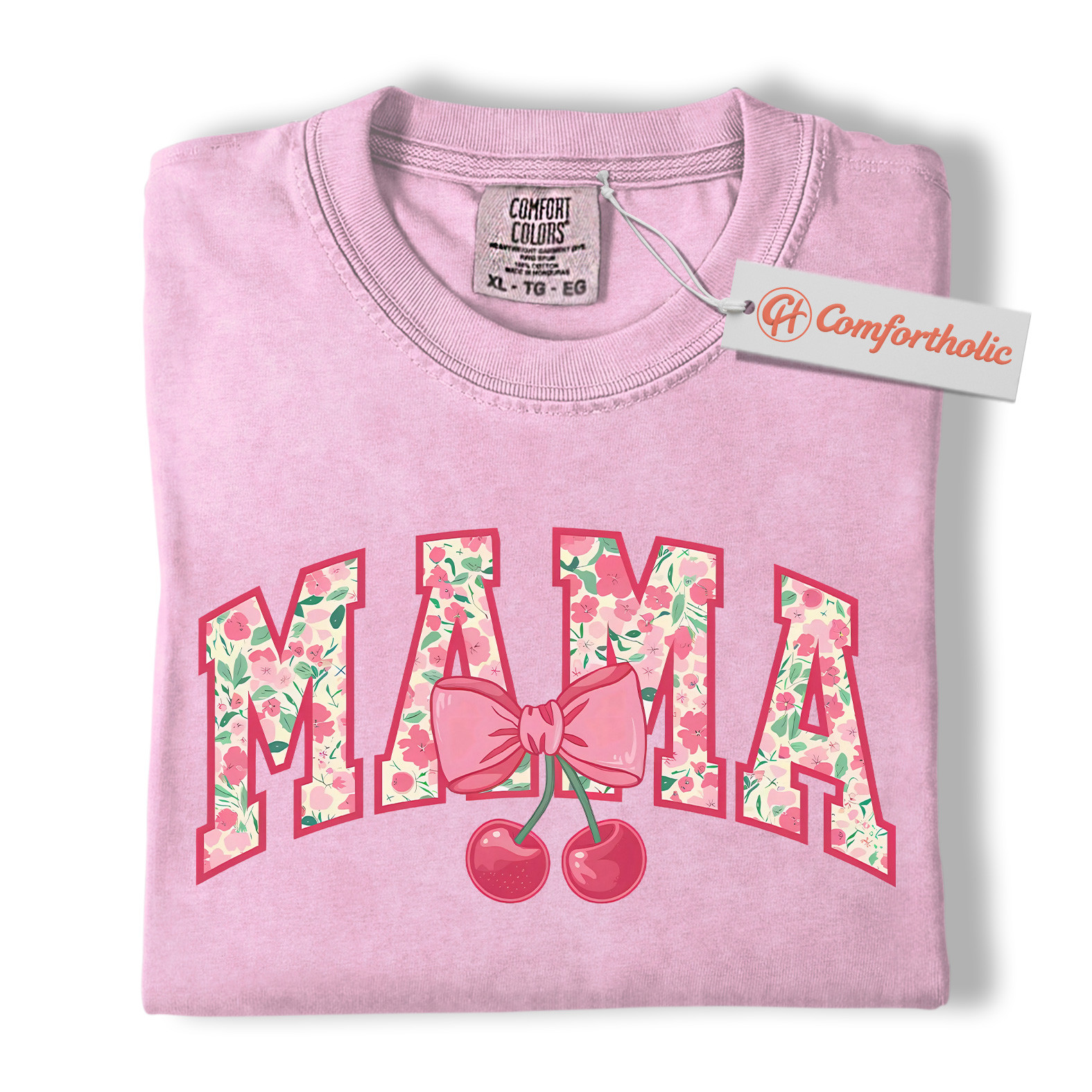 Floral Mama Shirt, Pink Cherry Bow Mom Shirt, Cute Mother’s Day Shirt, Gift for Trendy Moms, Comfort Colors Shirt