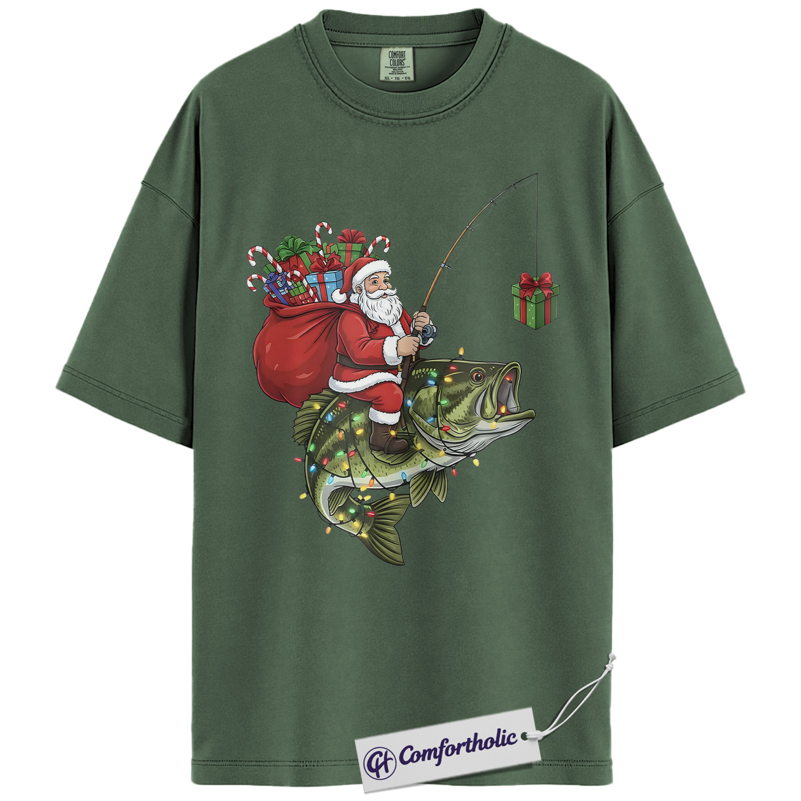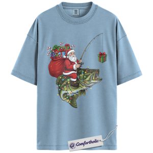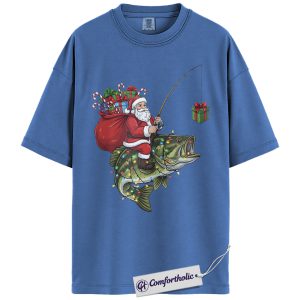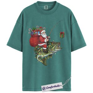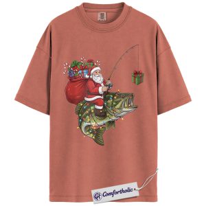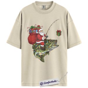 Funny Fishing Christmas Shirt, Santa Claus Riding Bass T-Shirt, Fisherman Holiday Graphic Tee, Funny Gift for Dads & Outdoor Lovers, Christmas Comfort Colors Shirt
