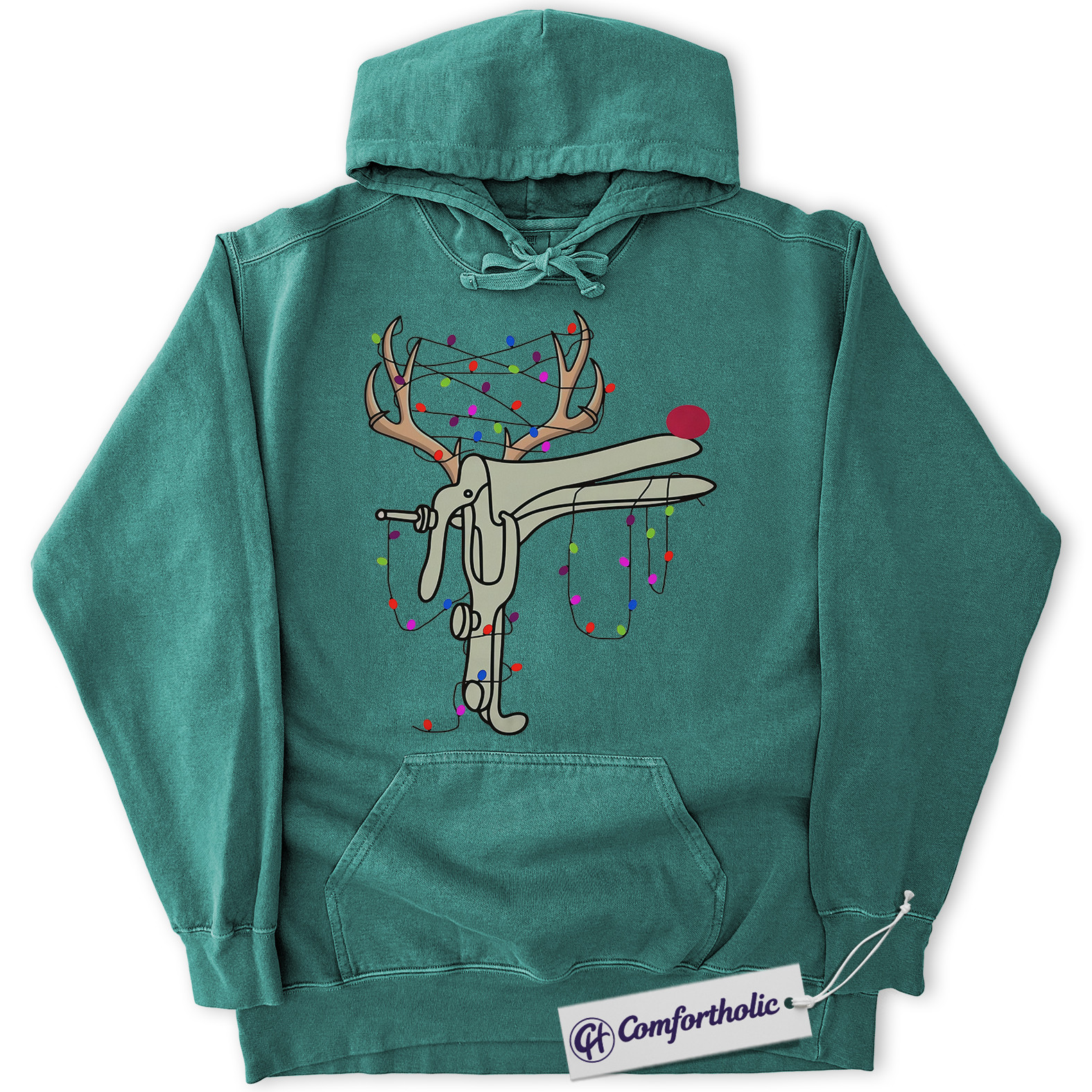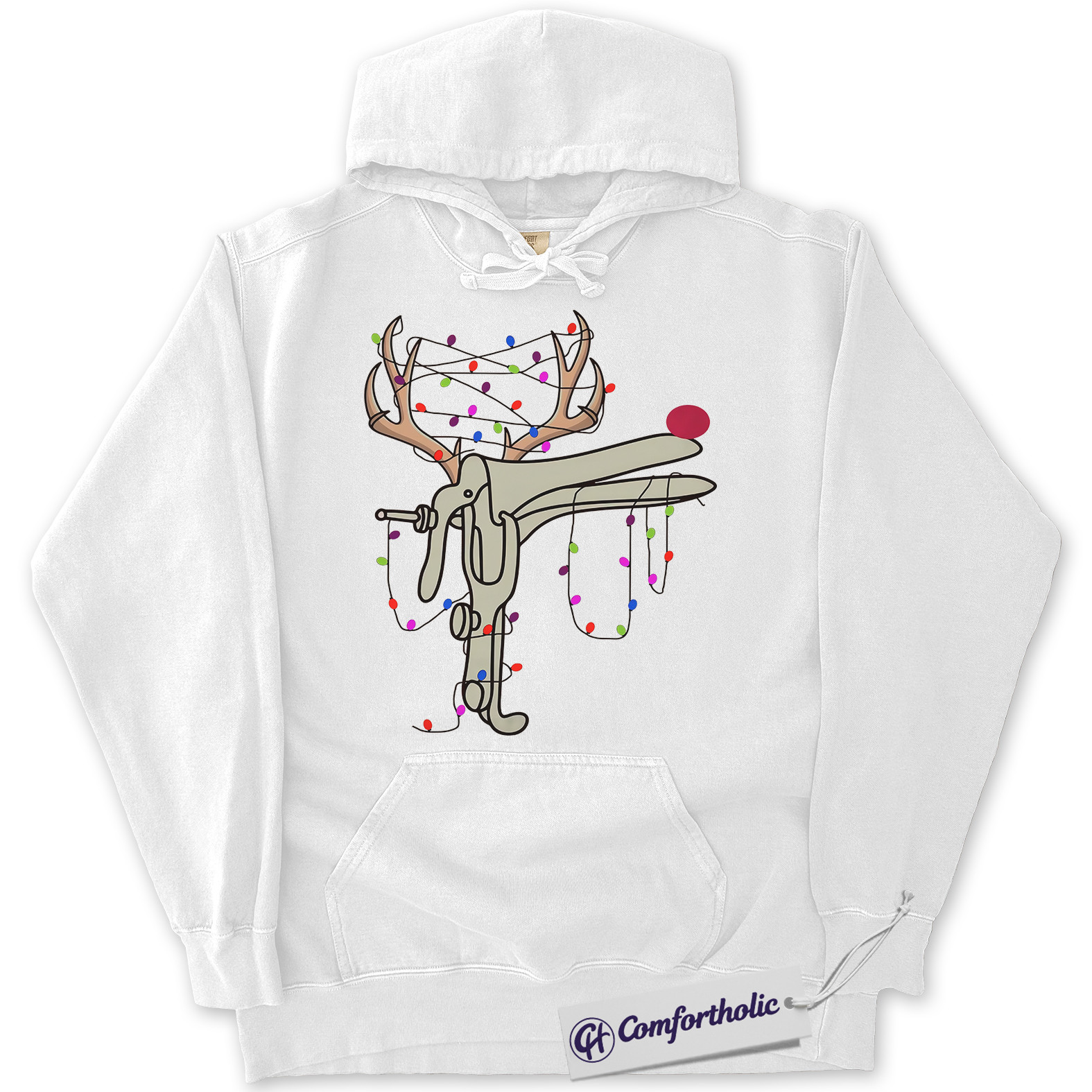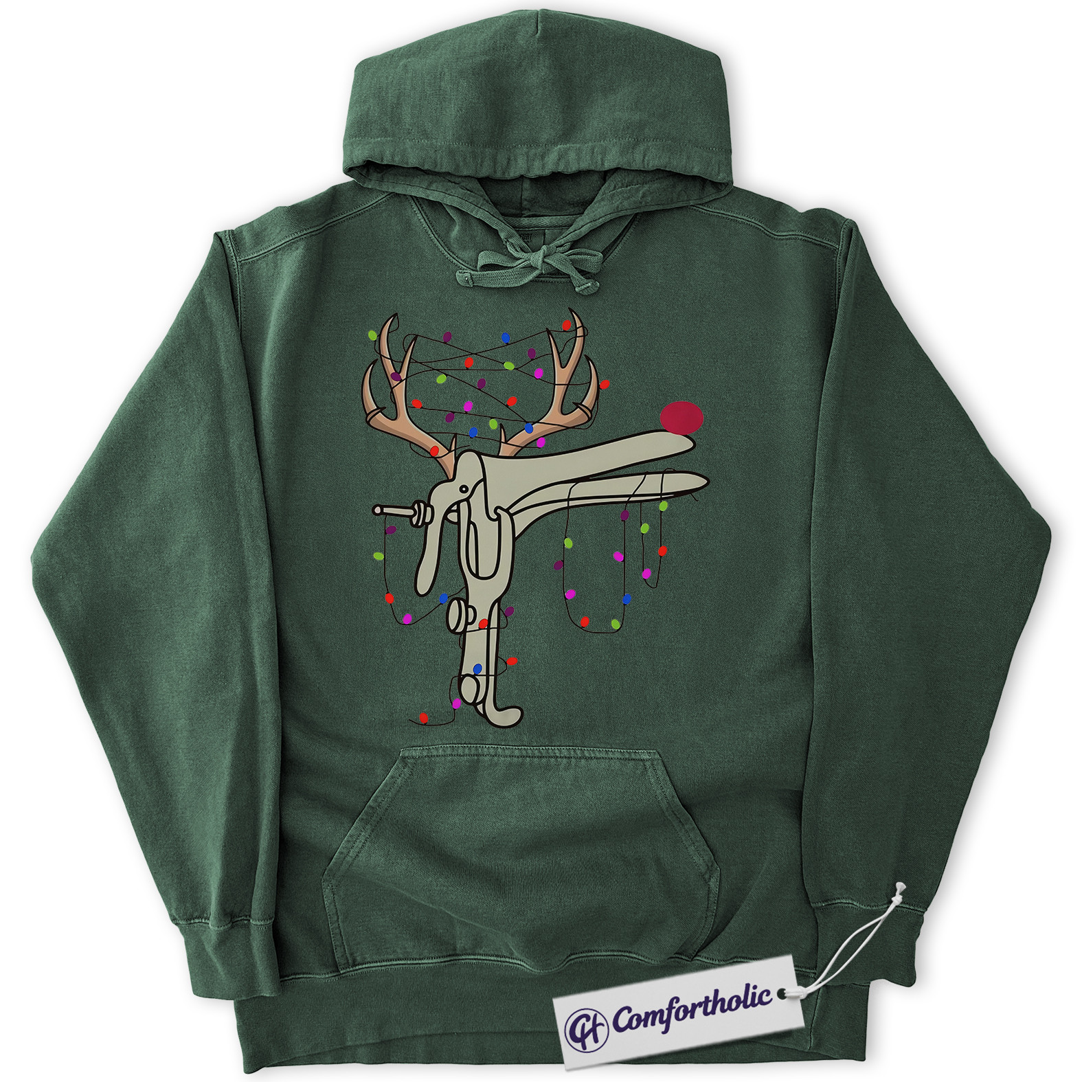 Funny Speculum Reindeer Christmas Hoodie, Medical Humor Holiday Hoodie, Rudolph Doctor Gift Graphic Pullover for Nurses & Healthcare Workers, Christmas Comfort Colors Hoodie