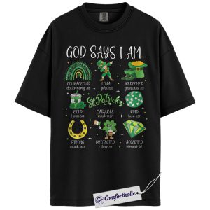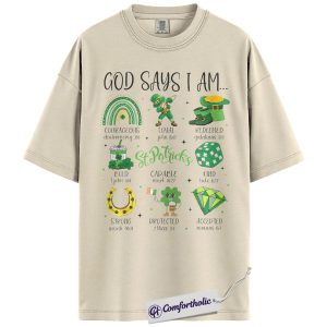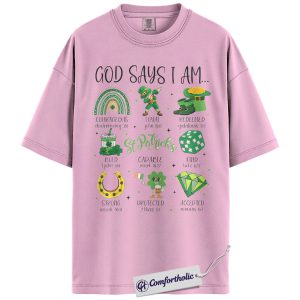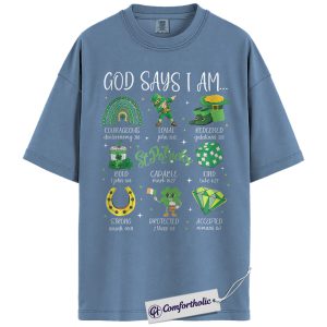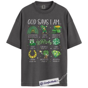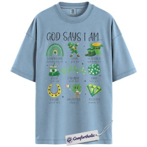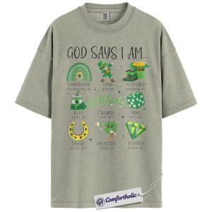 God Says I Am Shirt, St Patricks Day Christian Graphic Tee, Bible Verse Faith T-Shirt, Gift for Church Women & Christian Moms, Comfort Colors Shirt