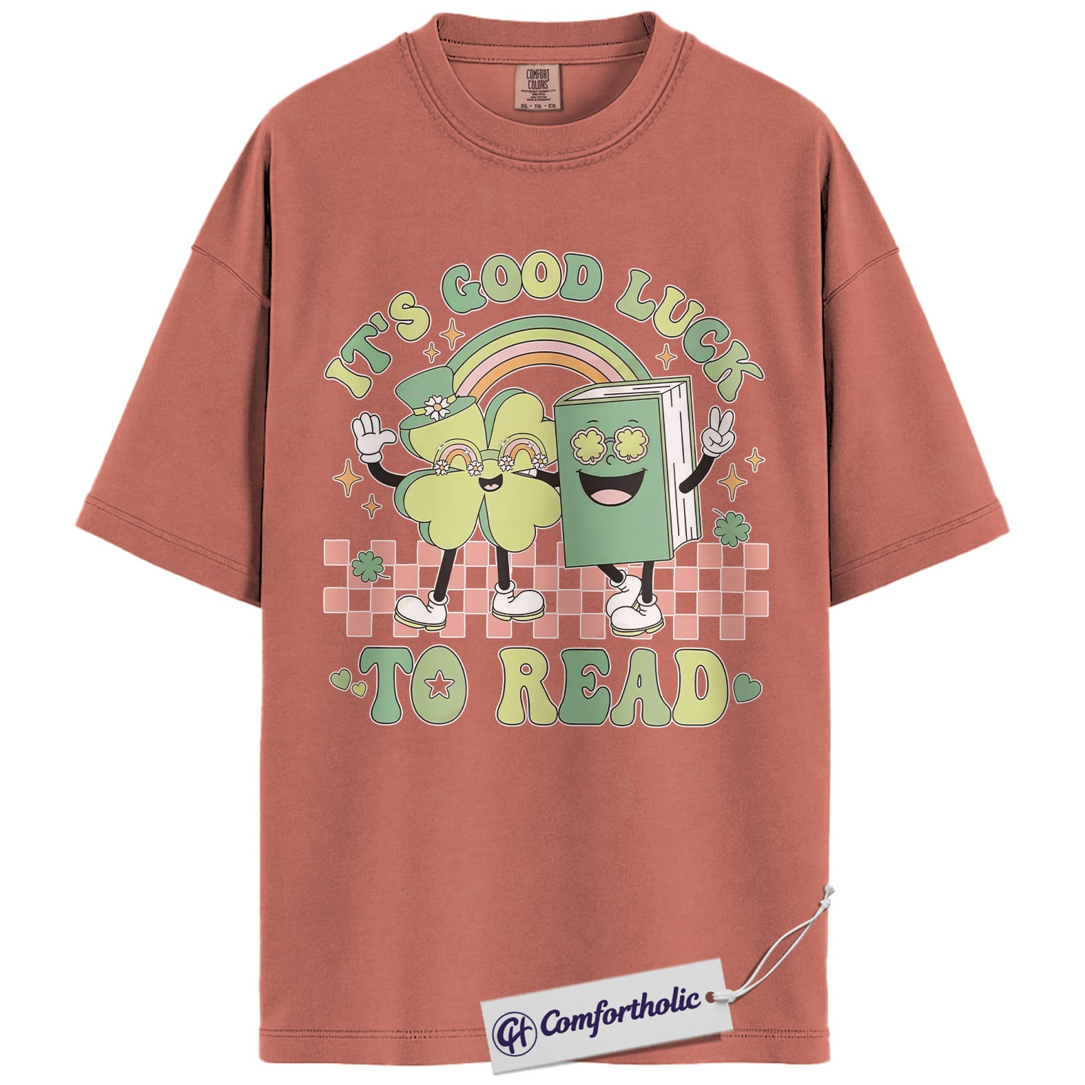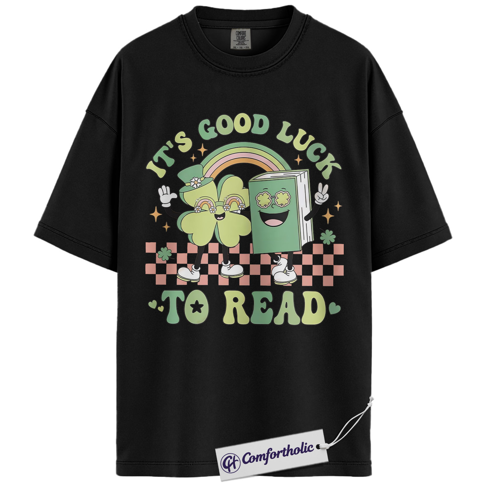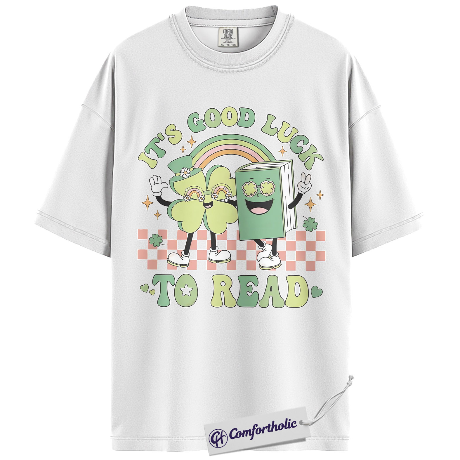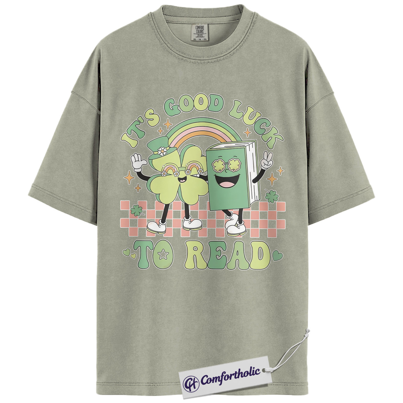 Good Luck To Read Shirt, St Patrick’s Day Shamrock Book Graphic Tee, Librarian Teacher Reading T-Shirt, St Paddy’s Day Gift for Book Lovers, Comfort Colors Shirt