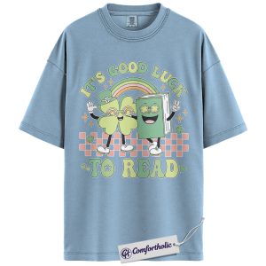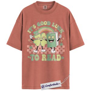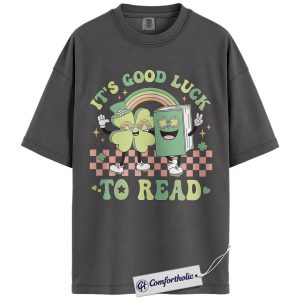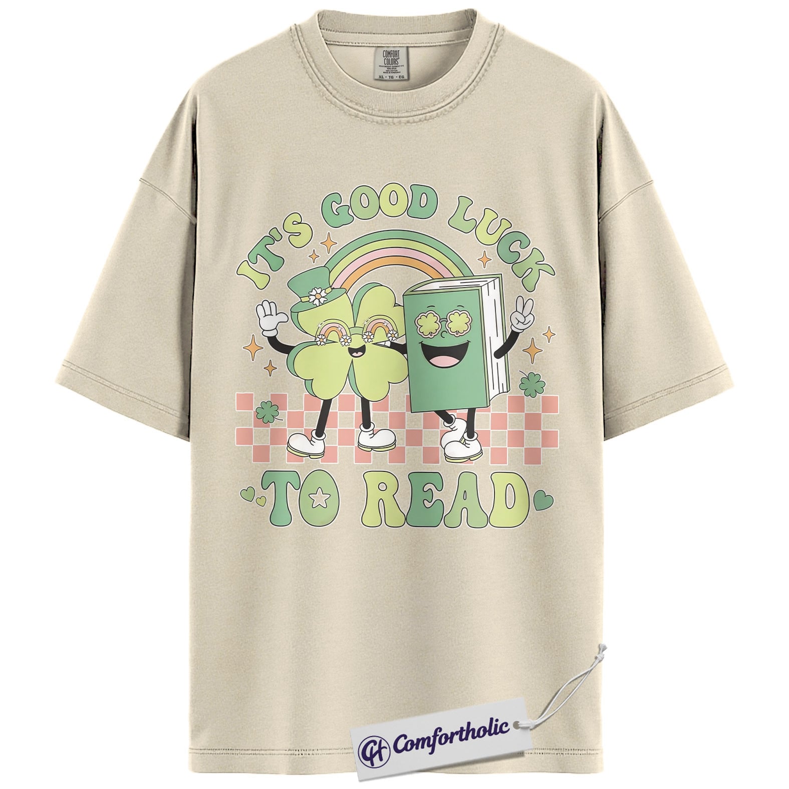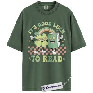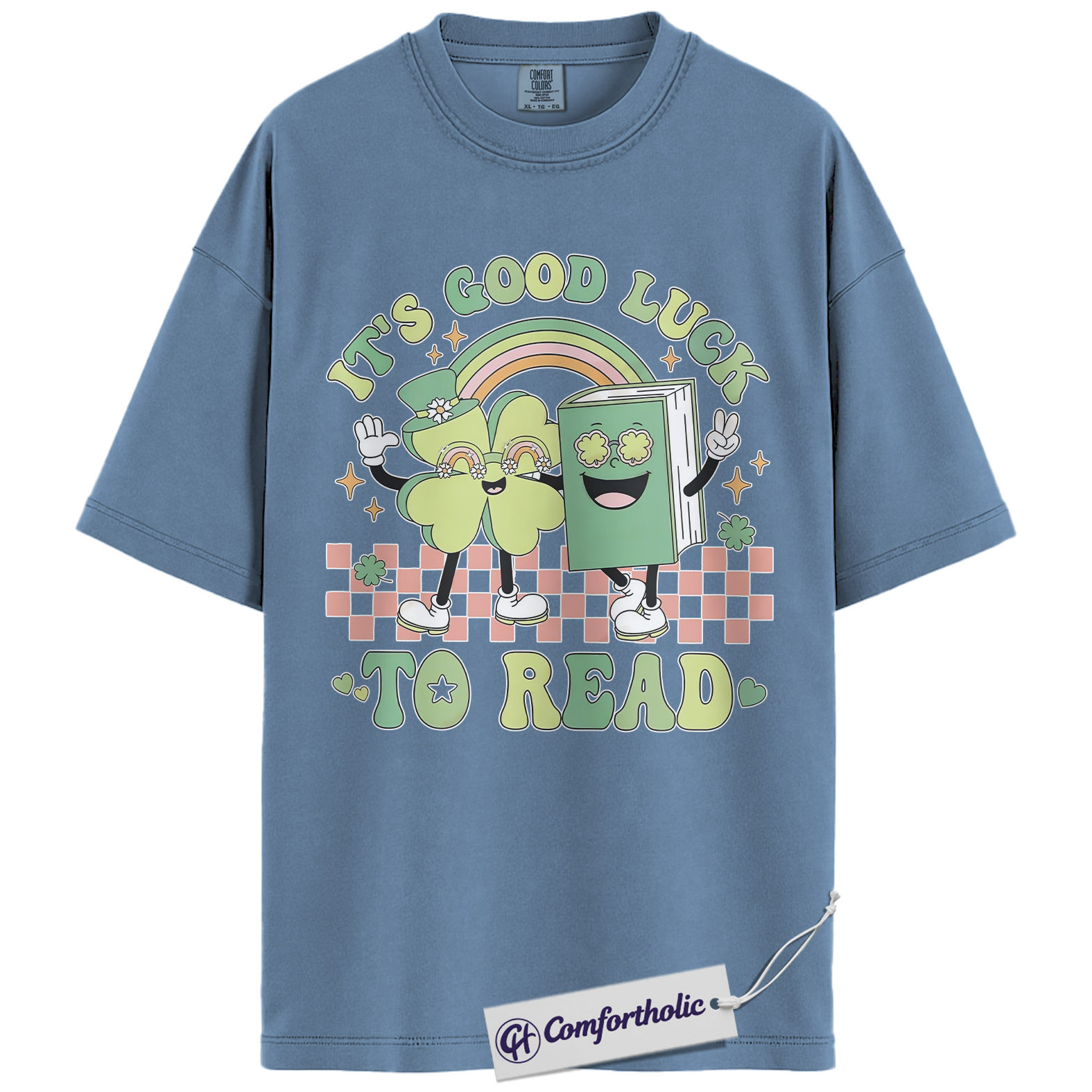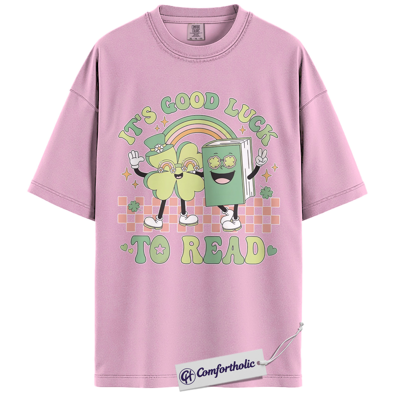 Good Luck To Read Shirt, St Patrick’s Day Shamrock Book Graphic Tee, Librarian Teacher Reading T-Shirt, St Paddy’s Day Gift for Book Lovers, Comfort Colors Shirt