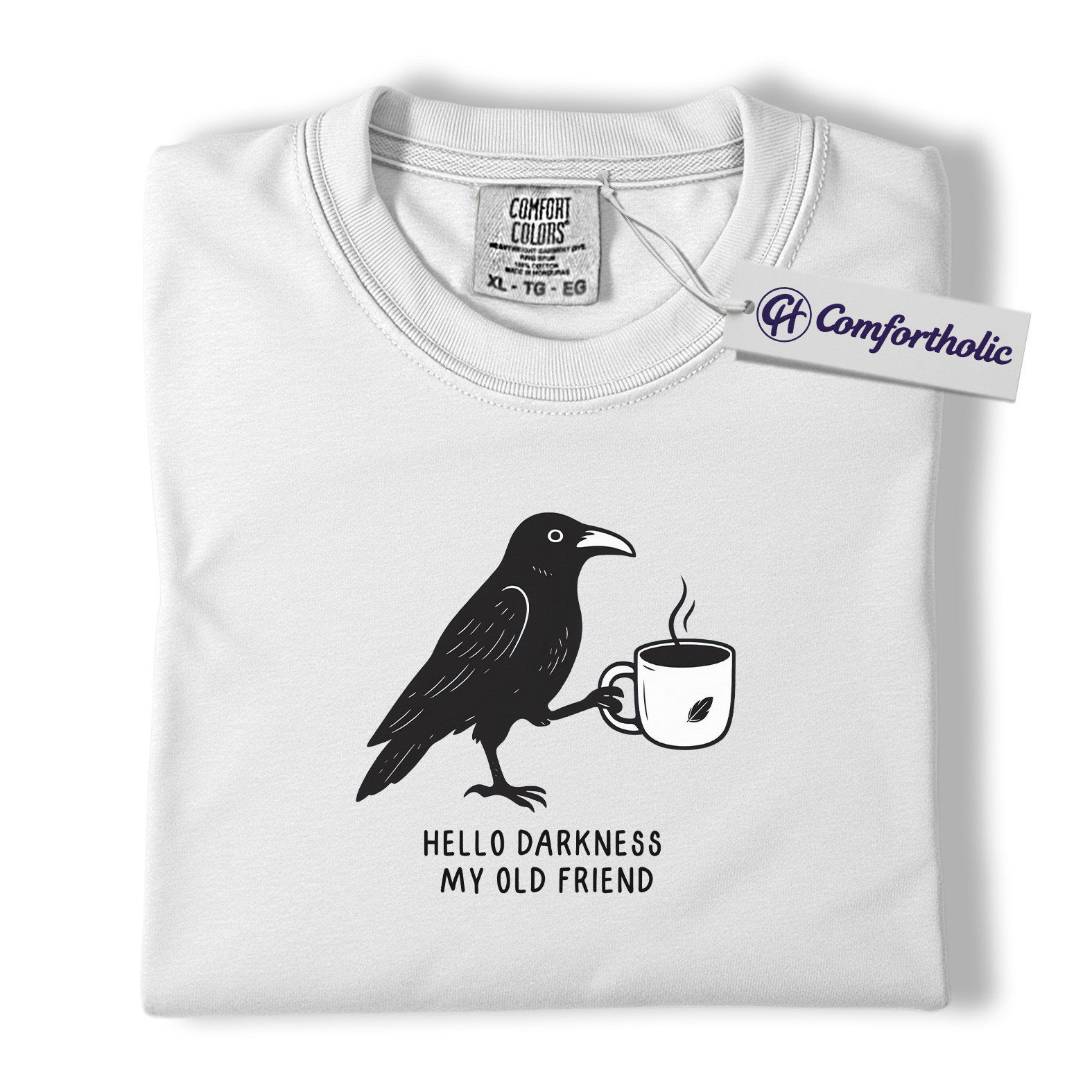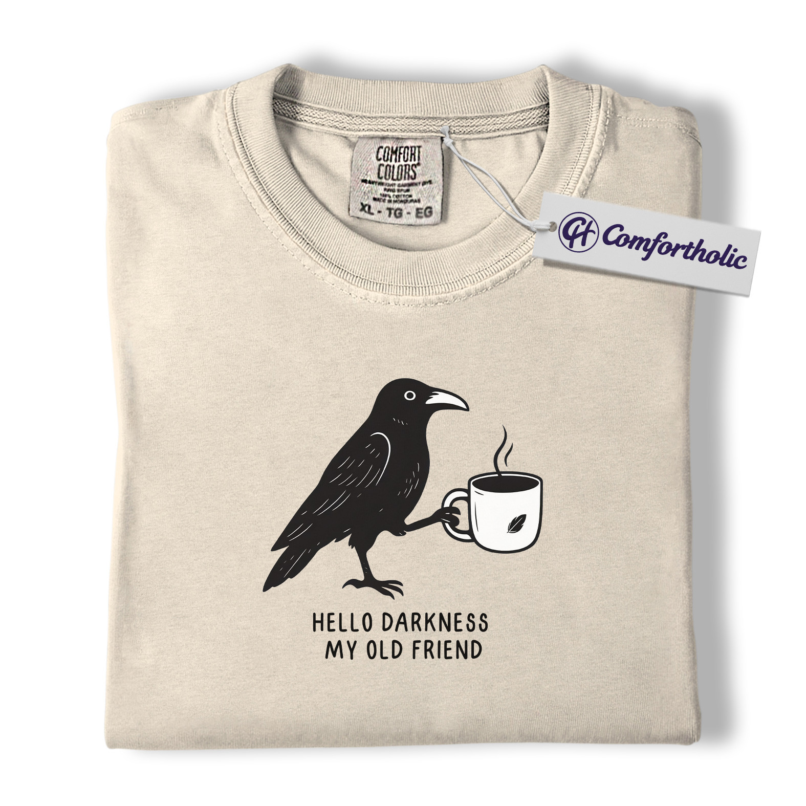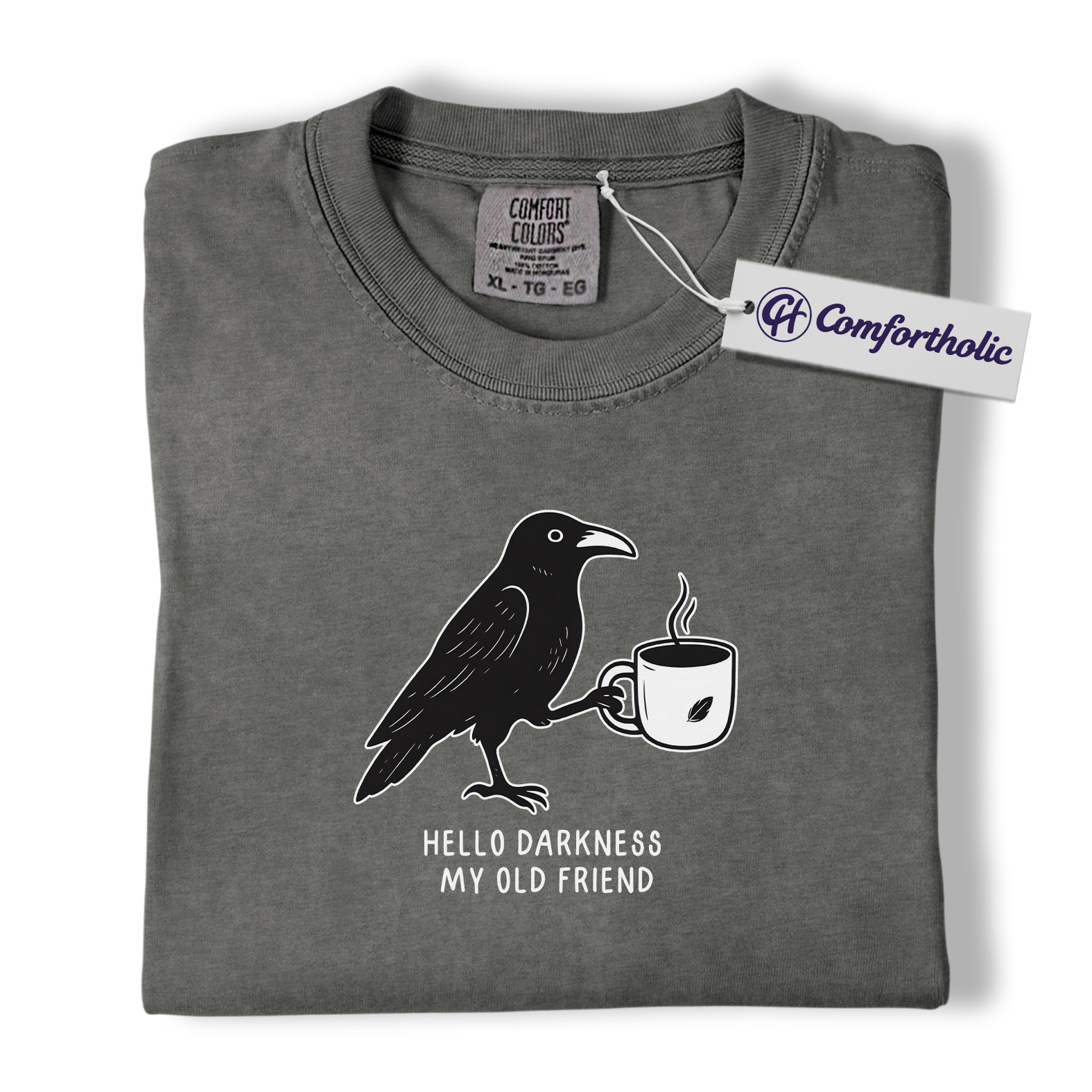 Hello Darkness My Old Friend Shirt, Funny Coffee Lover T-Shirt, Crow Bird Graphic Tee, Gothic Humor Gift, Comfort Colors Shirt