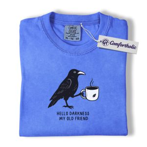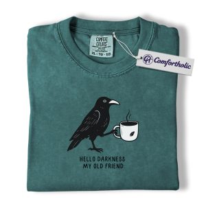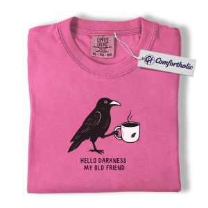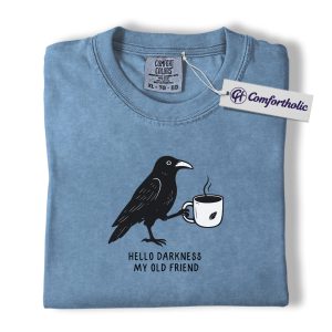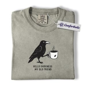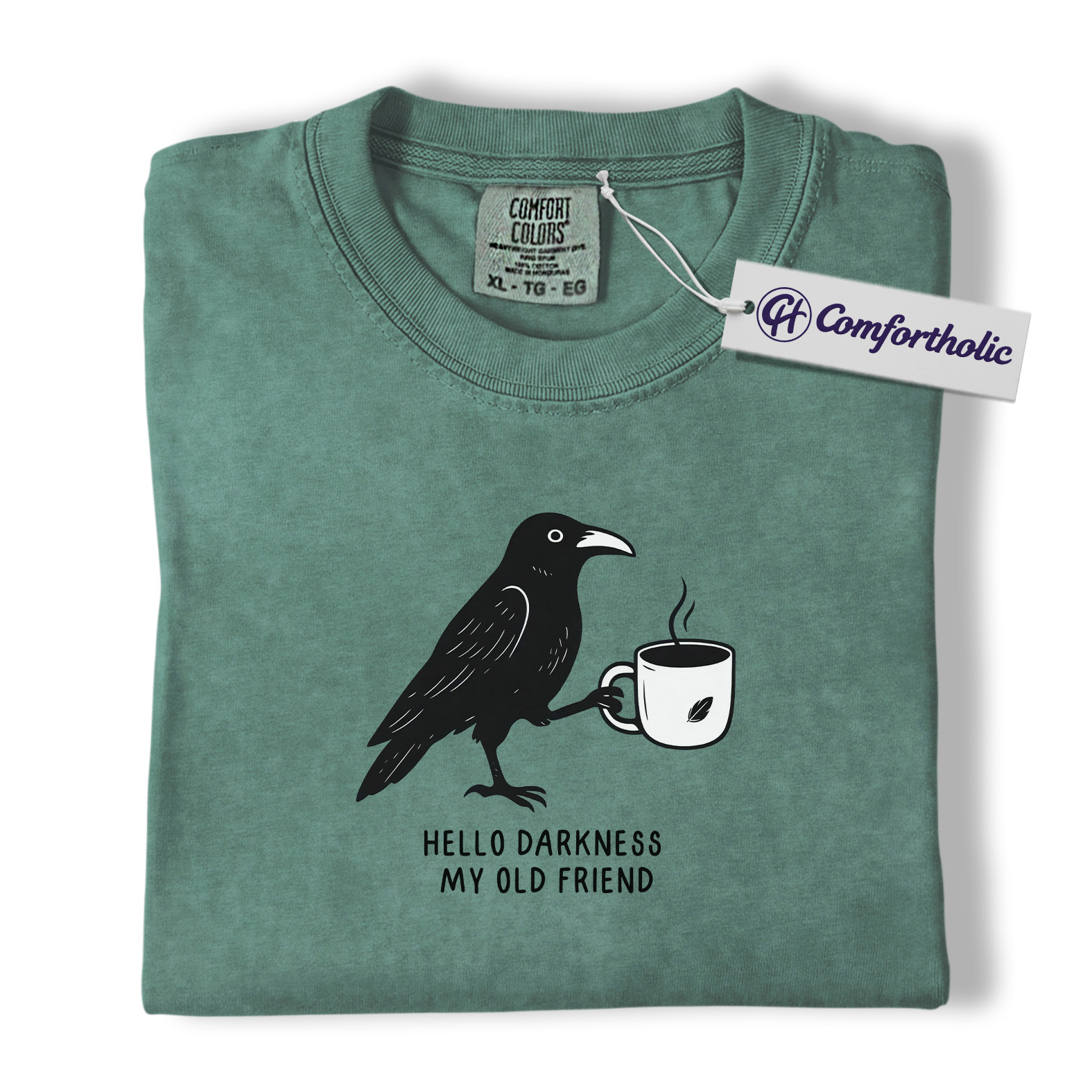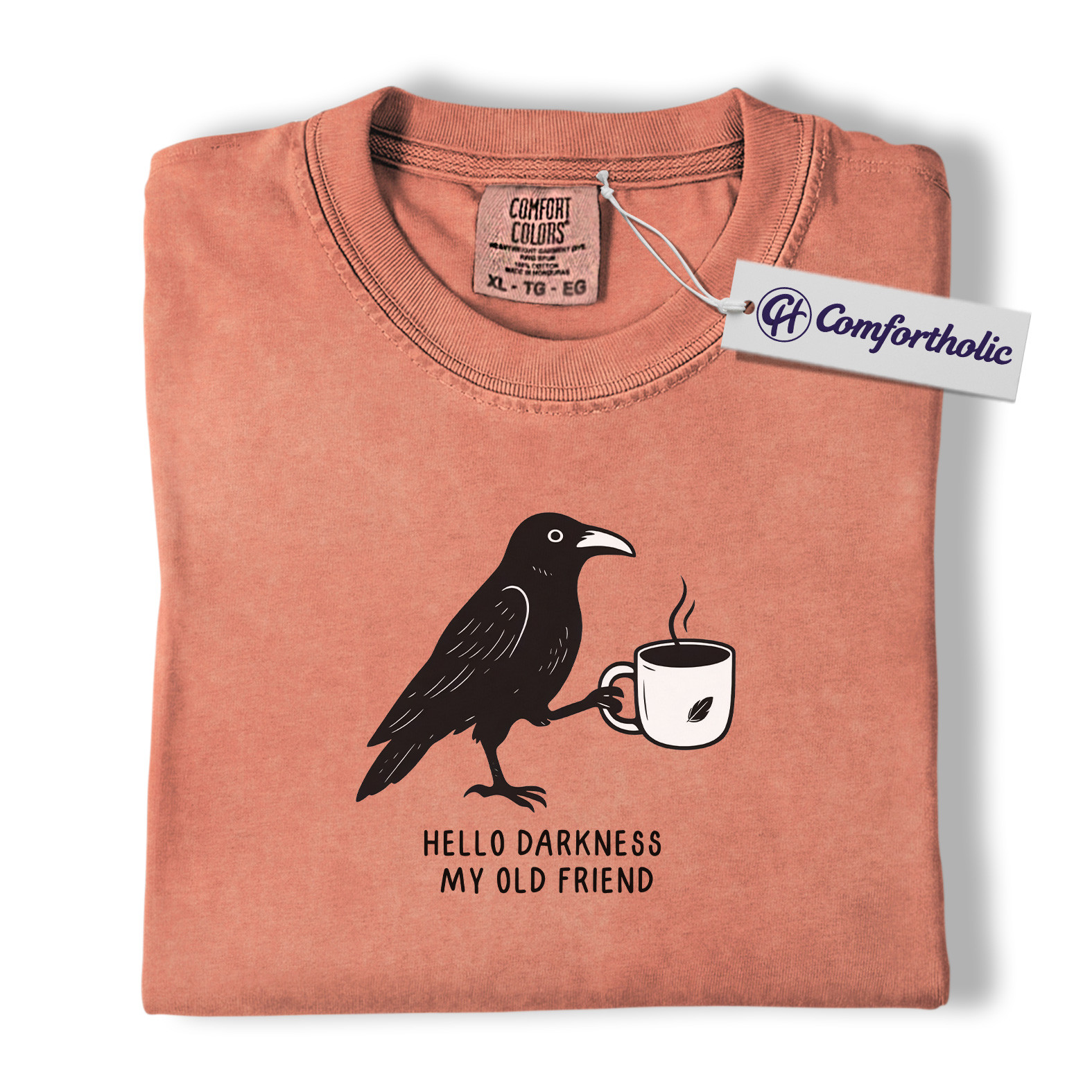 Hello Darkness My Old Friend Shirt, Funny Coffee Lover T-Shirt, Crow Bird Graphic Tee, Gothic Humor Gift, Comfort Colors Shirt