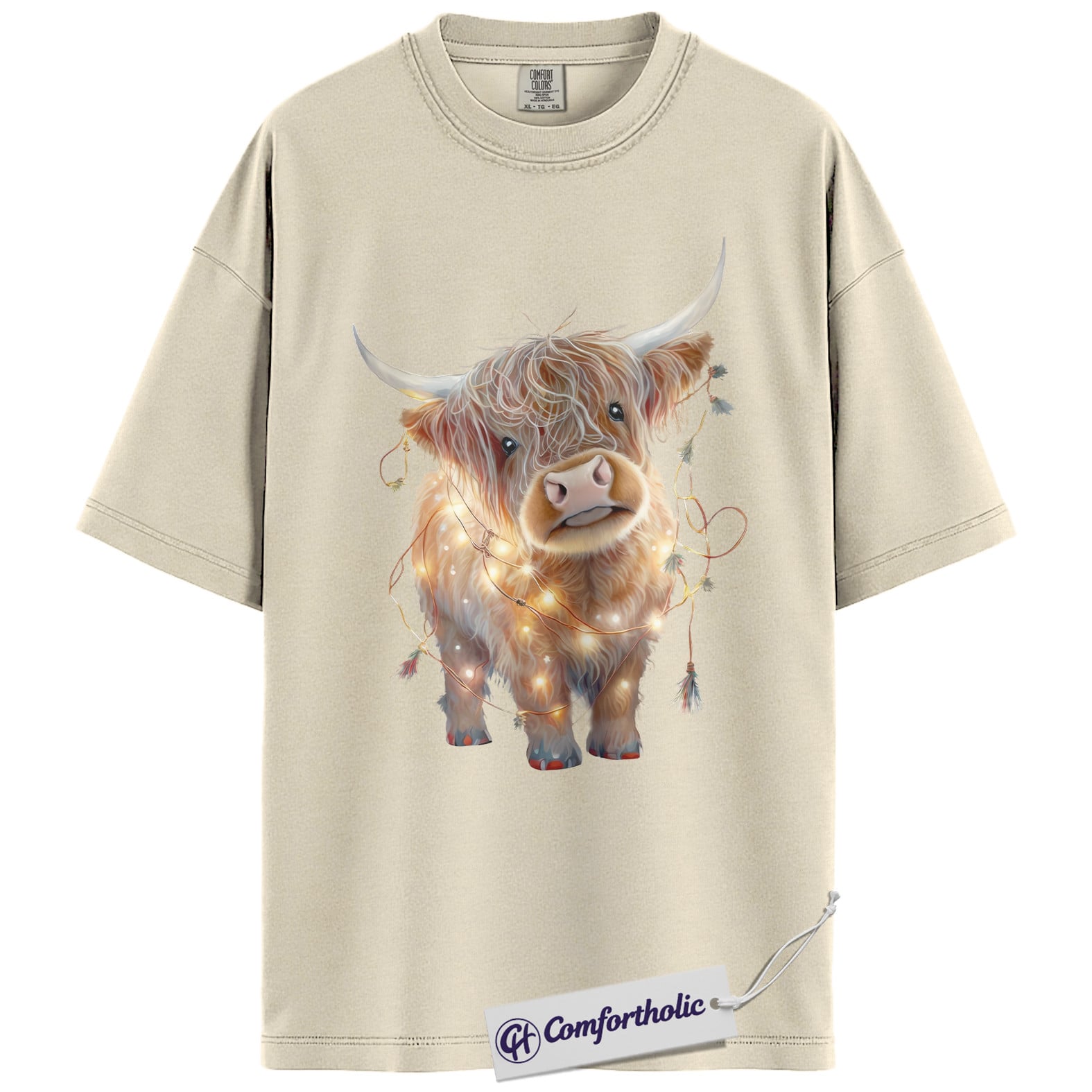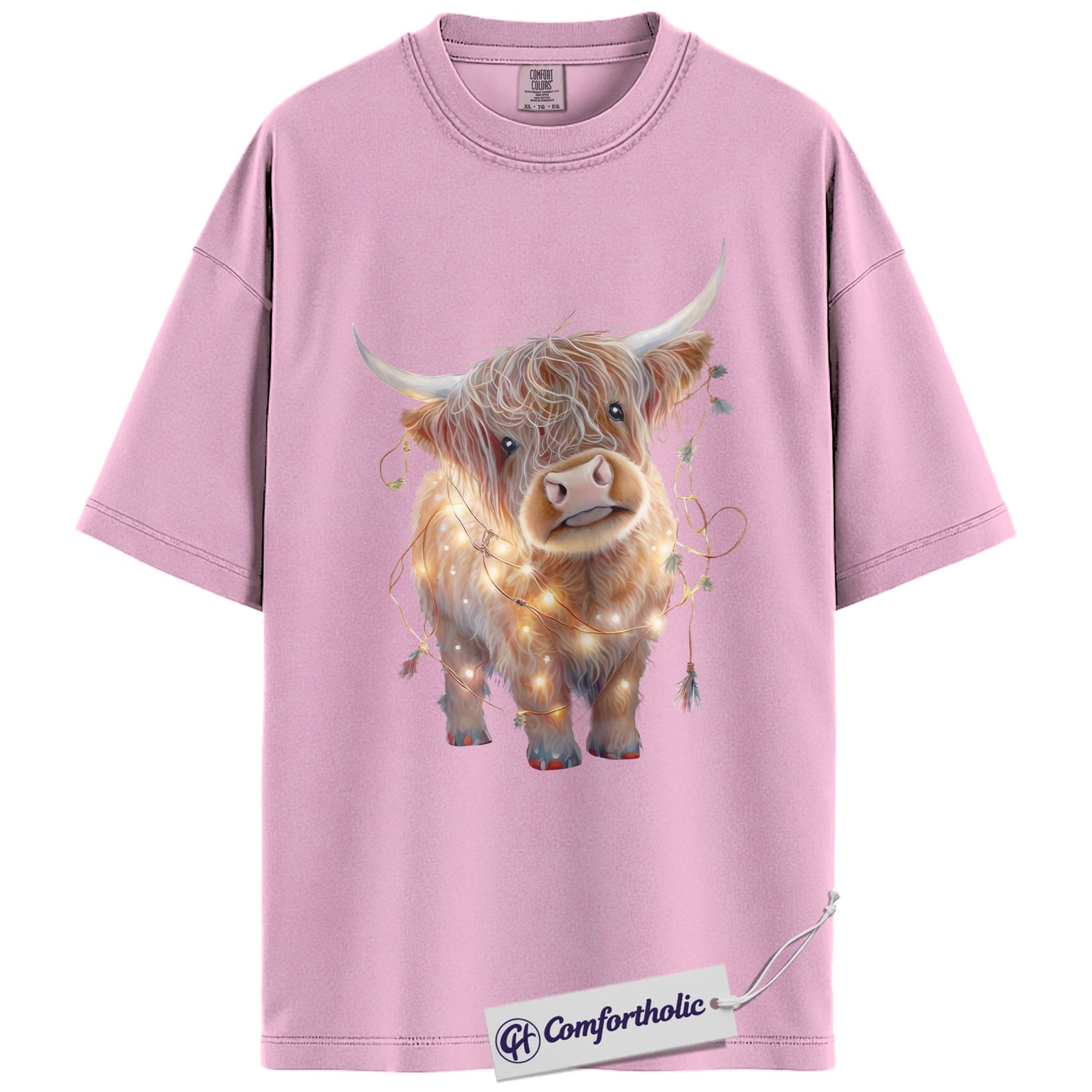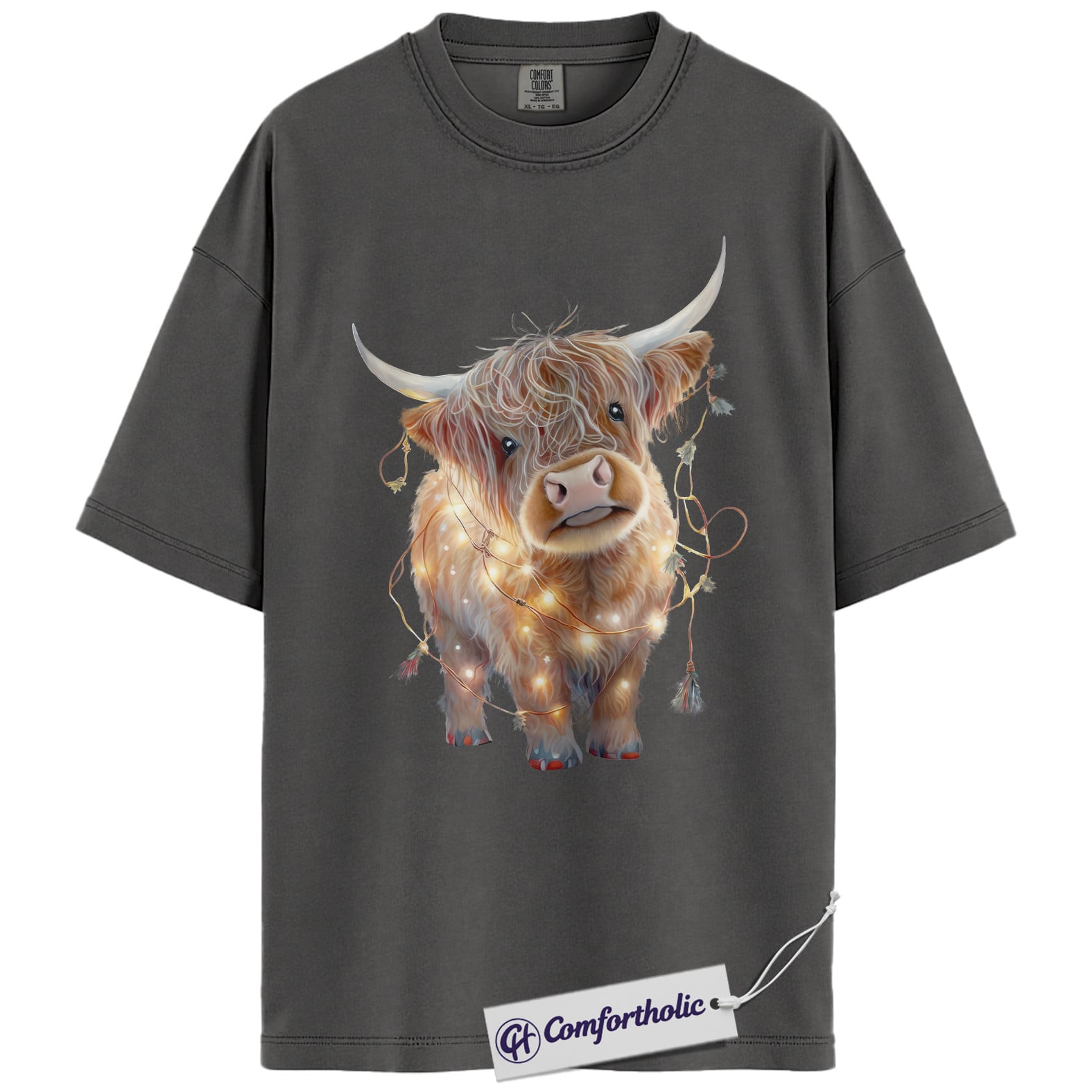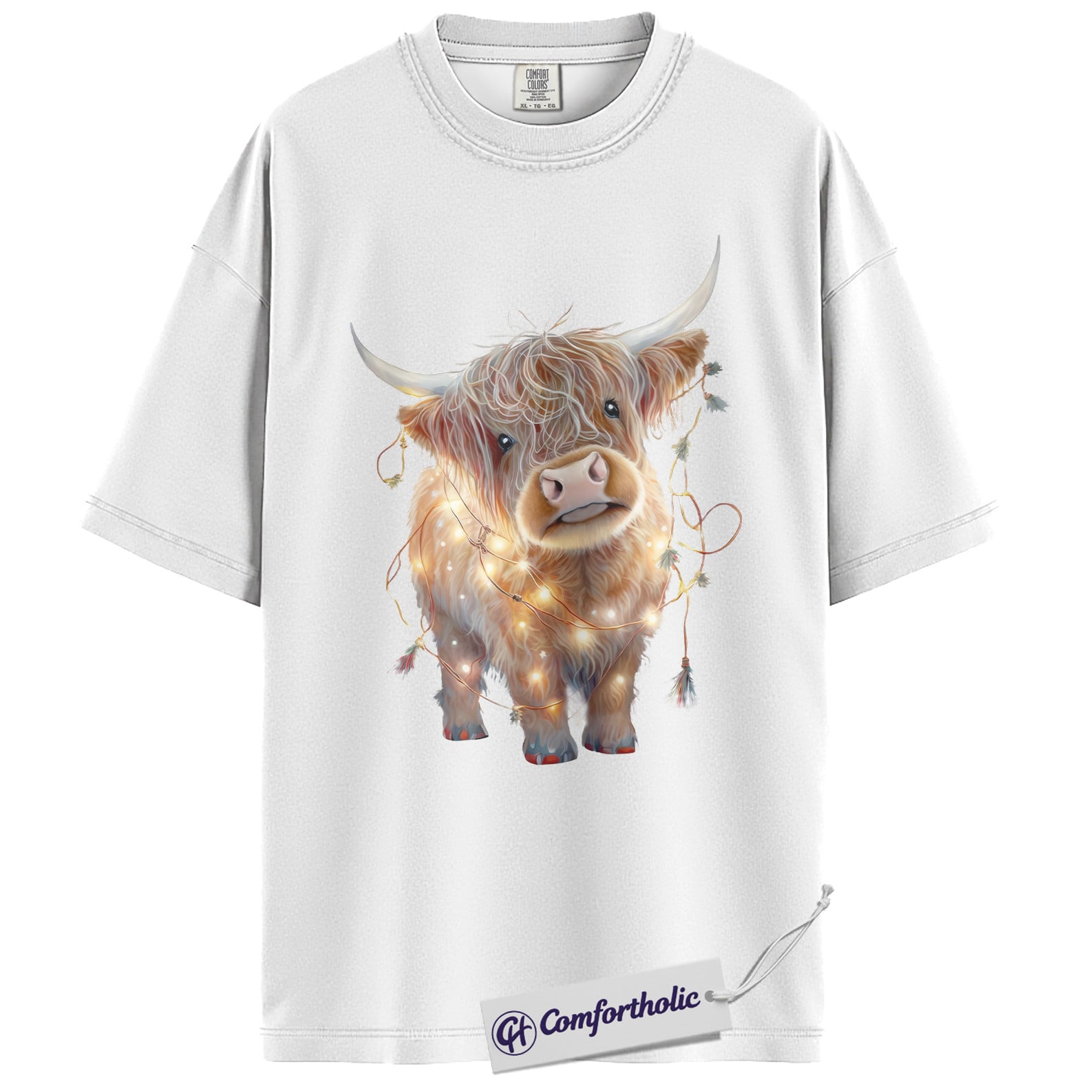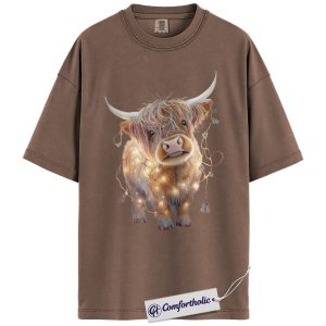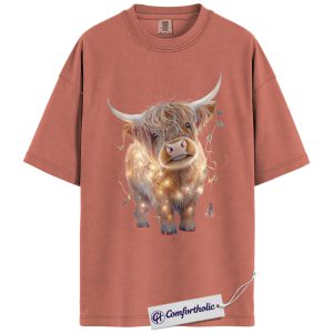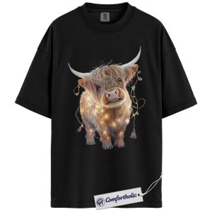 Highland Cow Christmas Shirt, Cute Scottish Cow in Holiday Lights T-Shirt, Farm Animal Christmas Graphic Tee, Country Western Holiday Gift, Christmas Comfort Colors Shirt