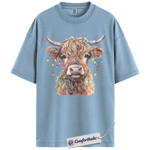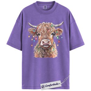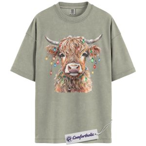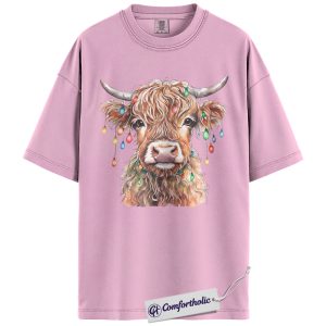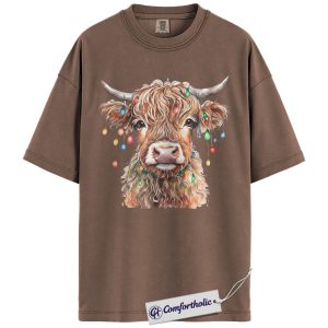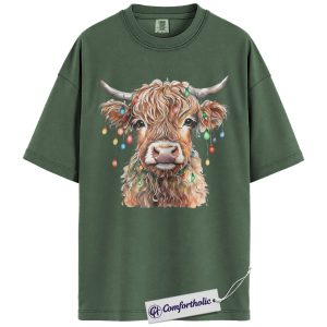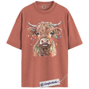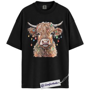 Highland Cow Christmas Shirt, Watercolor Farm Animal Holiday T-Shirt, Rustic Country Graphic Tee, Cute Gift for Cow Lovers, Christmas Comfort Colors Shirt