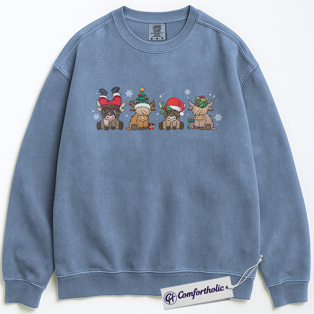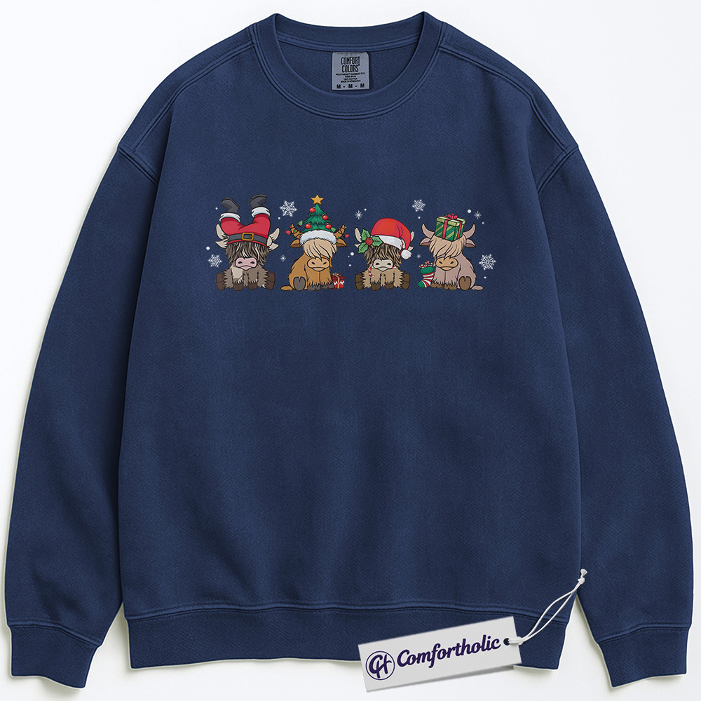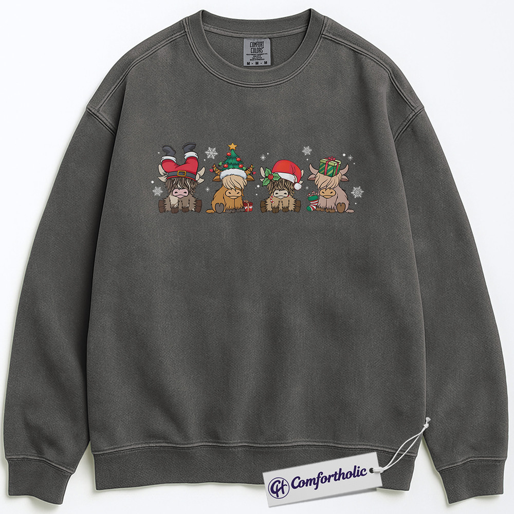 Highland Cow Christmas Sweatshirt, Cute Holiday Cow Sweatshirt, Funny Santa Hat Graphic Sweatshirt, Farm Animal Winter Gift, Christmas Comfort Colors Sweatshirt