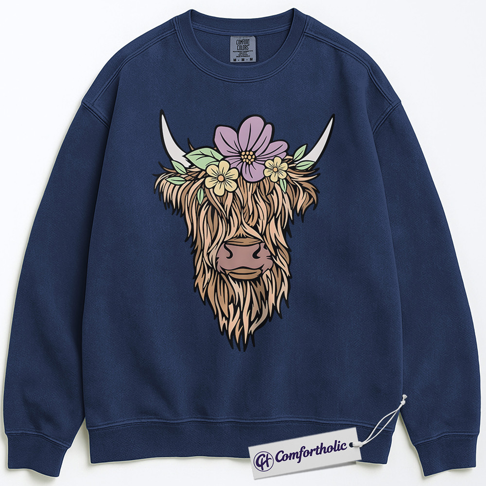 Highland Cow Flower Crown Sweatshirt, Boho Western Cow Pullover, Rustic Farm Animal Crewneck, Country Girl Aesthetic Gift, Comfort Colors Sweatshirt