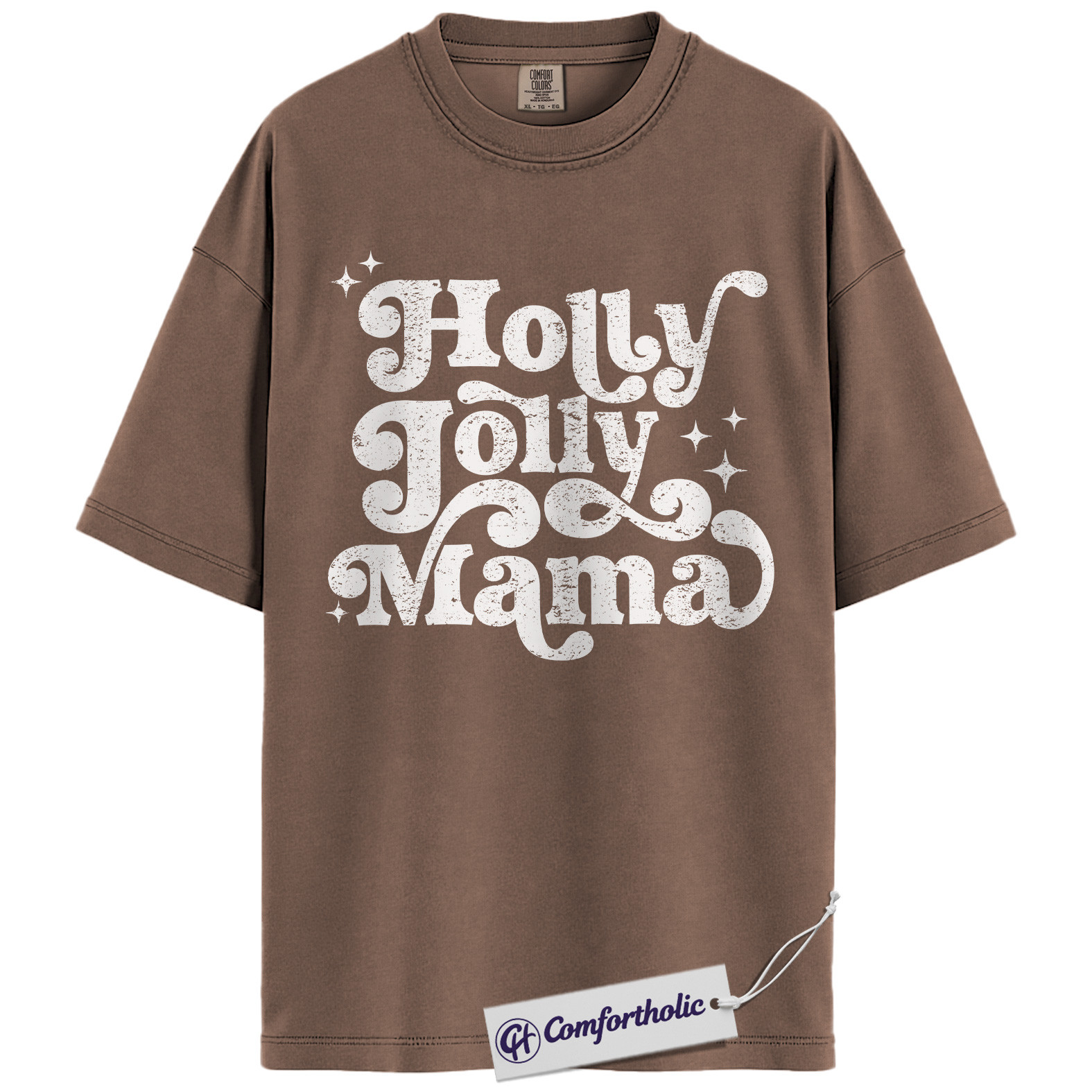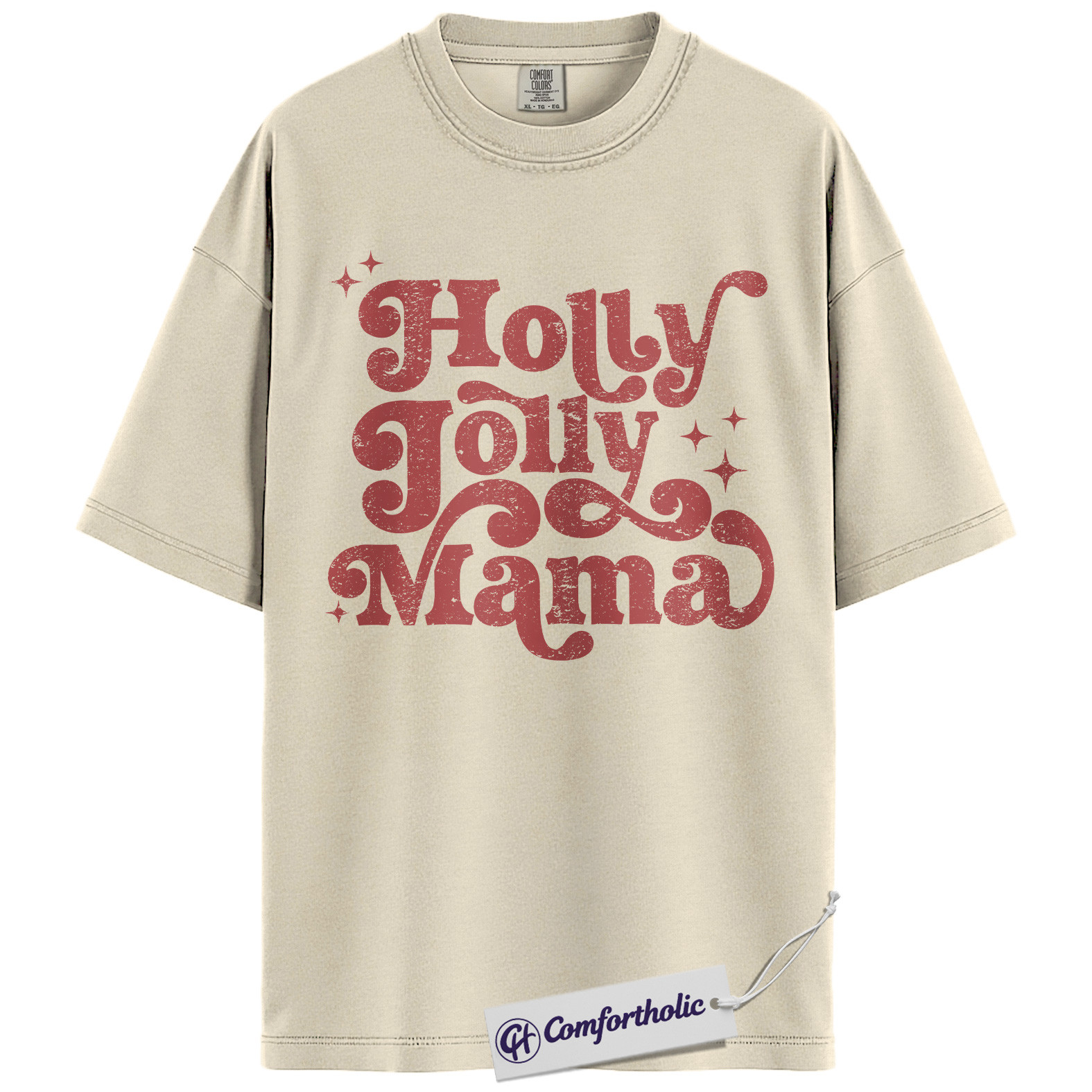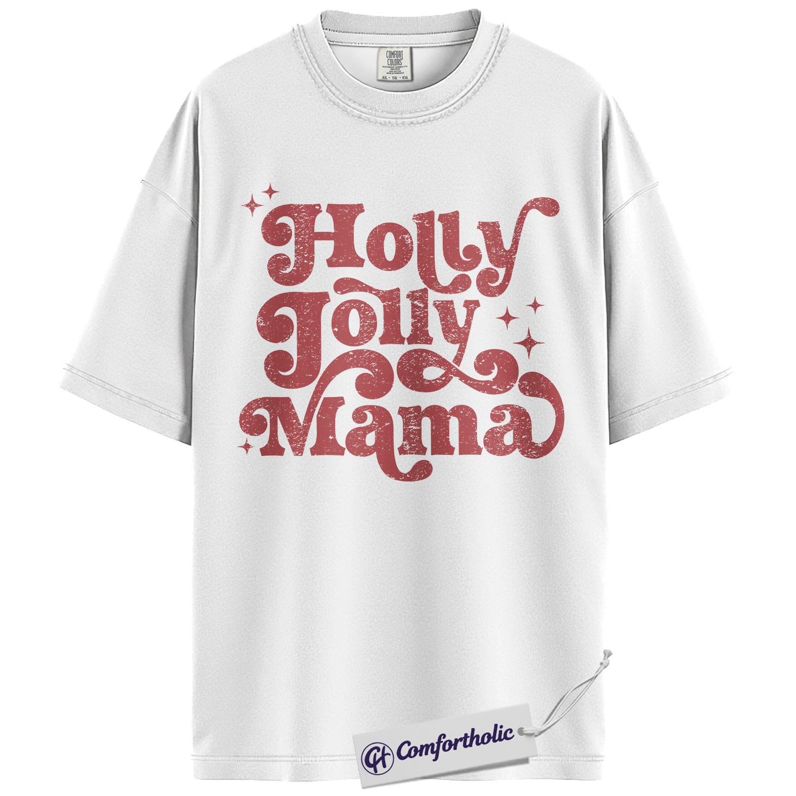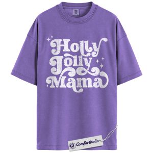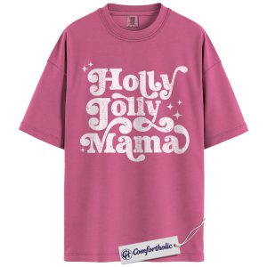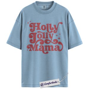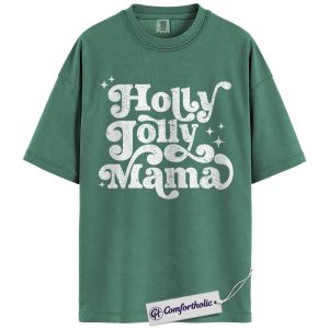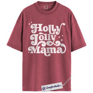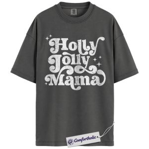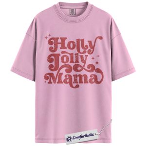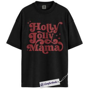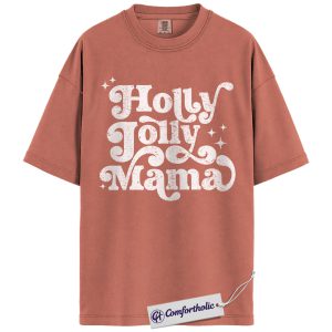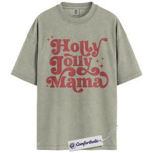 Holly Jolly Mama Shirt, Christmas Mom T-Shirt, Retro Groovy Holiday Typography Graphic Tee, Cute Christmas Gift for Moms, Christmas Comfort Colors Shirt