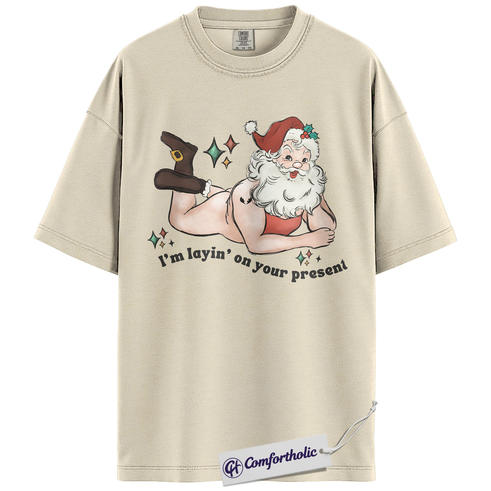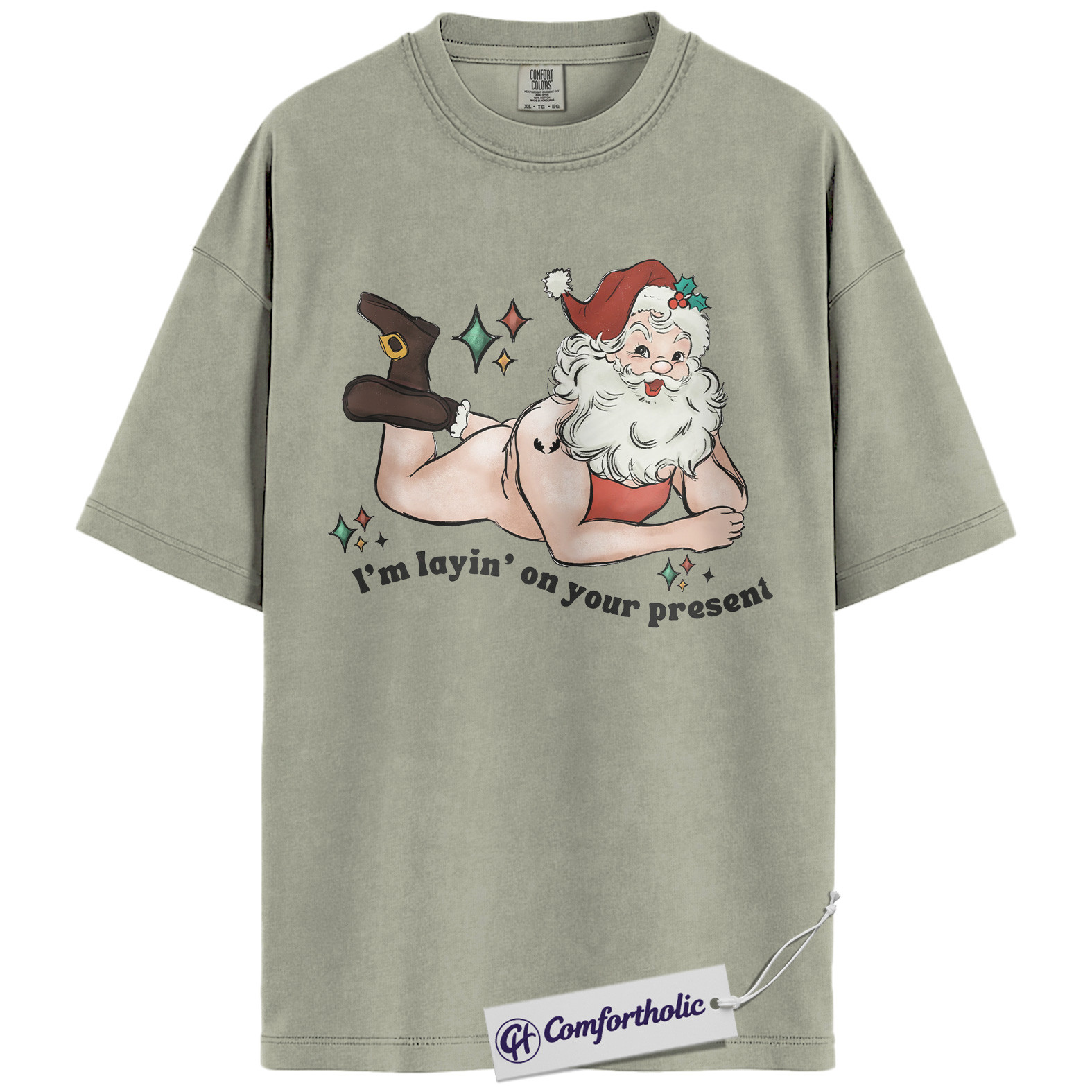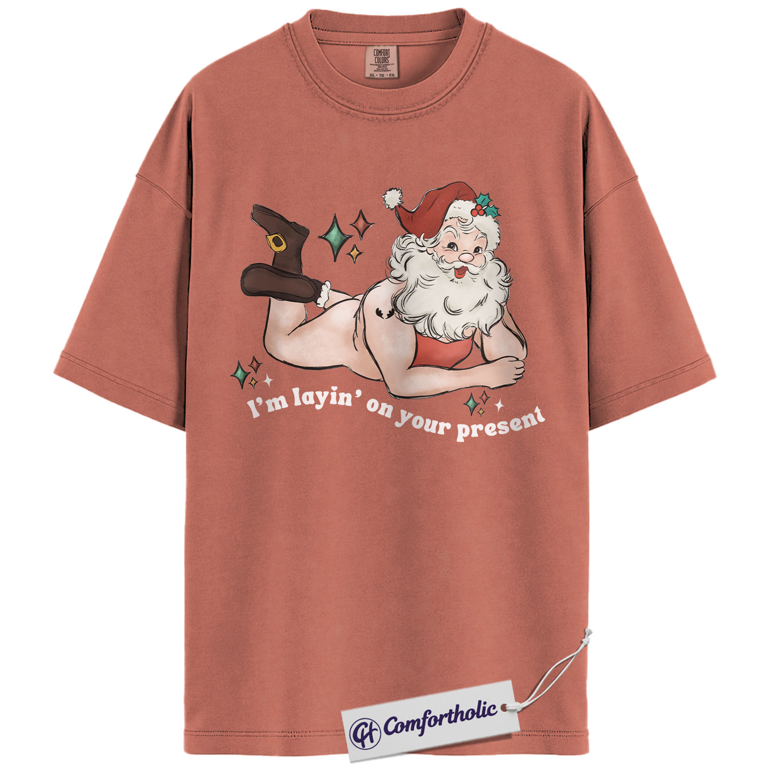 I’m Laying On Your Present Shirt, Funny Santa Christmas T-Shirt, Naughty Holiday Graphic Tee, Adult Humor Gift for Friends, Christmas Comfort Colors Shirt