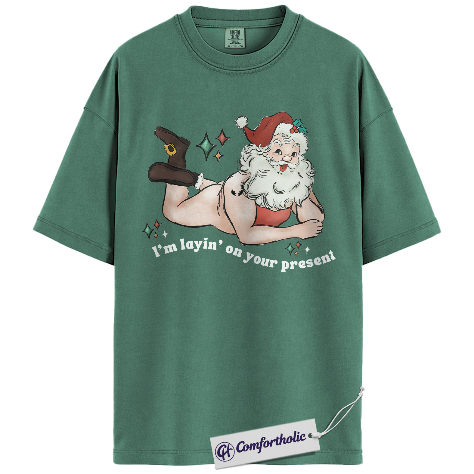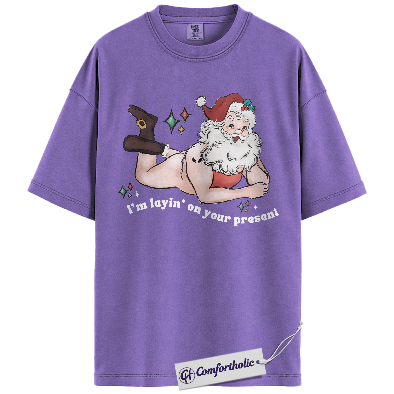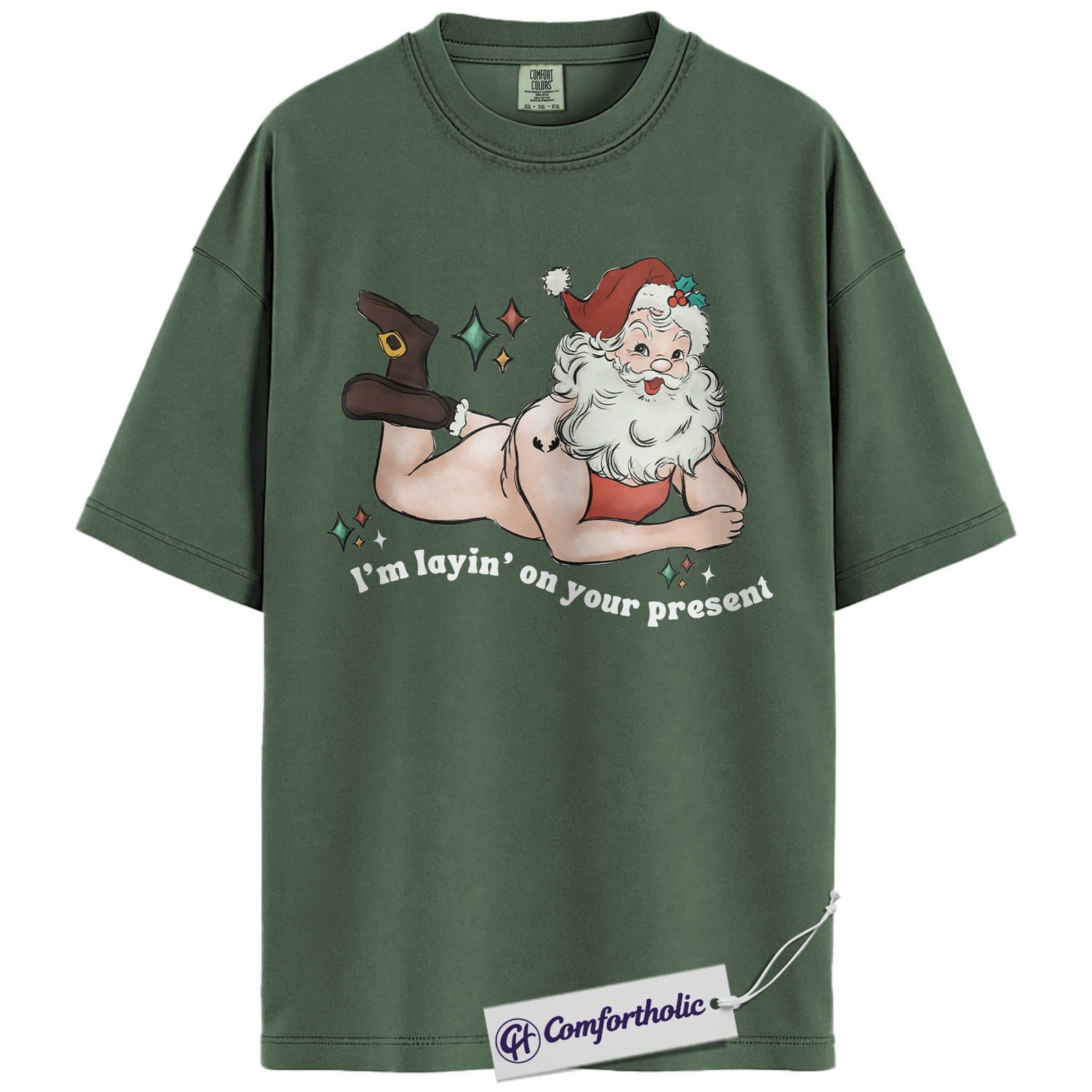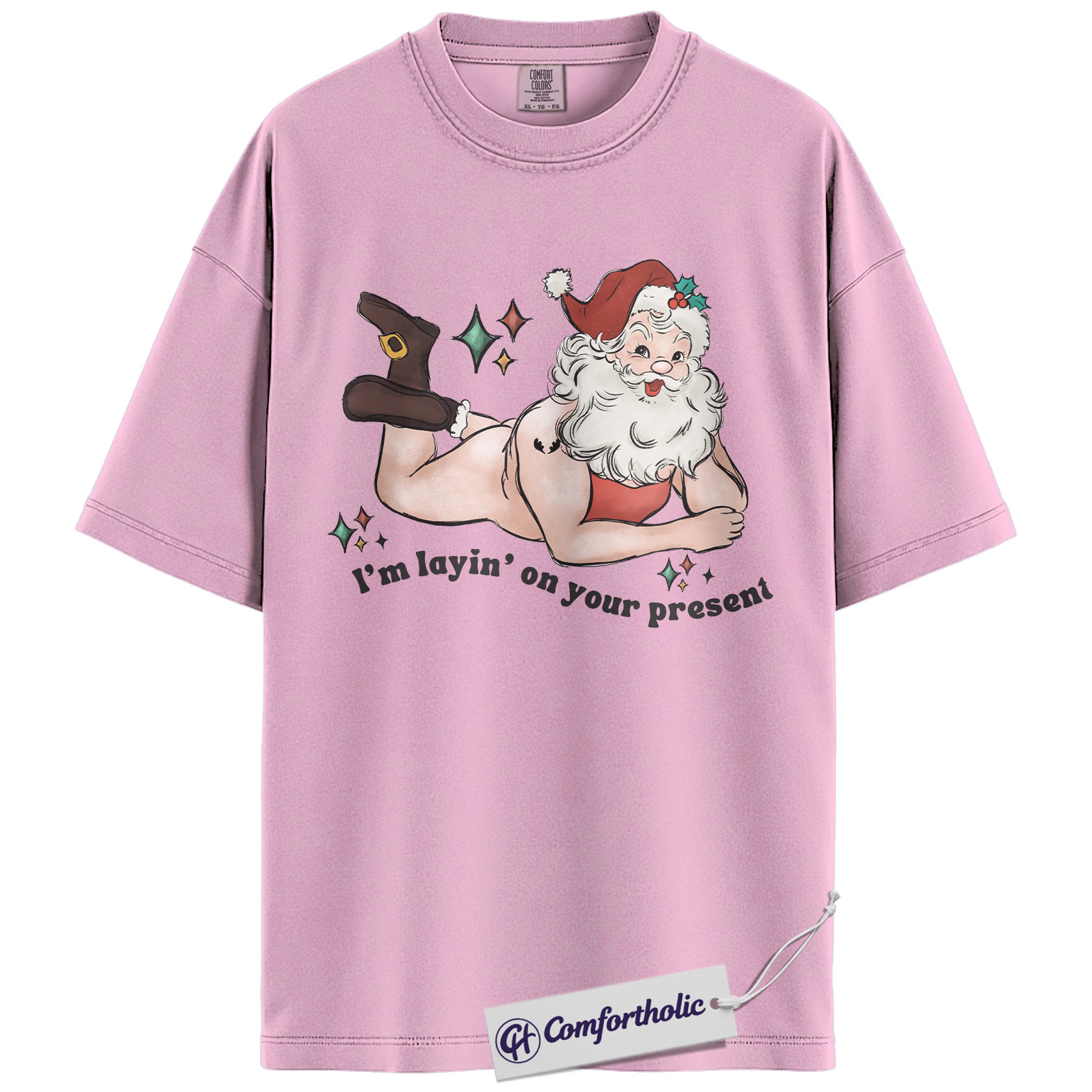 I’m Laying On Your Present Shirt, Funny Santa Christmas T-Shirt, Naughty Holiday Graphic Tee, Adult Humor Gift for Friends, Christmas Comfort Colors Shirt