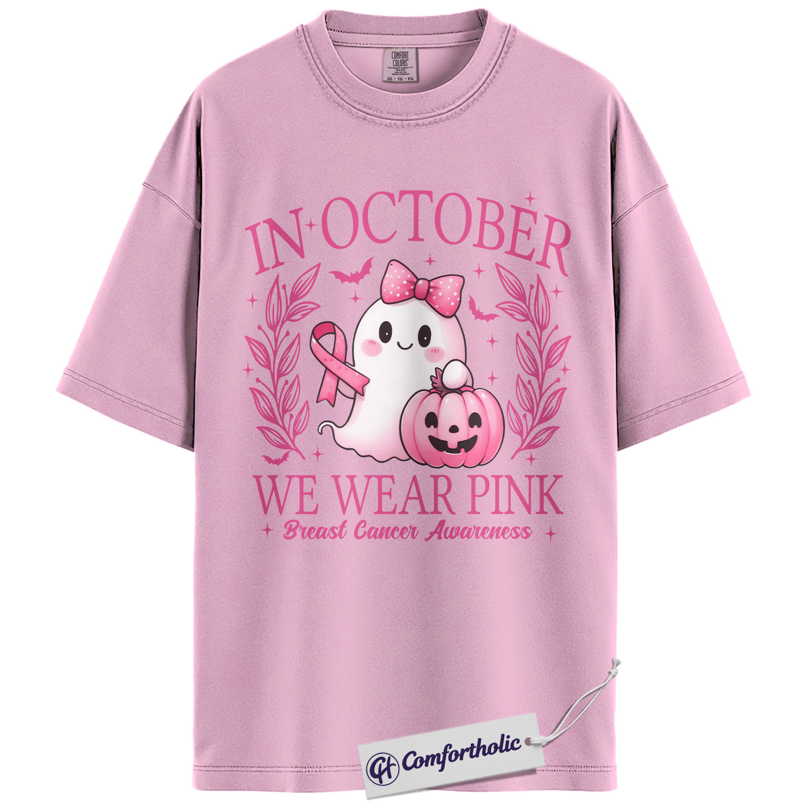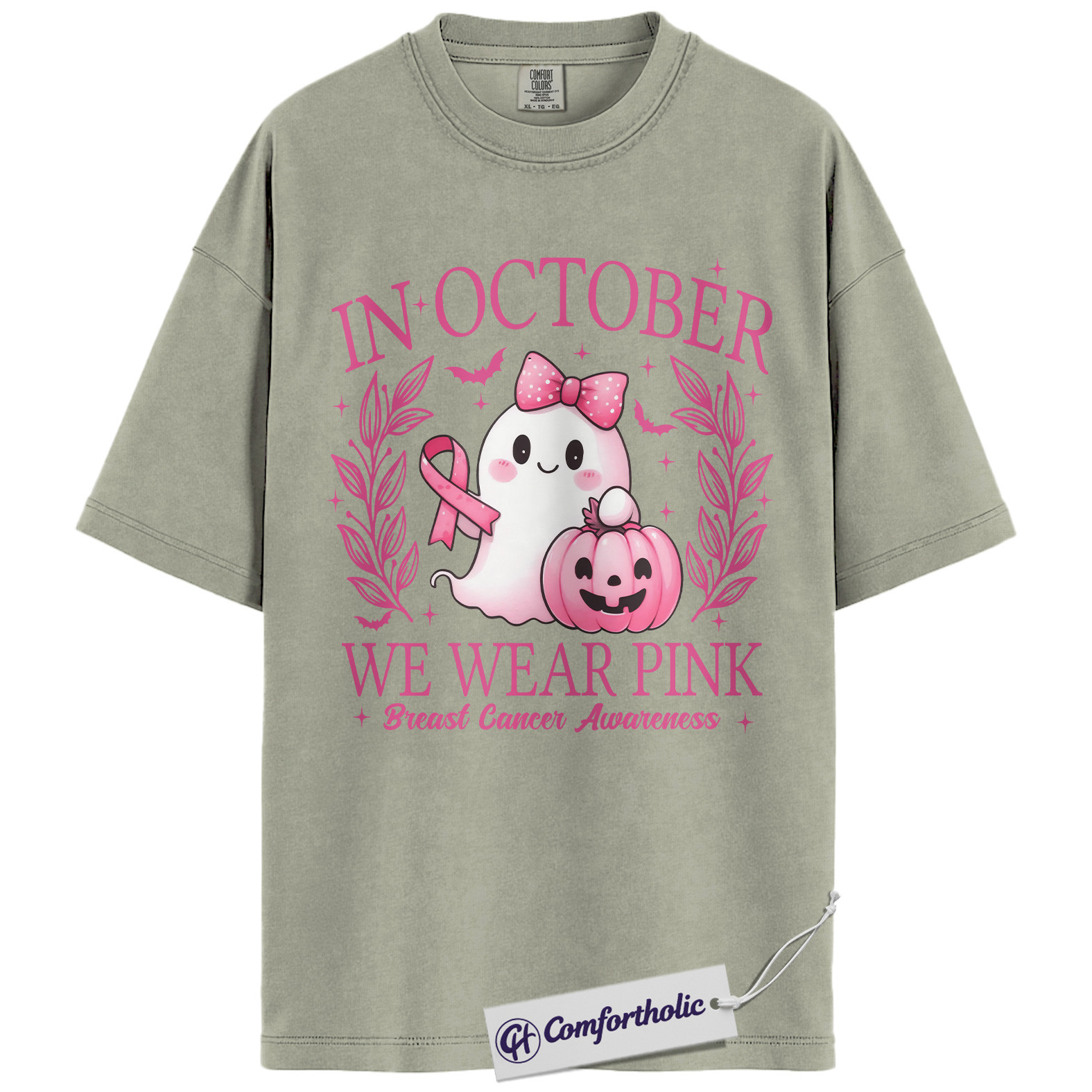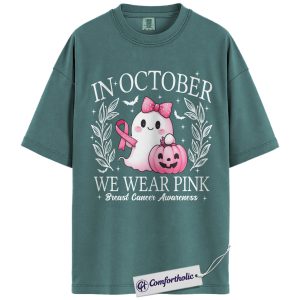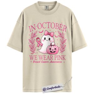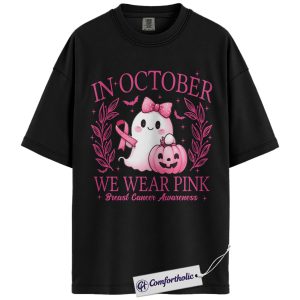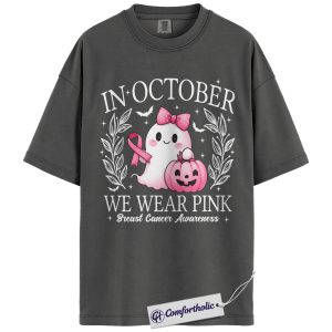In October We Wear Pink Shirt, Breast Cancer Awareness Halloween T-Shirt, Witch Broom Graphic Tee for Women, Cancer Awareness Comfort Colors Shirt