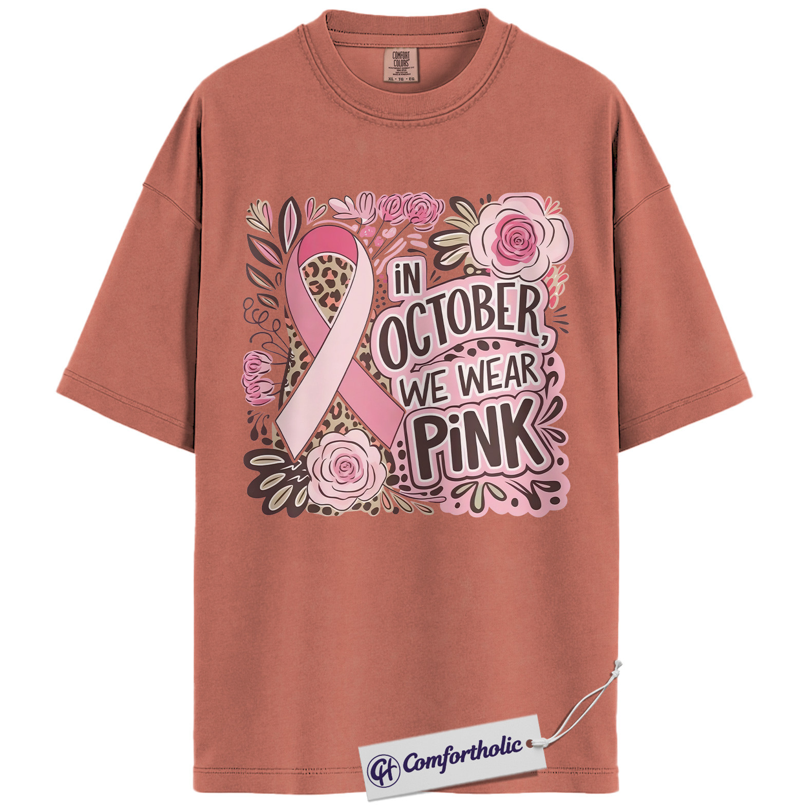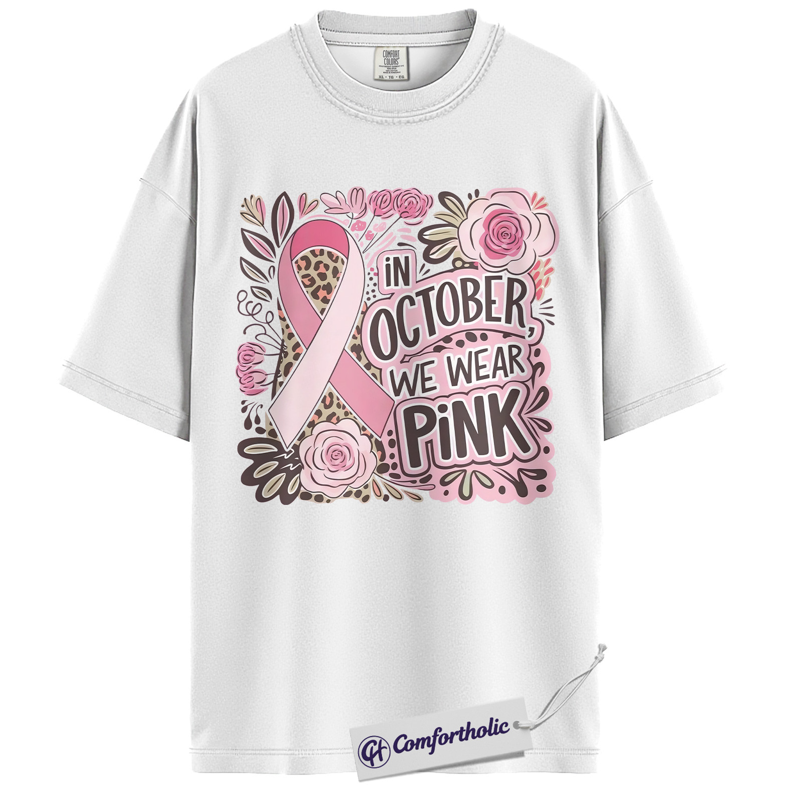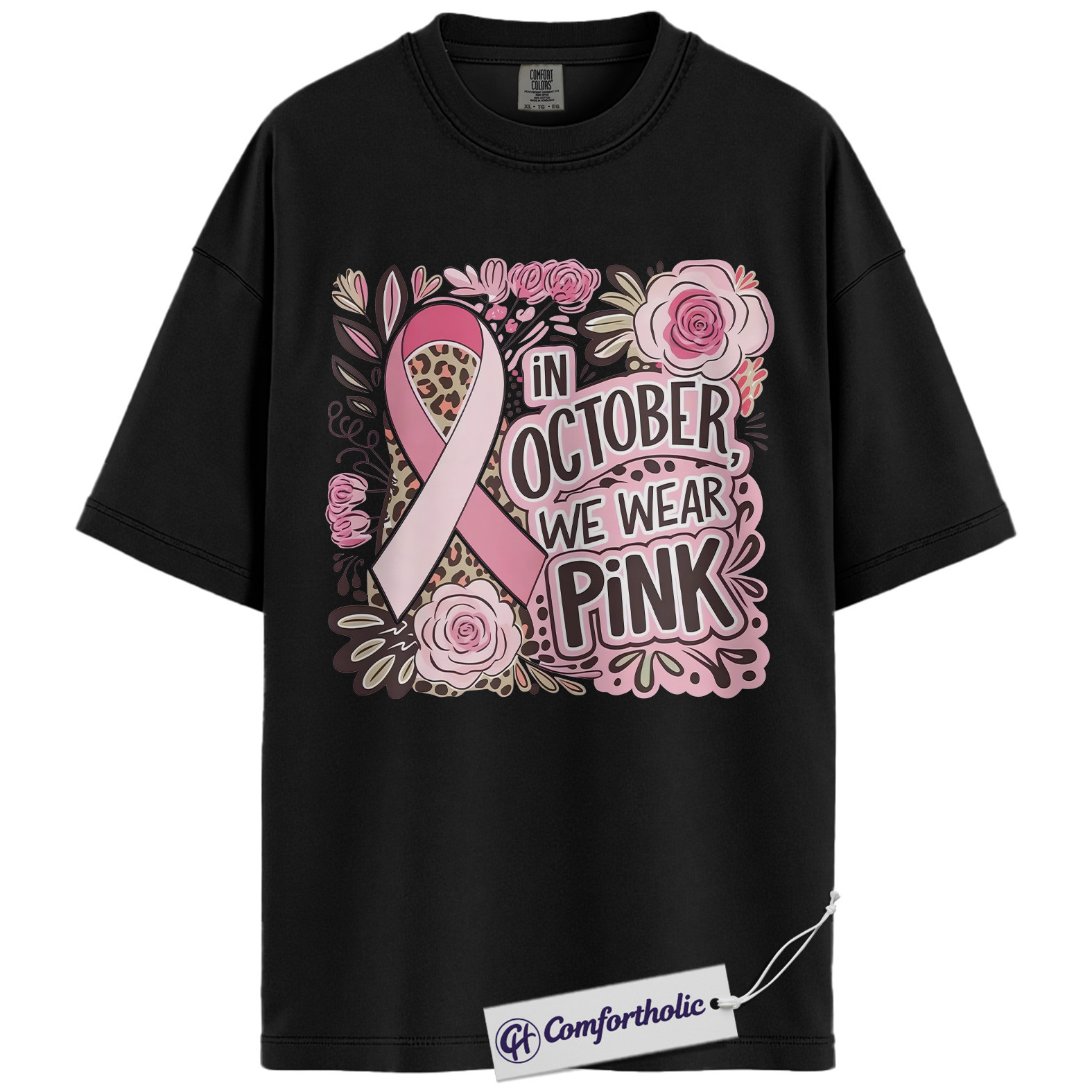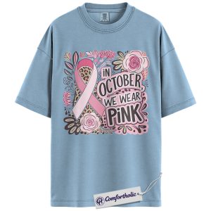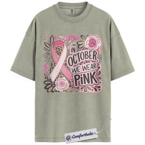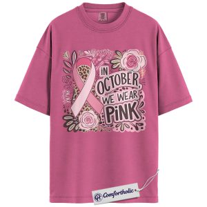 In October We Wear Pink Shirt, Breast Cancer Awareness T-Shirt, Pink Ribbon Graphic Tee for Women, Floral Leopard Print Support Comfort Colors Shirt