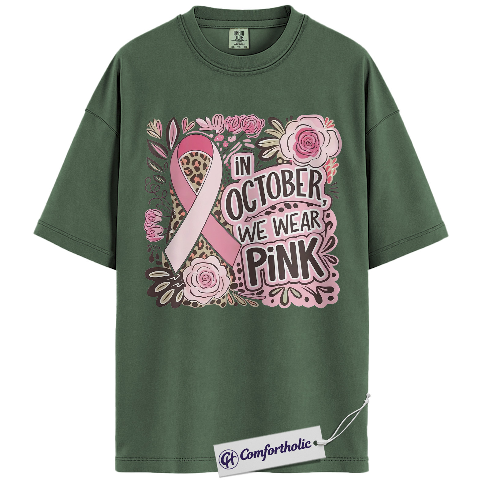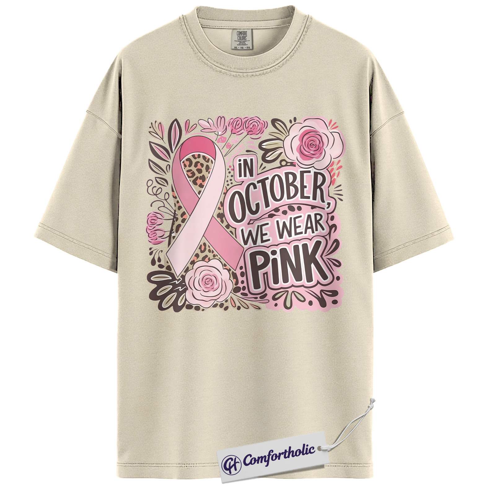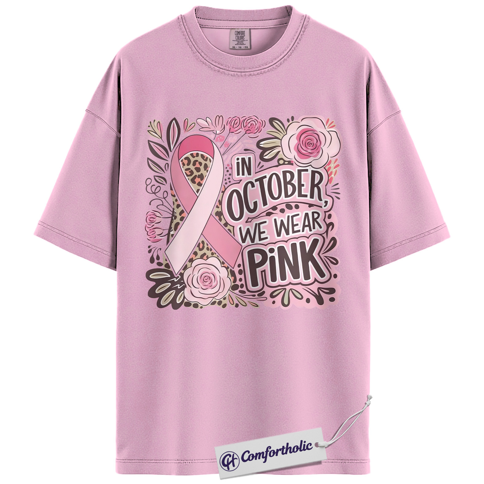 In October We Wear Pink Shirt, Breast Cancer Awareness T-Shirt, Pink Ribbon Graphic Tee for Women, Floral Leopard Print Support Comfort Colors Shirt