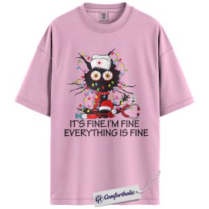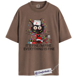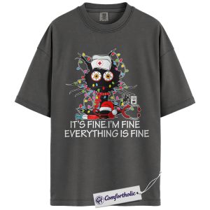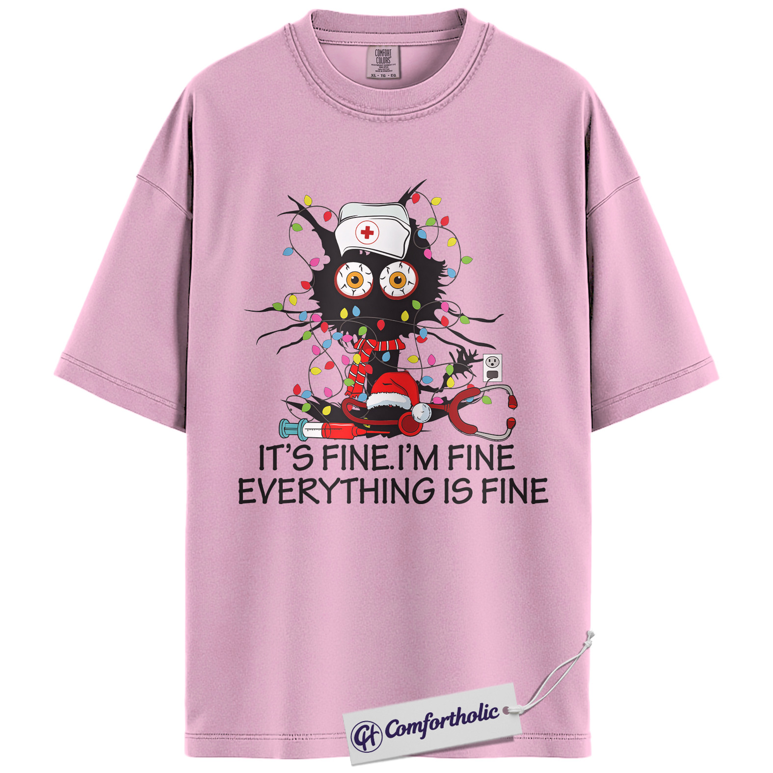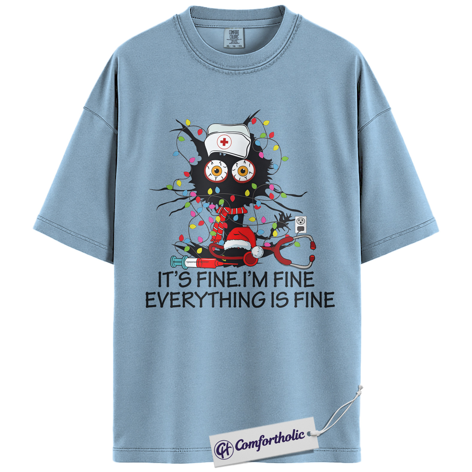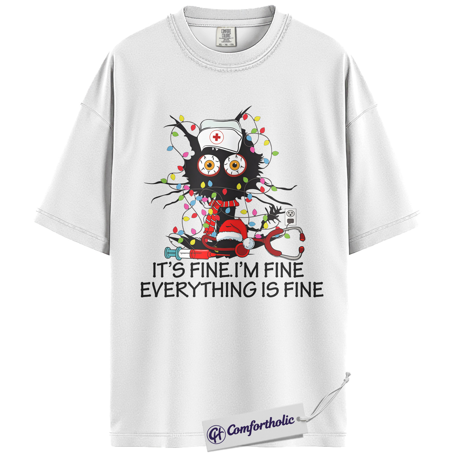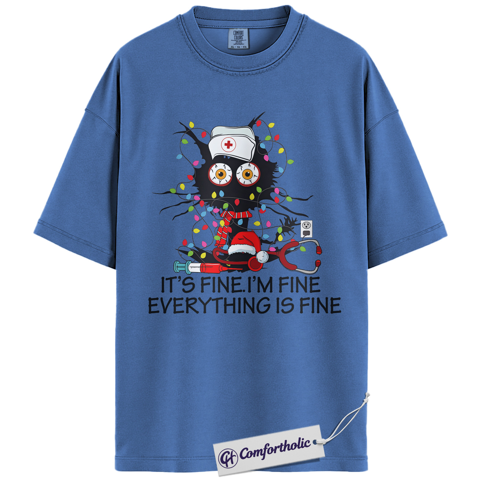 It’s Fine I’m Fine Everything Is Fine Nurse Shirt, Funny Christmas Cat T-Shirt, Cute RN Holiday Humor Graphic Tee, Stress Relief Gift for Nurses, Christmas Comfort Colors Shirt