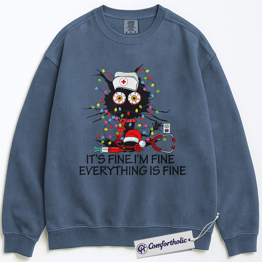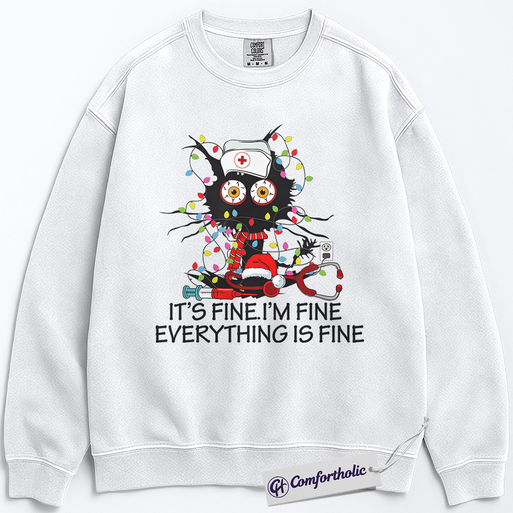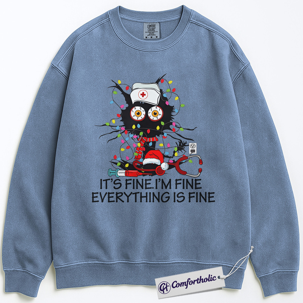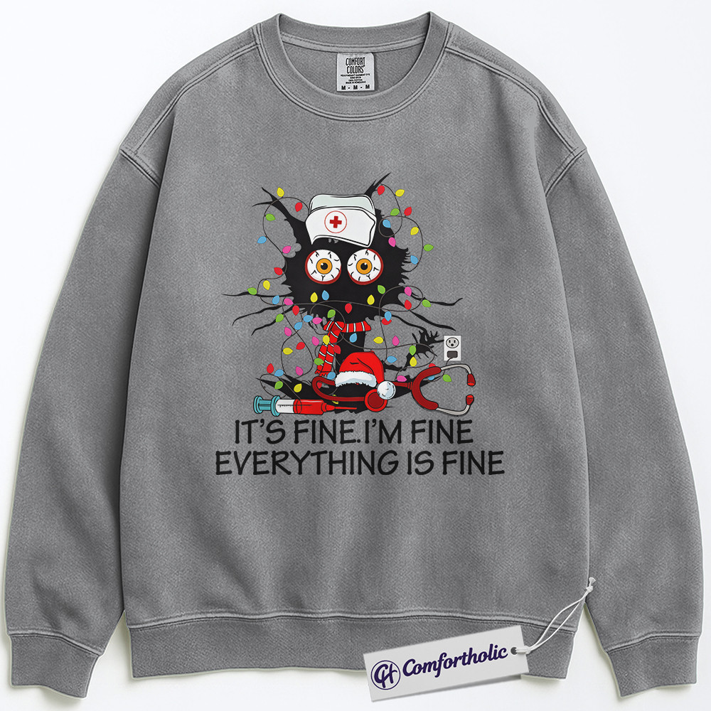 It’s Fine I’m Fine Everything Is Fine Nurse Sweatshirt, Funny Christmas Cat Pullover, Cute RN Holiday Humor Graphic Crewneck, Stress Relief Gift for Nurses, Christmas Comfort Colors Sweatshirt