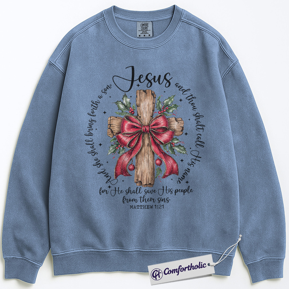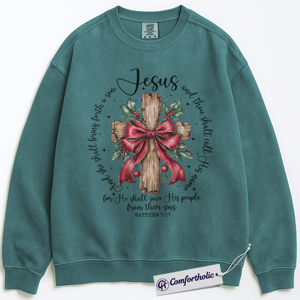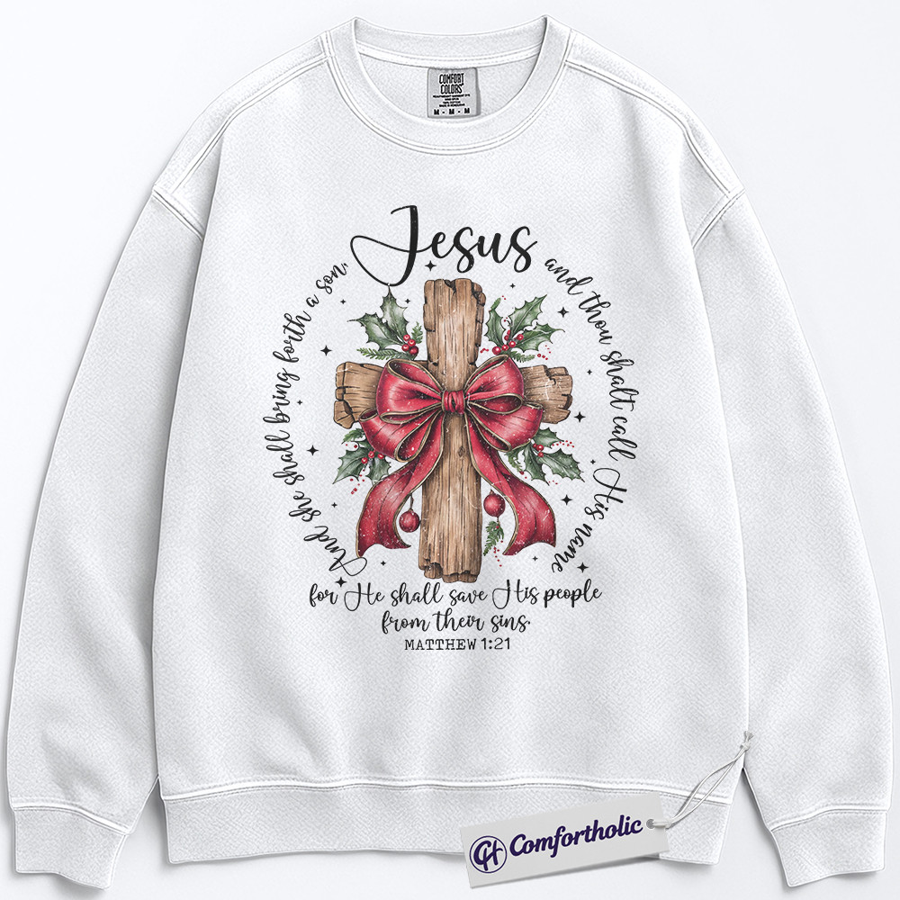 Jesus Cross Christmas Sweatshirt, Matthew 1:21 Bible Verse Pullover, Christian Faith Holiday Graphic Crewneck, Religious Christmas Gift for Women, Christmas Comfort Colors Sweatshirt
