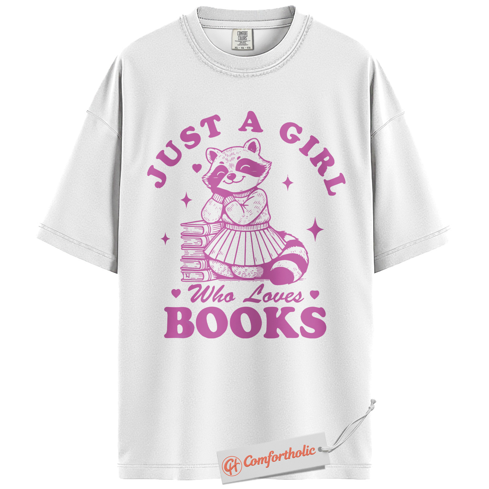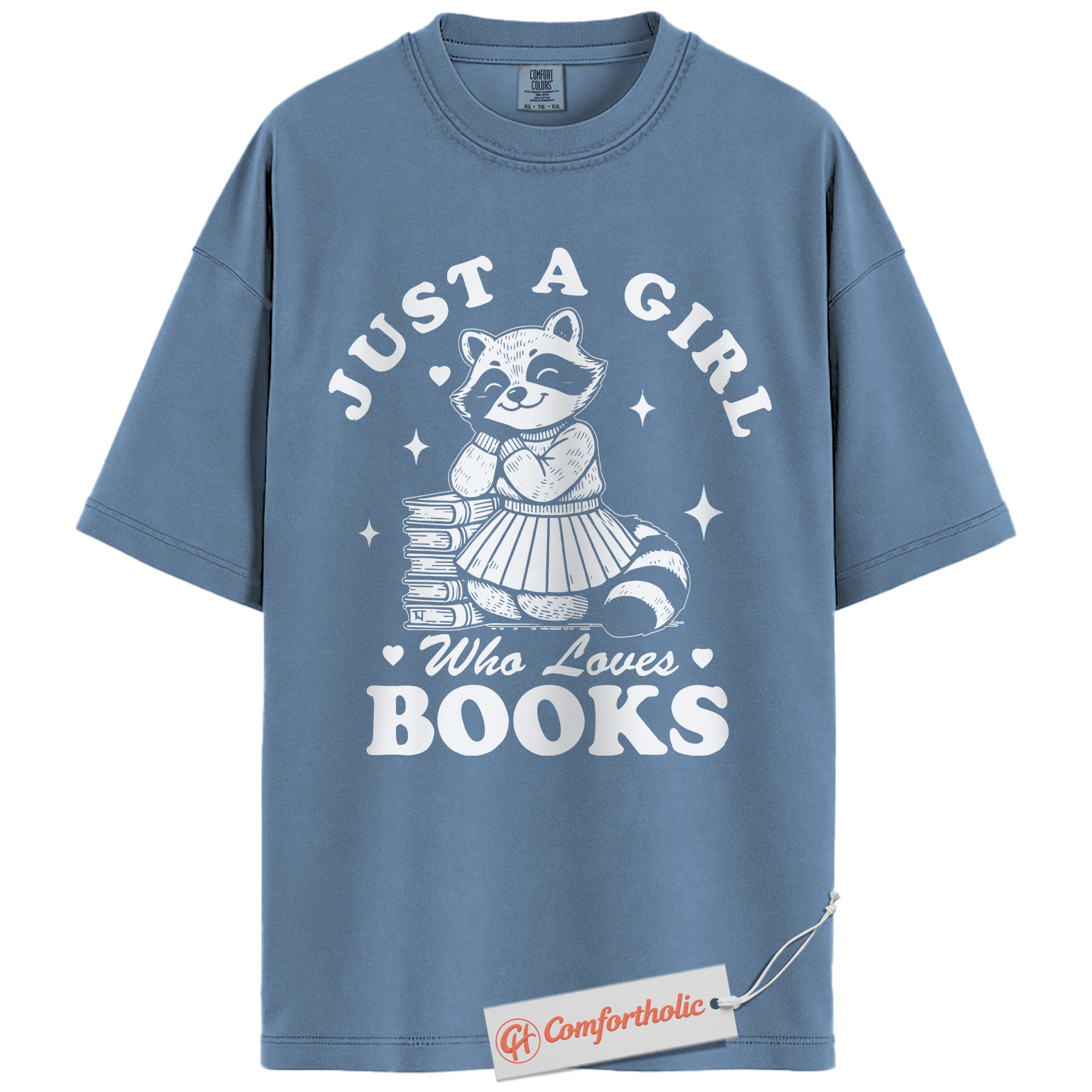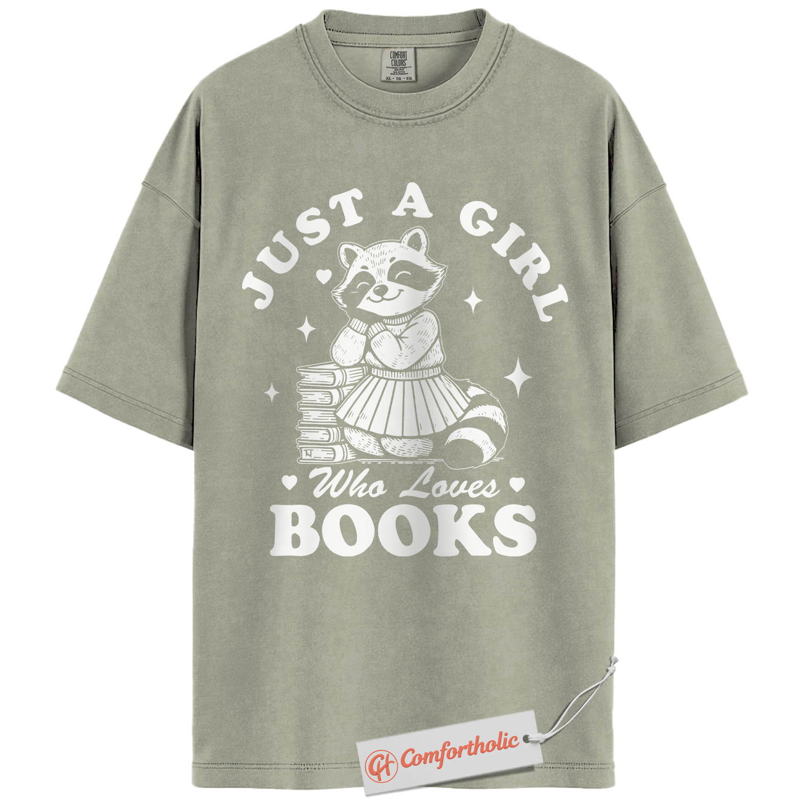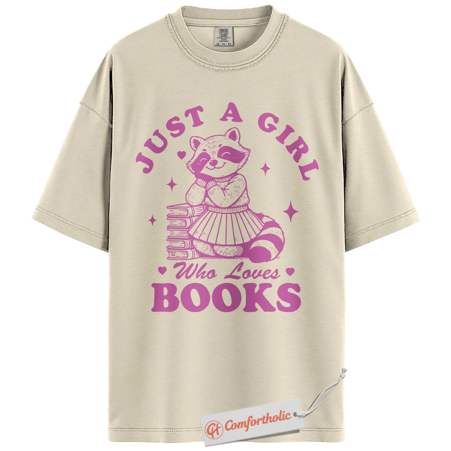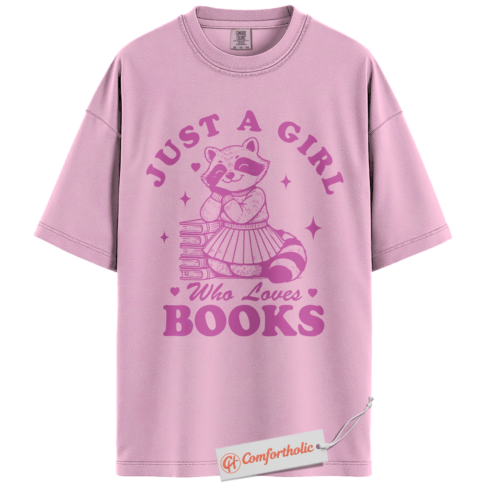 Just a Girl Who Loves Books Shirt, Cute Raccoon Reading Shirt, Book Lover Gift, Aesthetic Reader Shirt, Comfort Colors Shirt