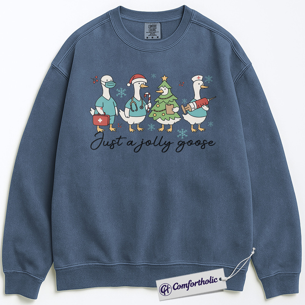 Just a Jolly Goose Sweatshirt, Funny Christmas Nurse Pullover, Holiday Medical Worker Graphic Crewneck, Cute Healthcare Gift for Goose Lovers, Comfort Colors Sweatshirt