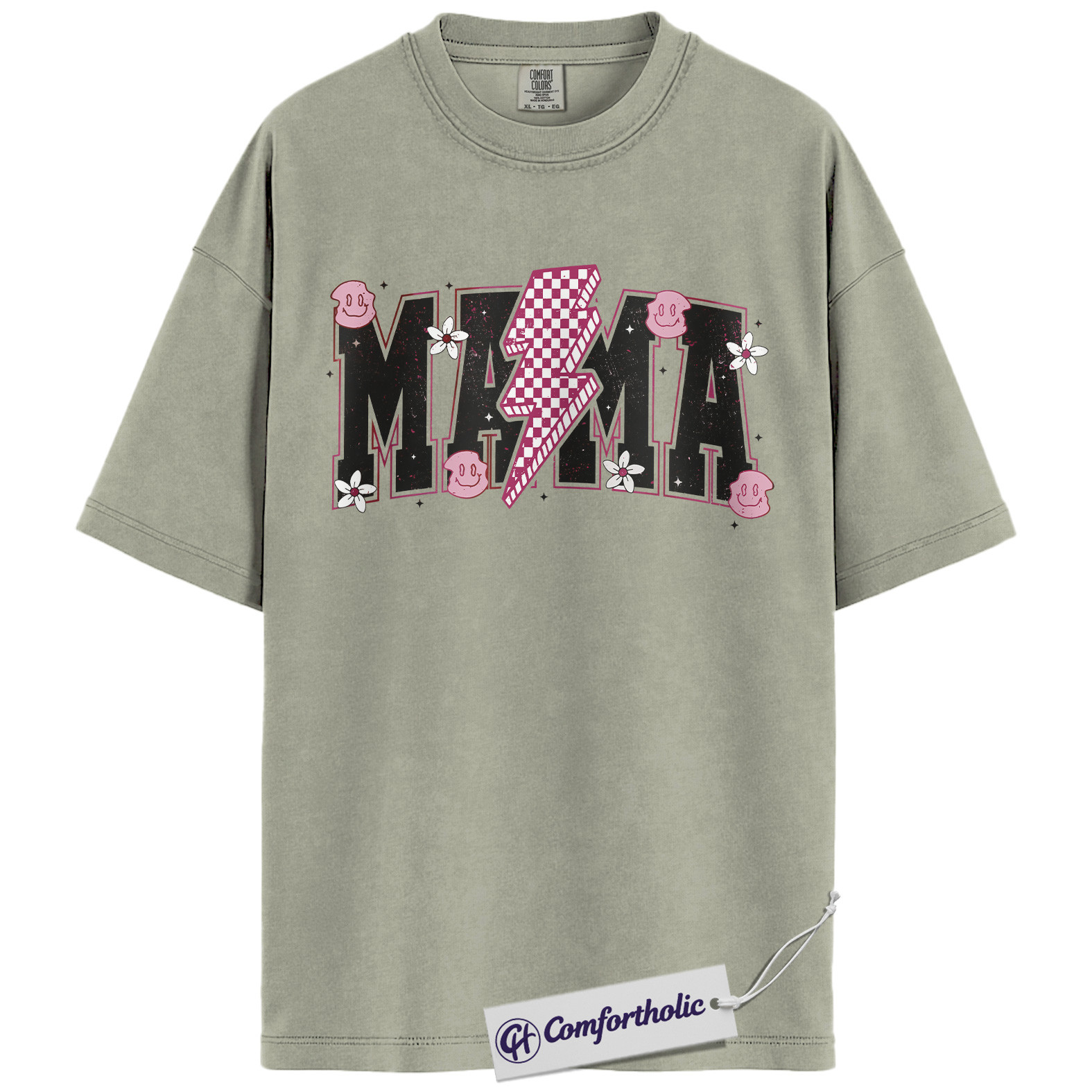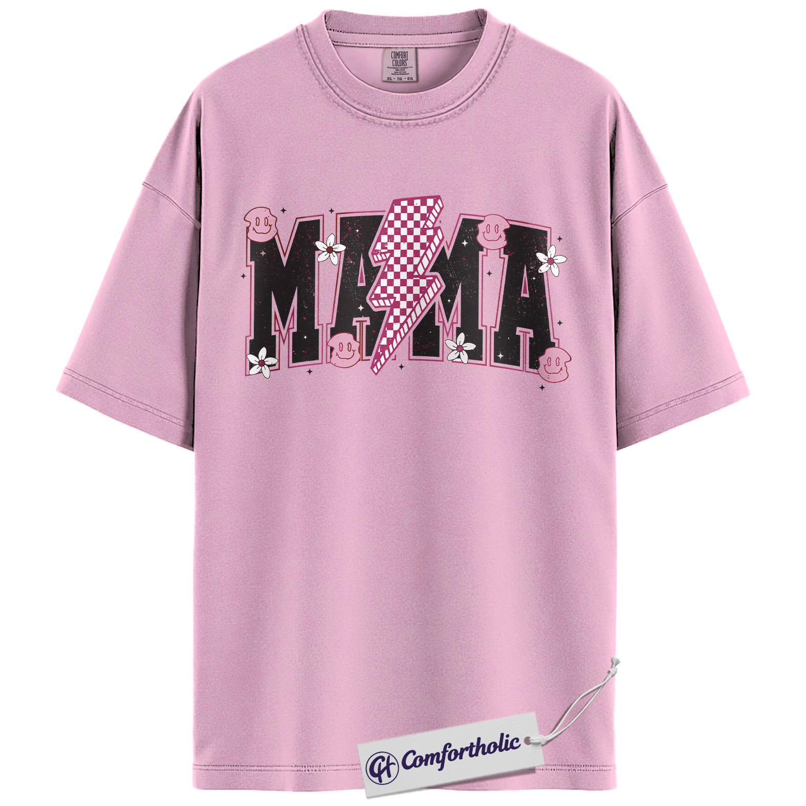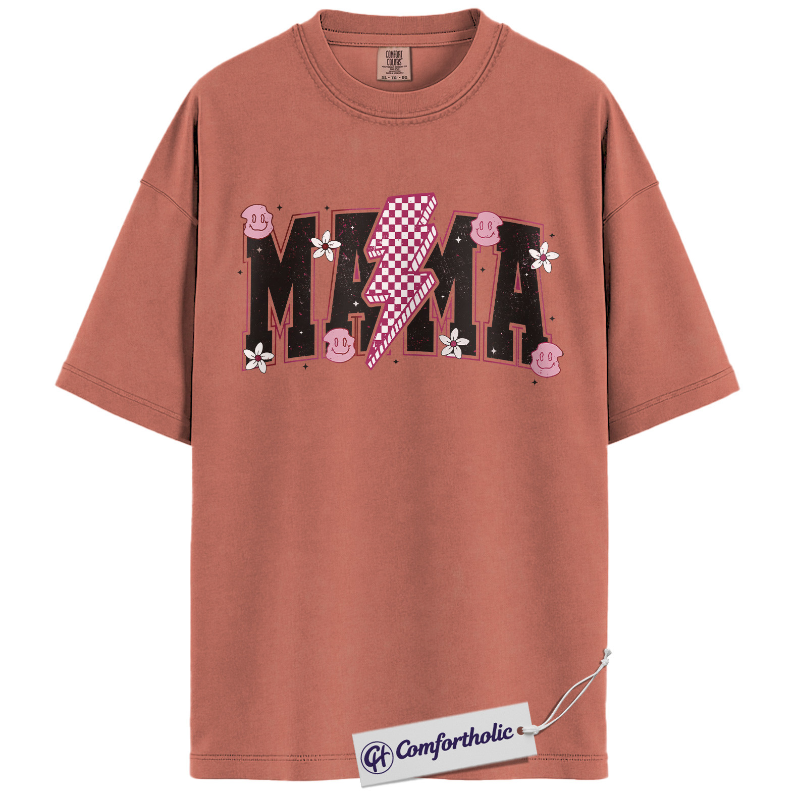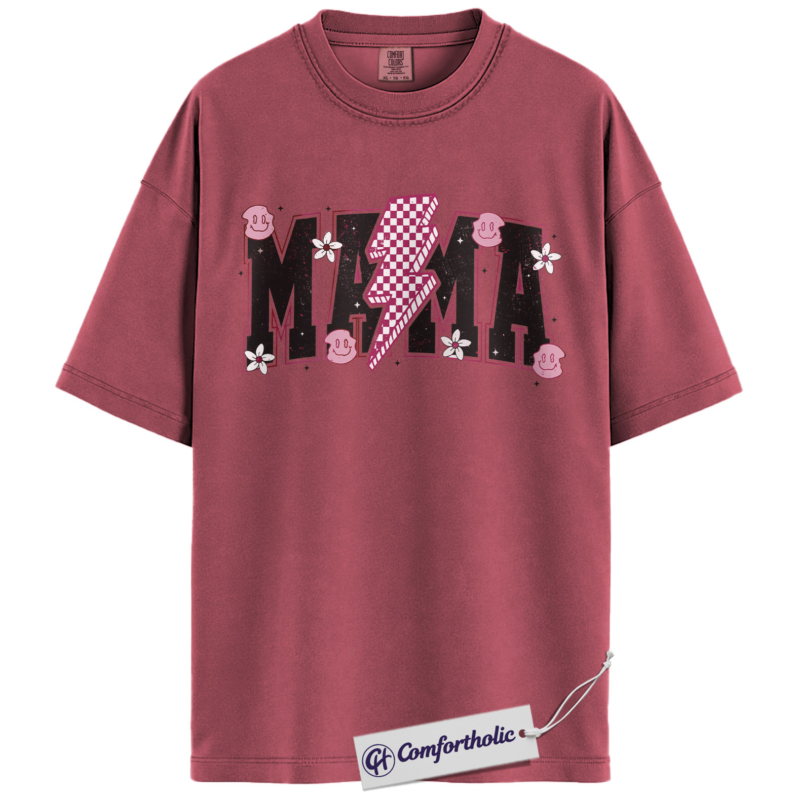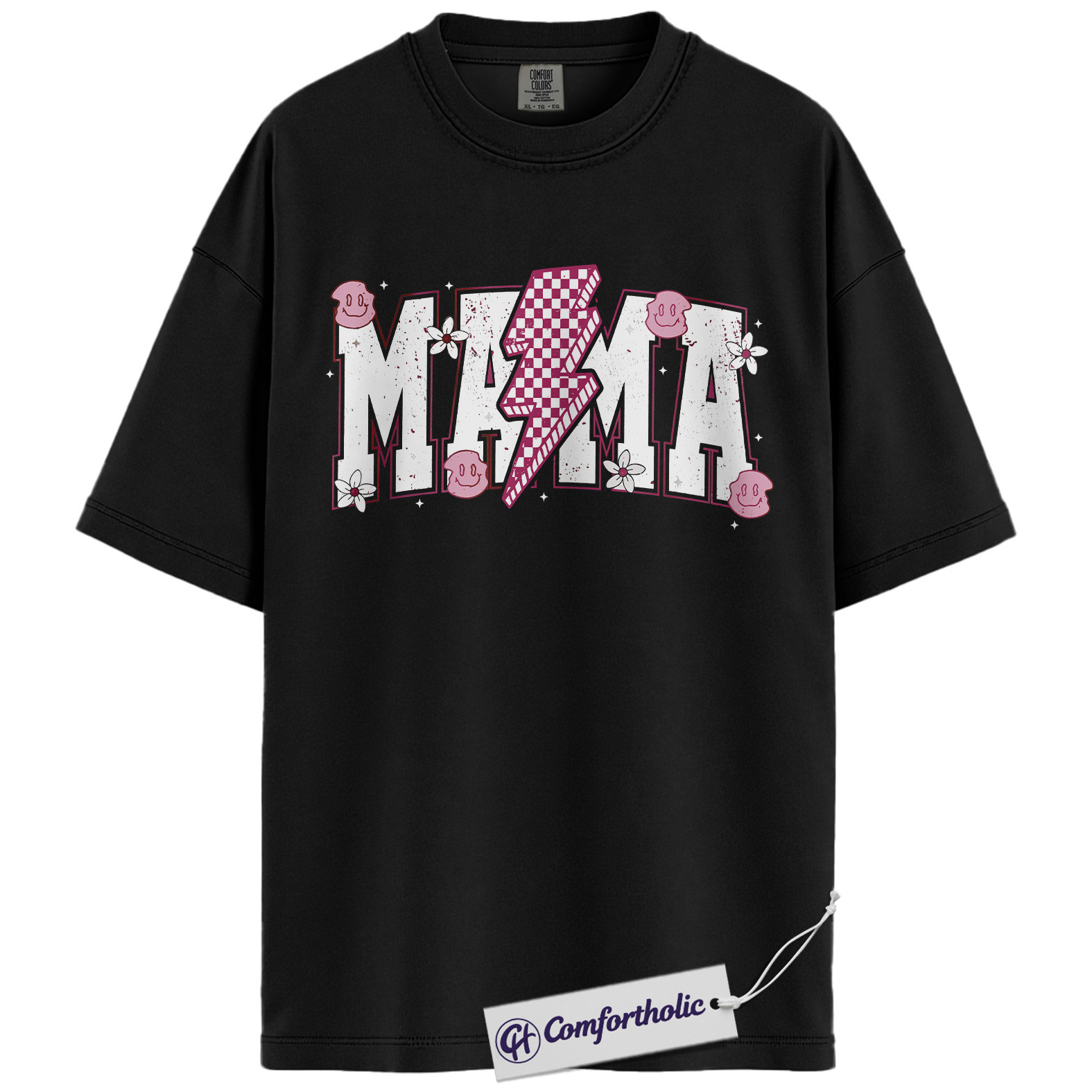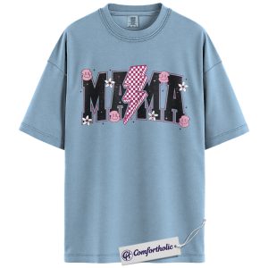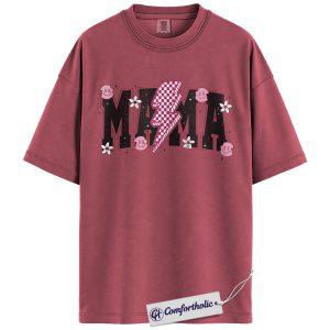 Lightning Bolt Mama Shirt, Cute Retro Mom T-Shirt, Trendy Checker Smiley Face Graphic Tee, Aesthetic Mother’s Day Gift for Moms, Family Comfort Colors Shirt