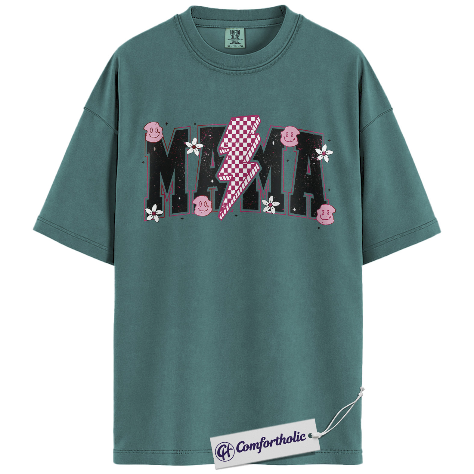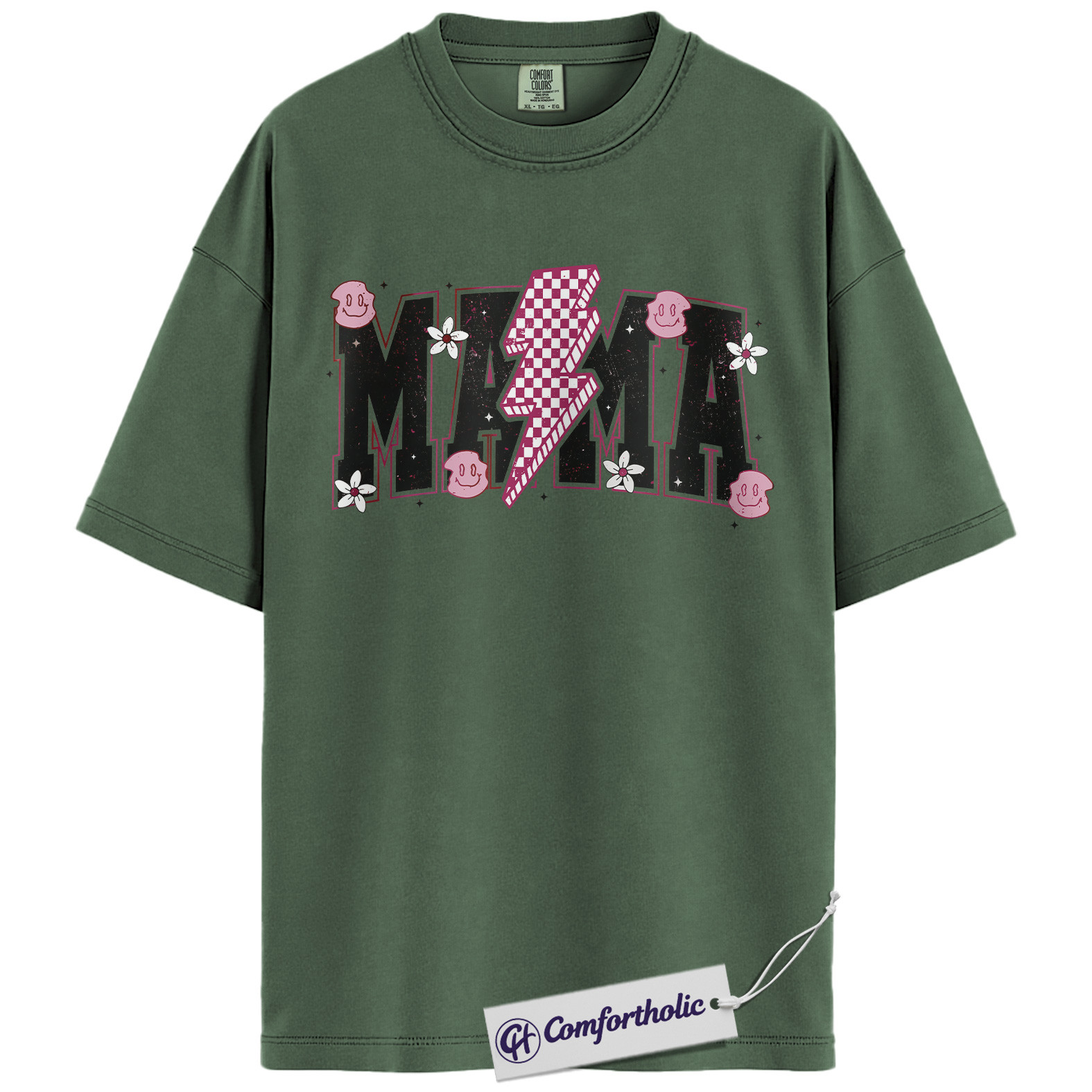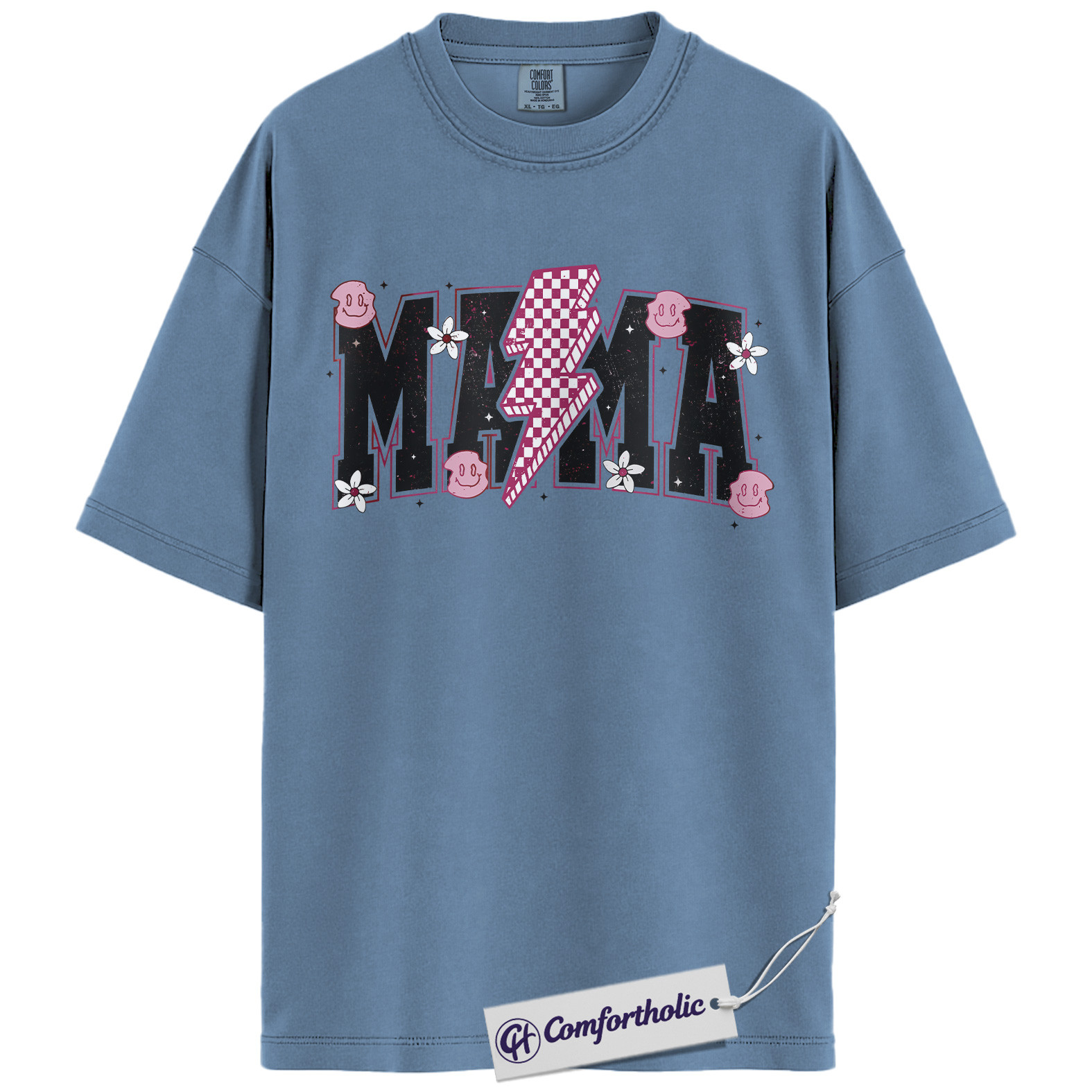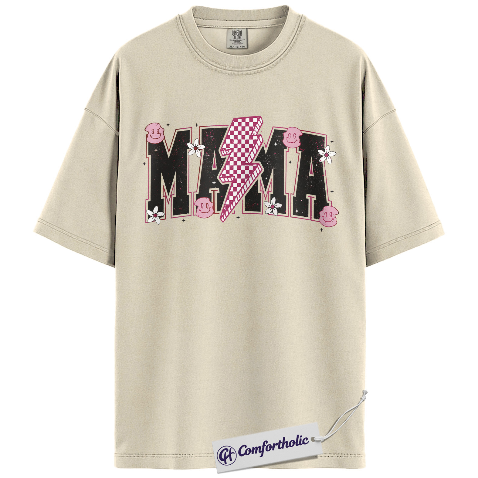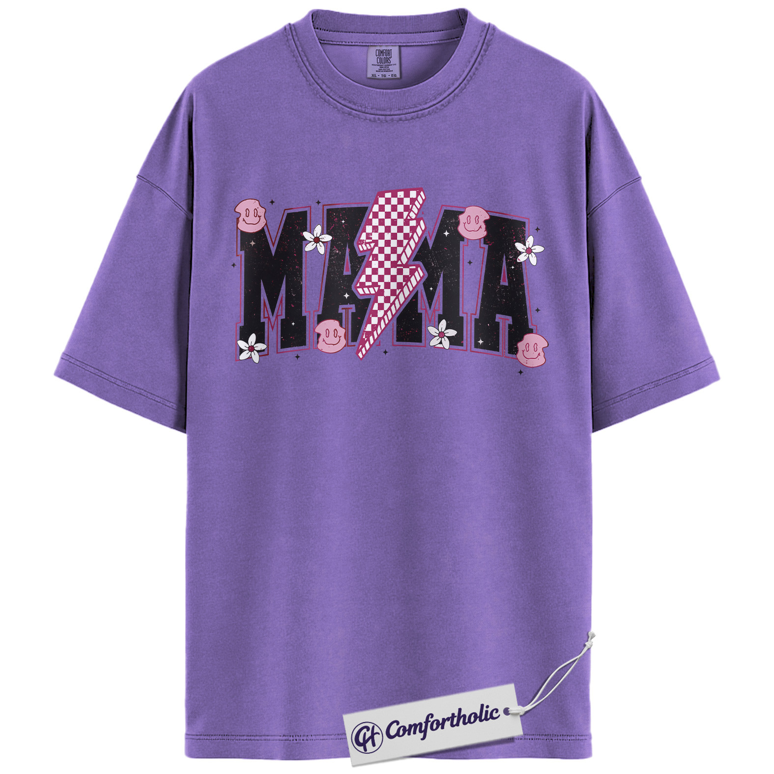 Lightning Bolt Mama Shirt, Cute Retro Mom T-Shirt, Trendy Checker Smiley Face Graphic Tee, Aesthetic Mother’s Day Gift for Moms, Family Comfort Colors Shirt