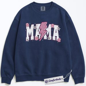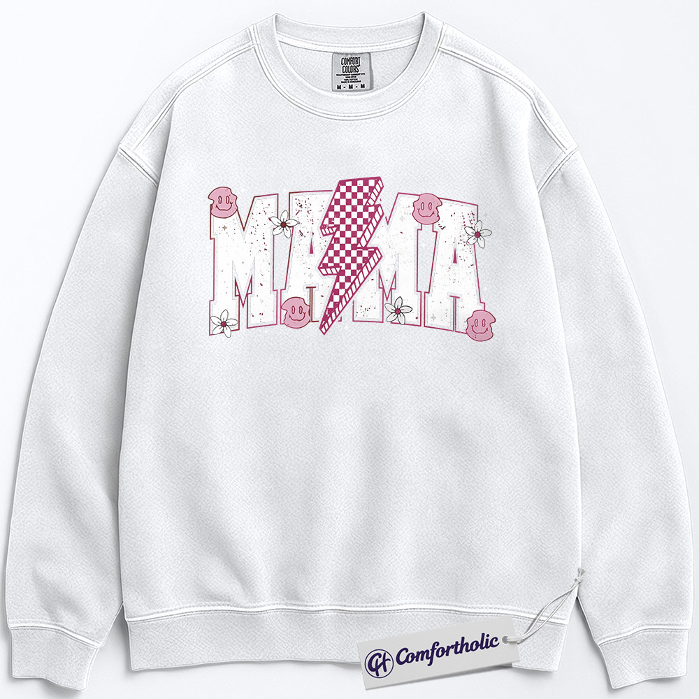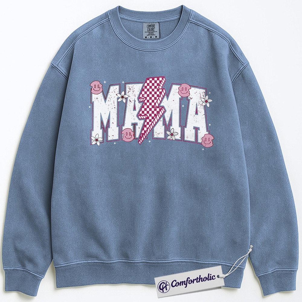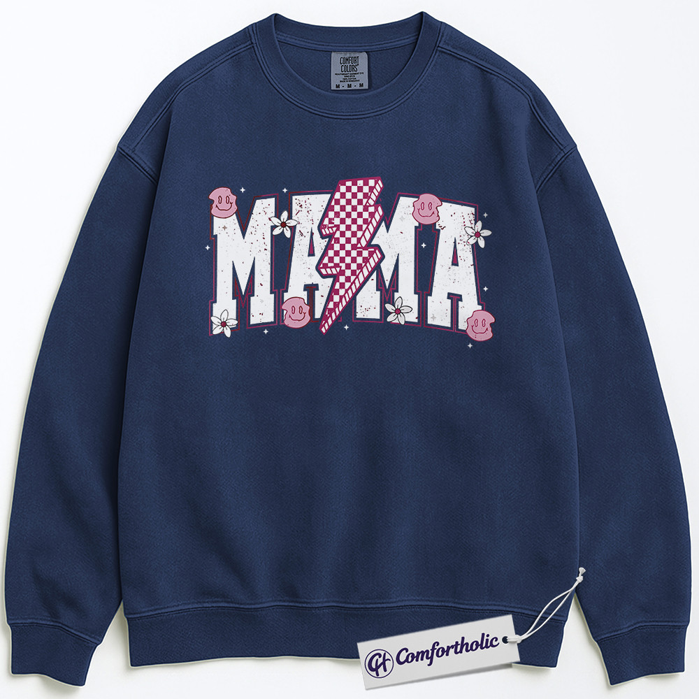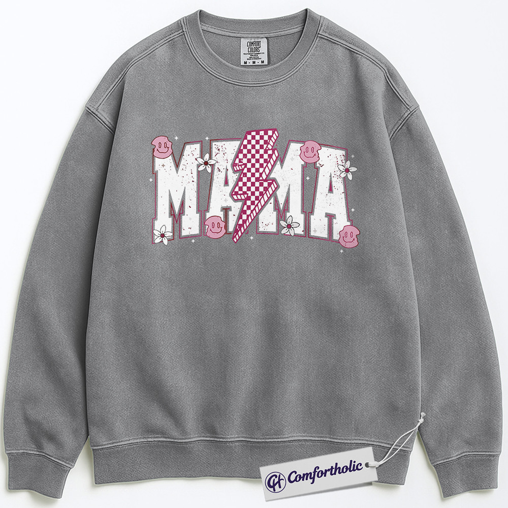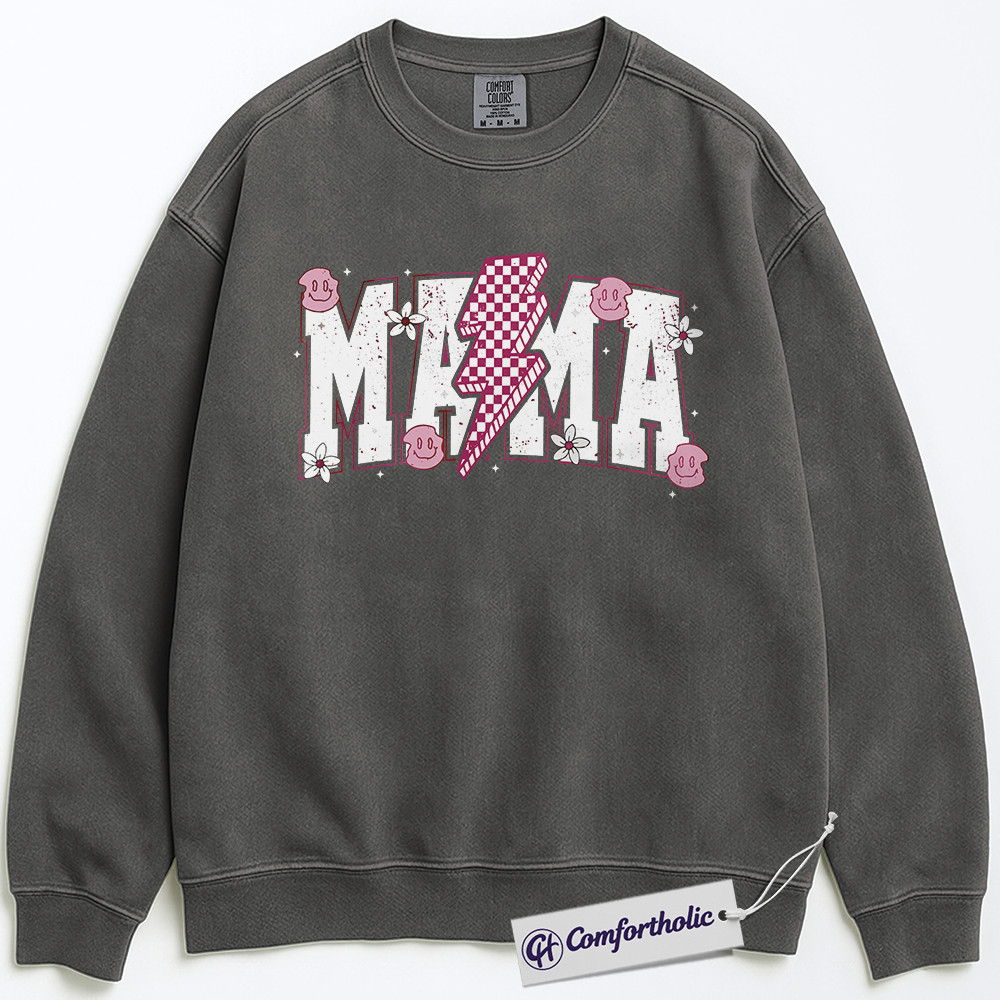 Lightning Bolt Mama Sweatshirt, Cute Retro Mom Crewneck, Trendy Checker Smiley Face Graphic Pullover, Aesthetic Mother’s Day Gift for Moms, Family Comfort Colors Sweatshirt