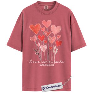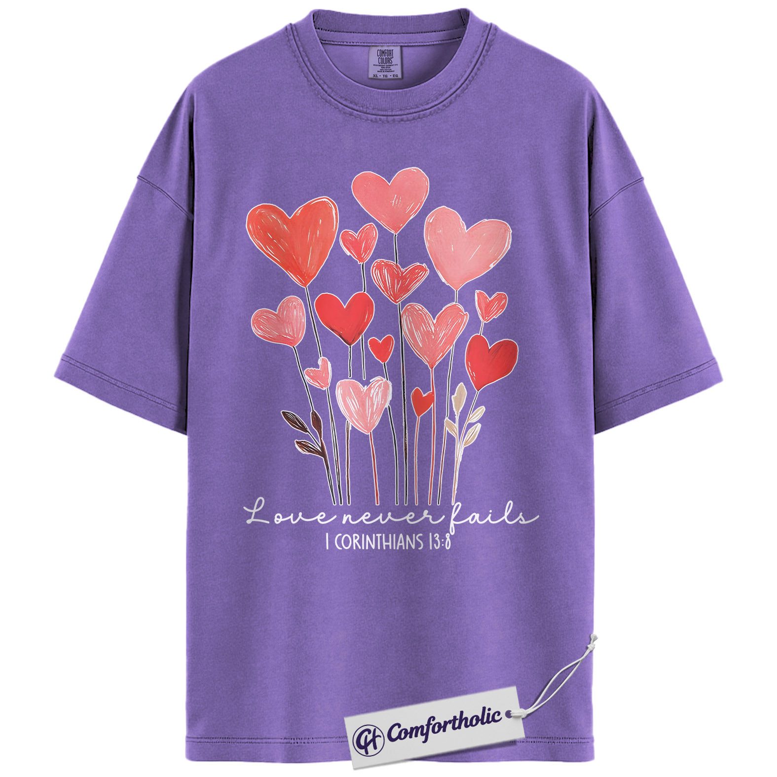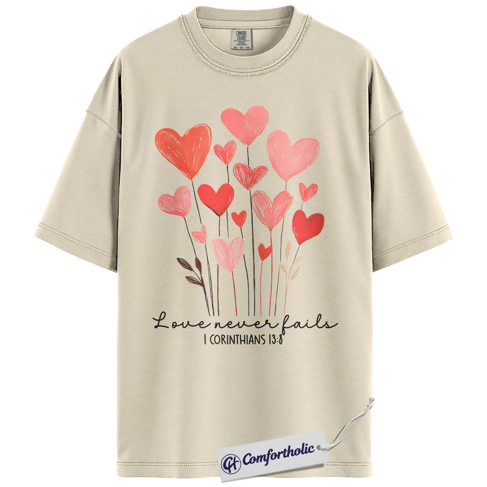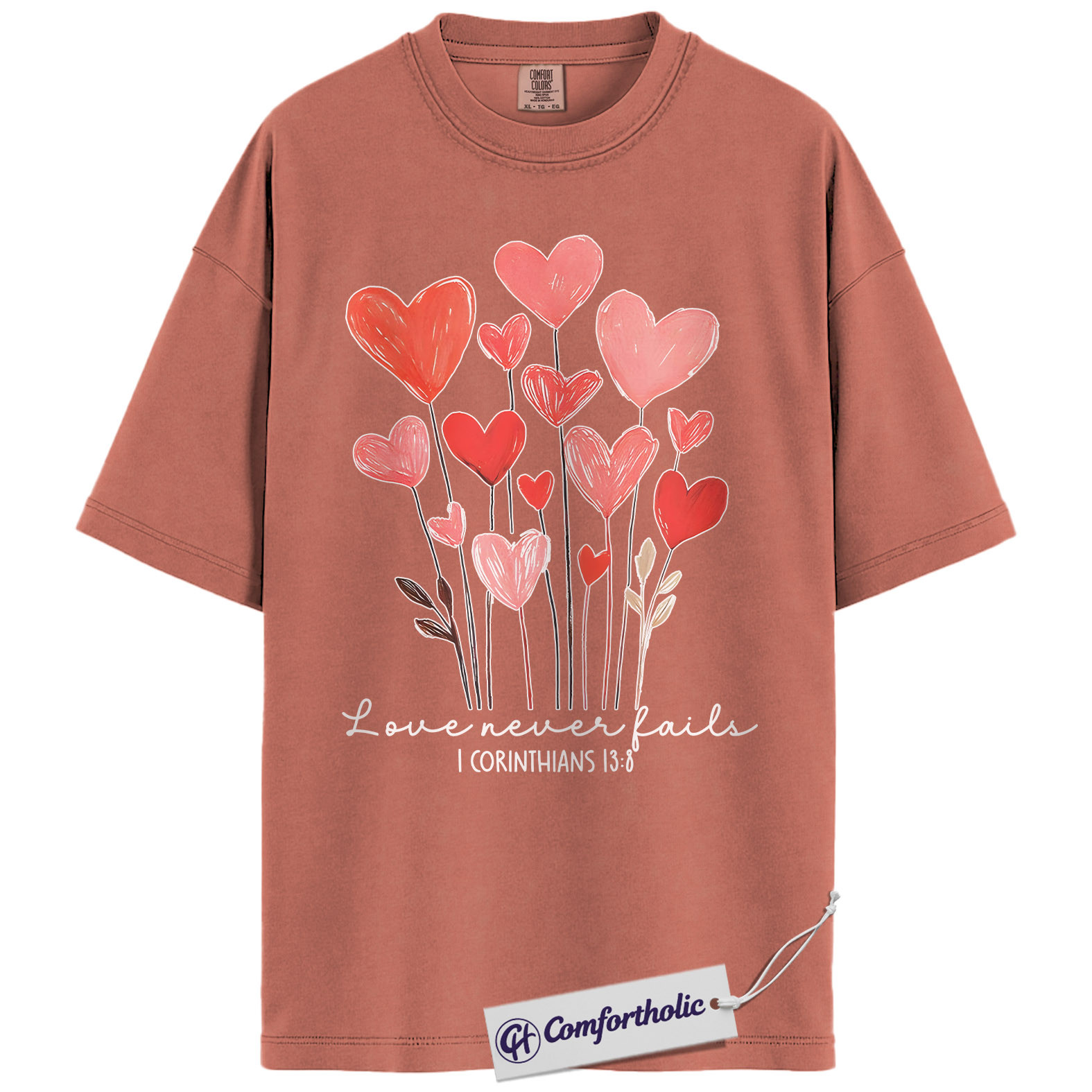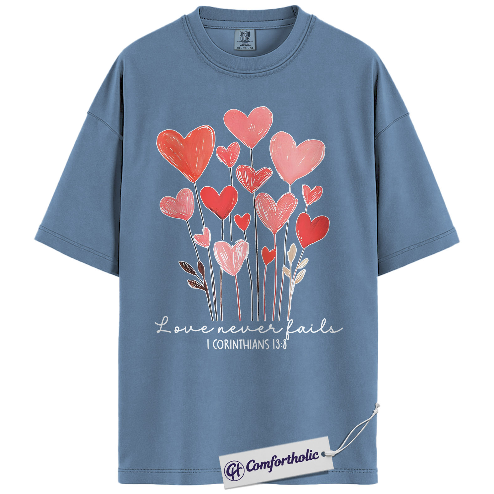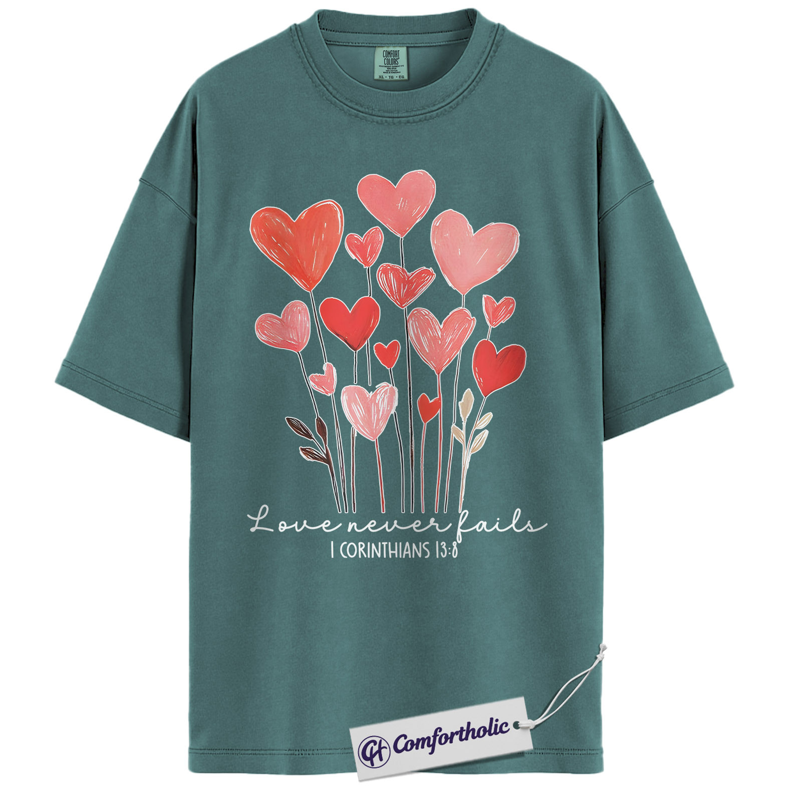 Love Never Fails Shirt, 1 Corinthians 13:8 Christian Tee, Valentine Faith Graphic T-Shirt, Gift for Her, Comfort Colors Shirt
