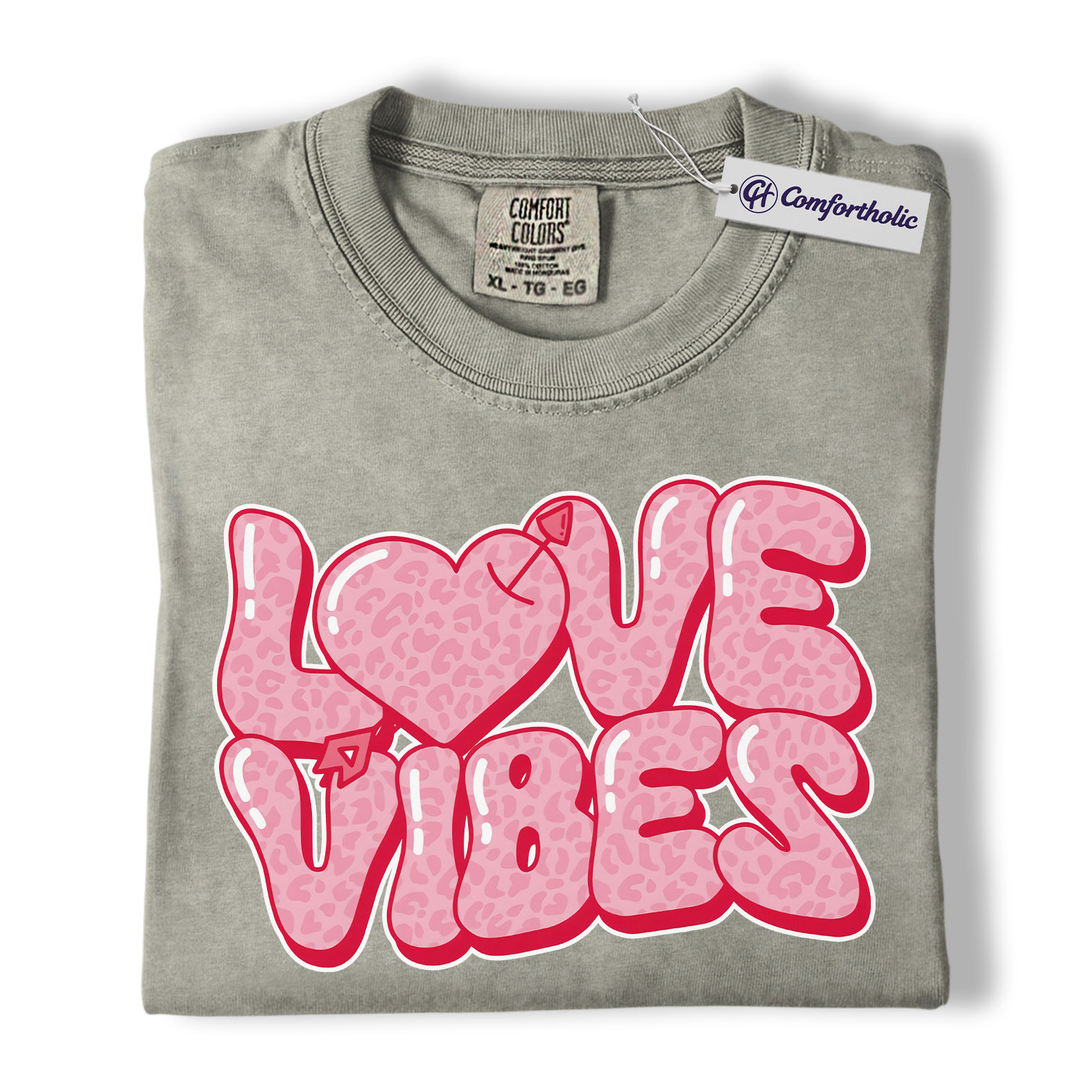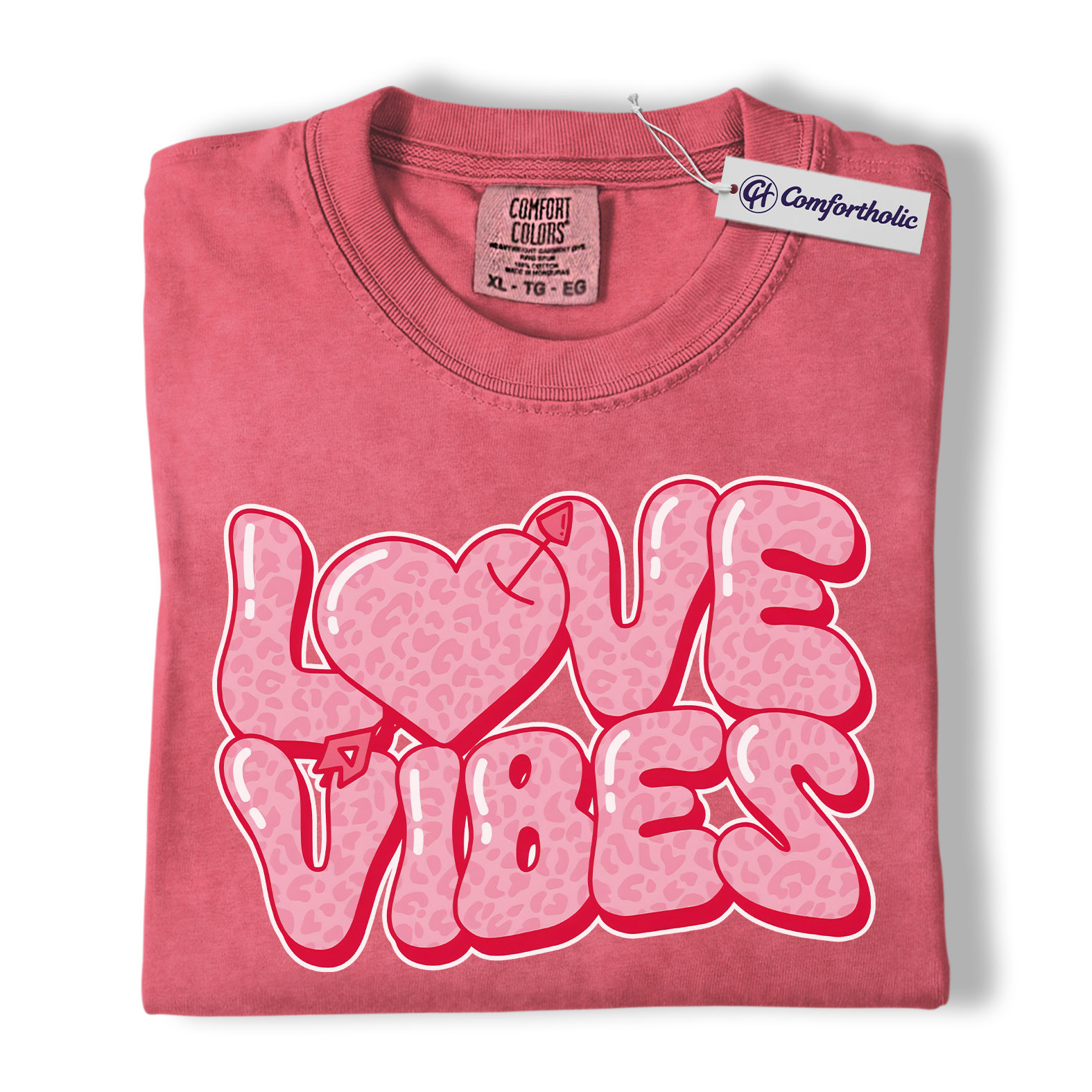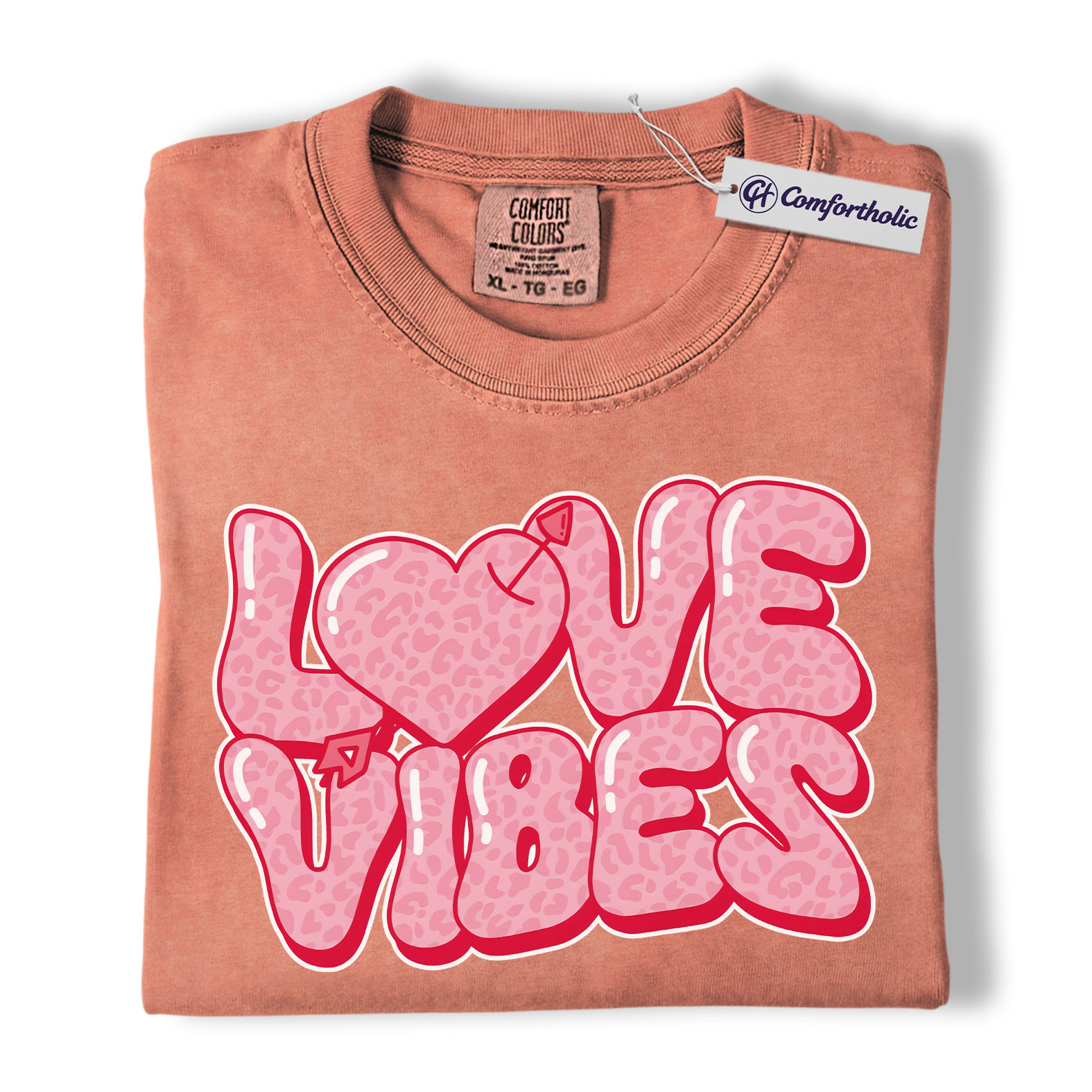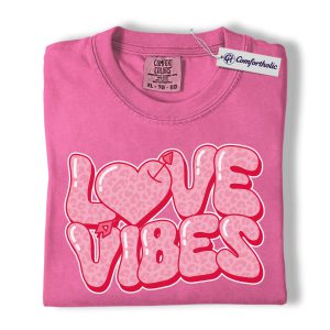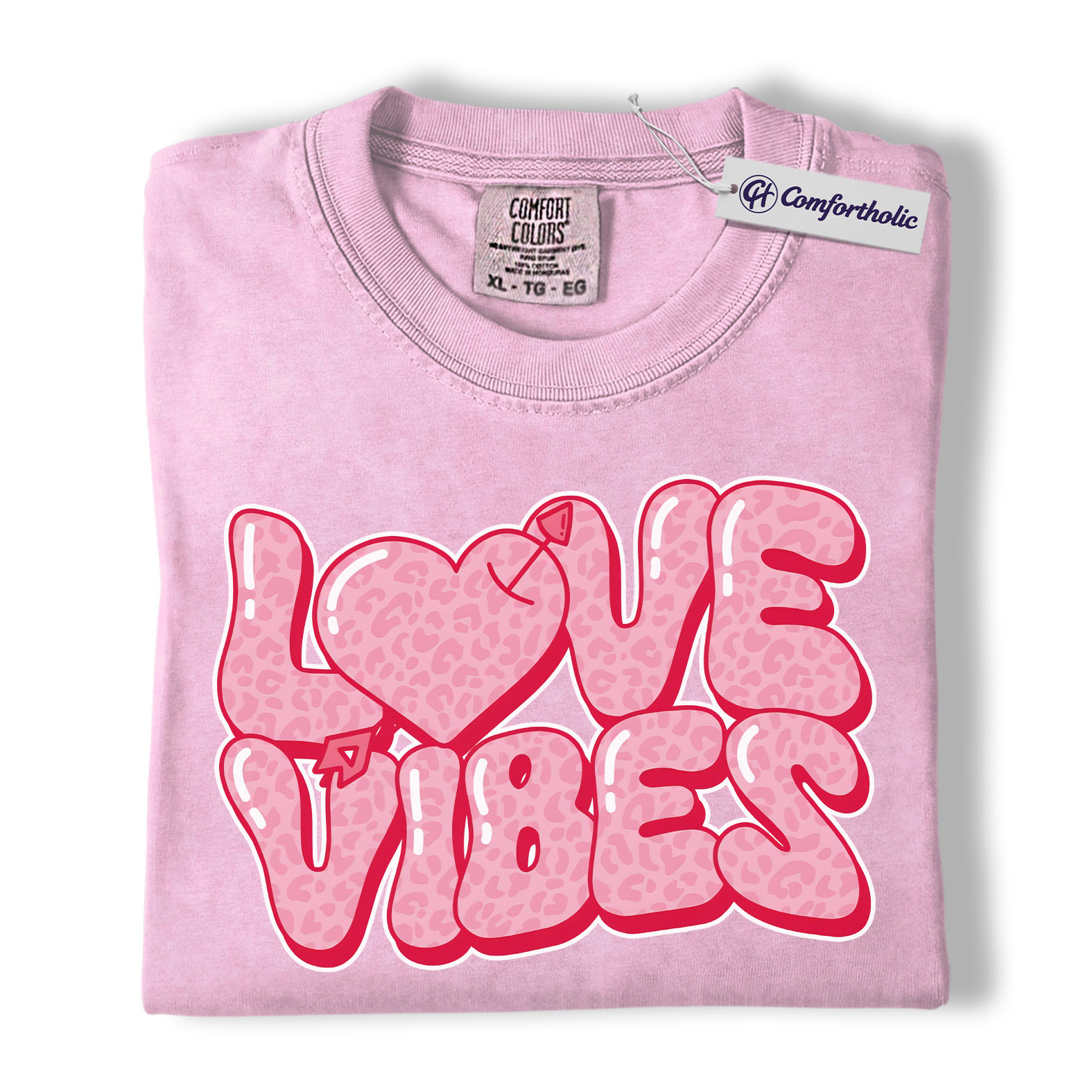 Love Vibes Shirt, Pink Leopard Heart Graphic Tee, Trendy Valentine’s Day T-Shirt, Cute Gift for Girlfriend & Women, Comfort Colors Shirt