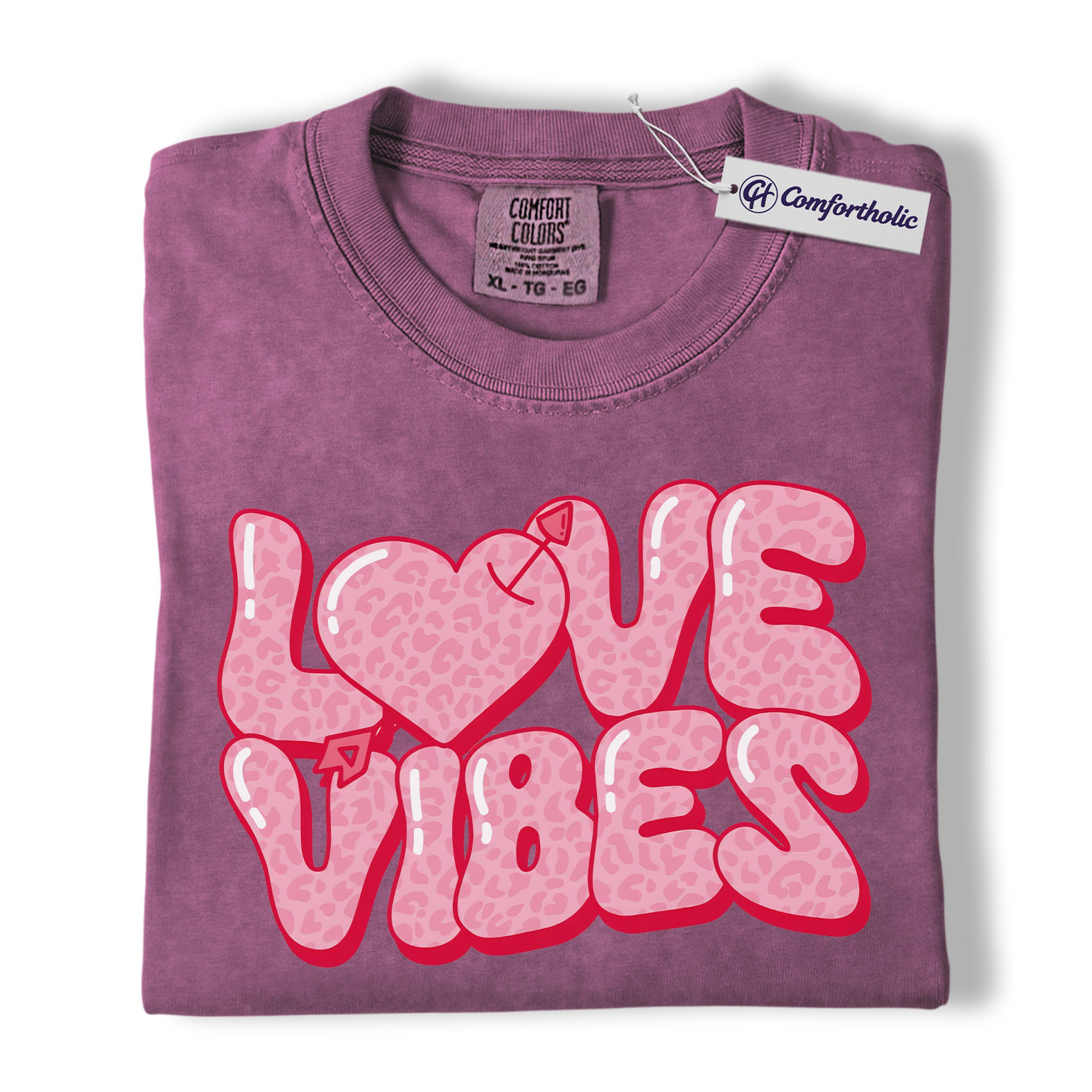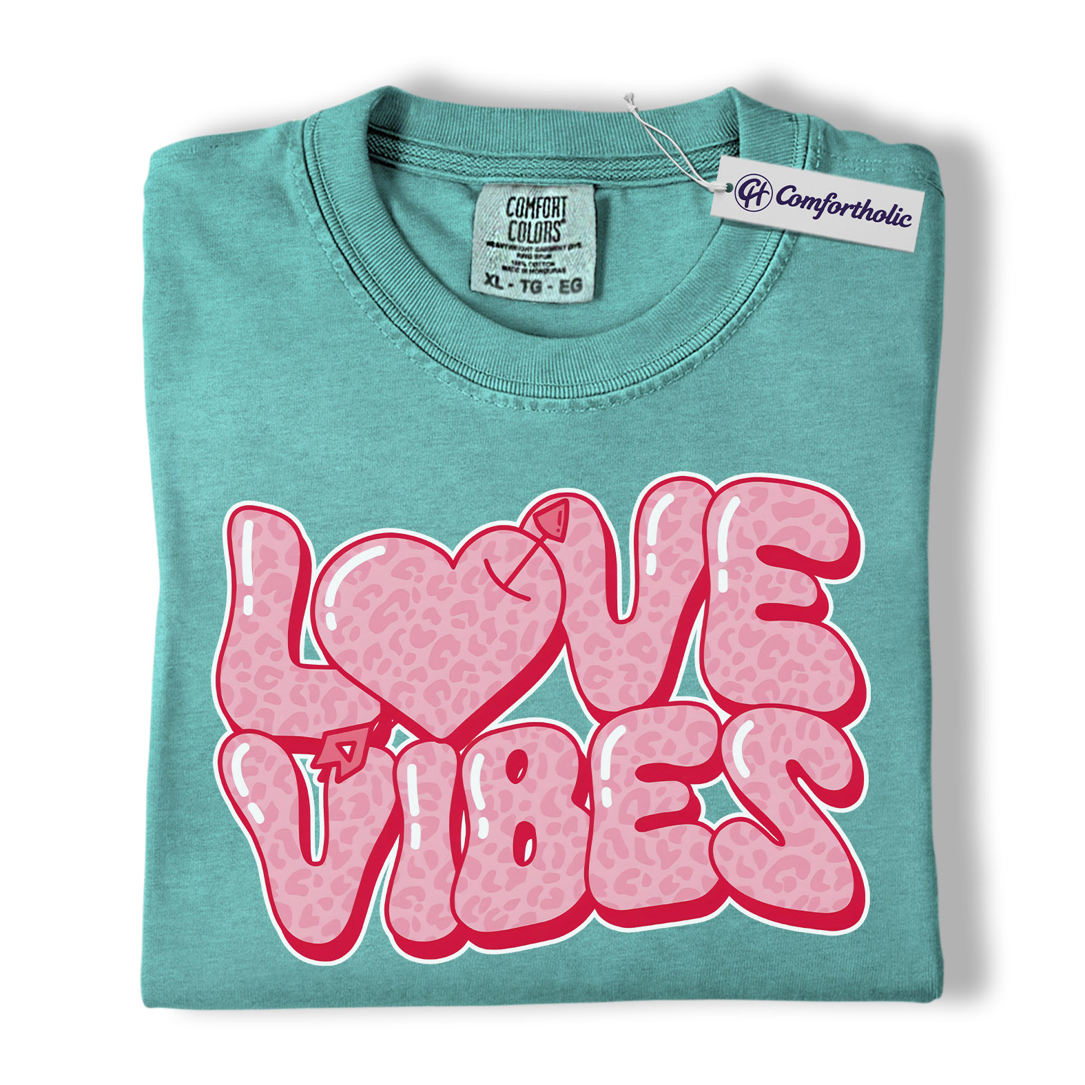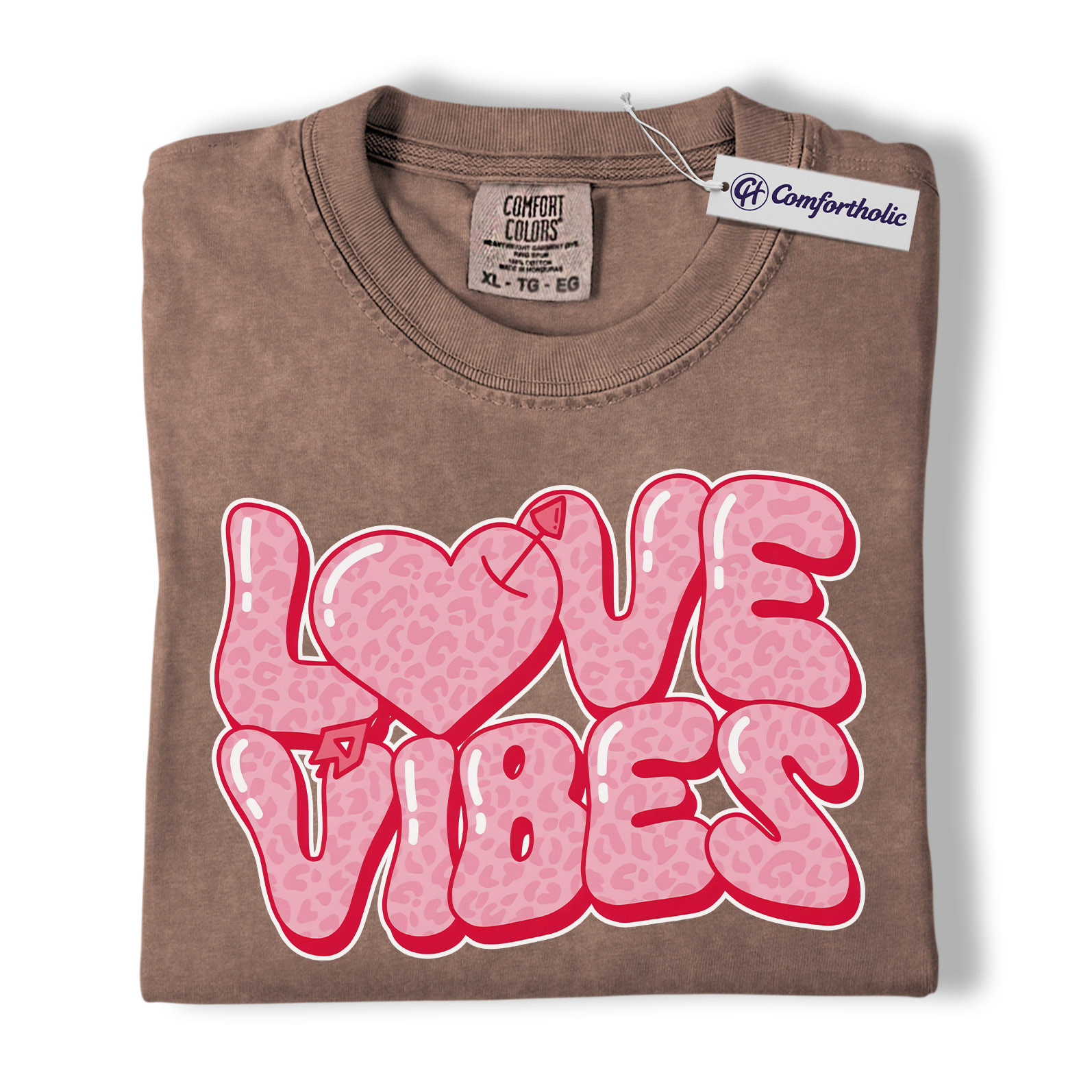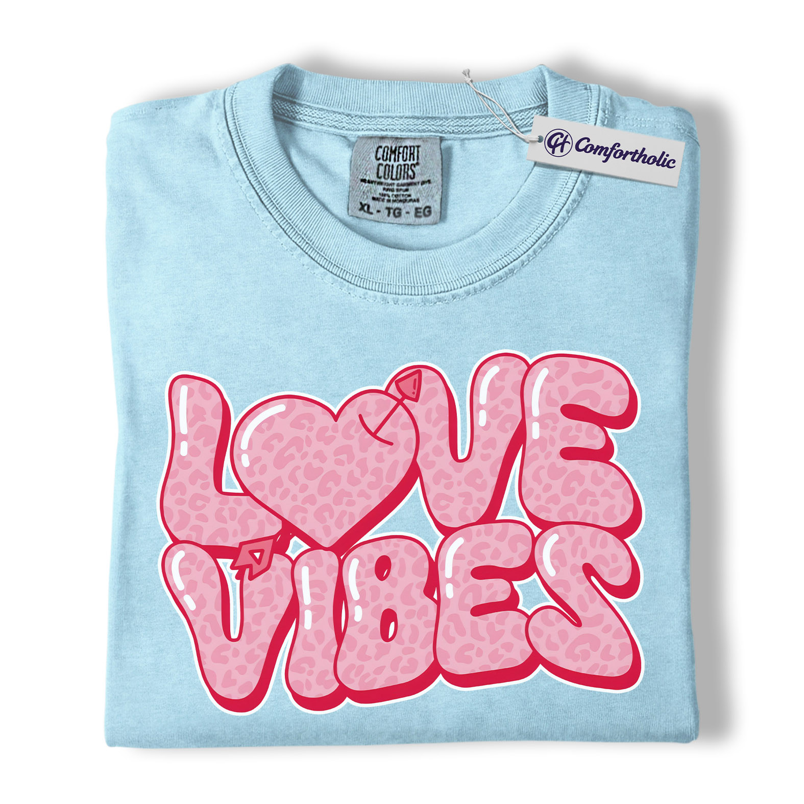 Love Vibes Shirt, Pink Leopard Heart Graphic Tee, Trendy Valentine’s Day T-Shirt, Cute Gift for Girlfriend & Women, Comfort Colors Shirt