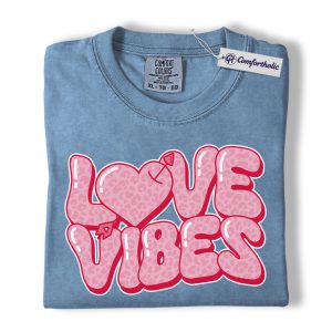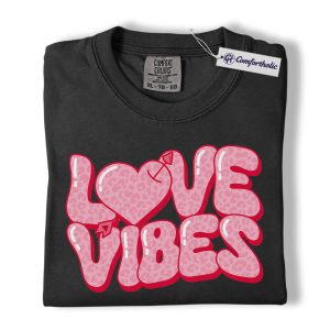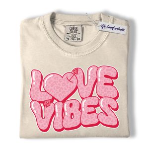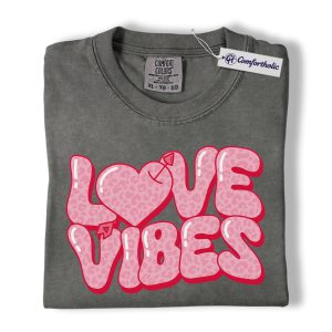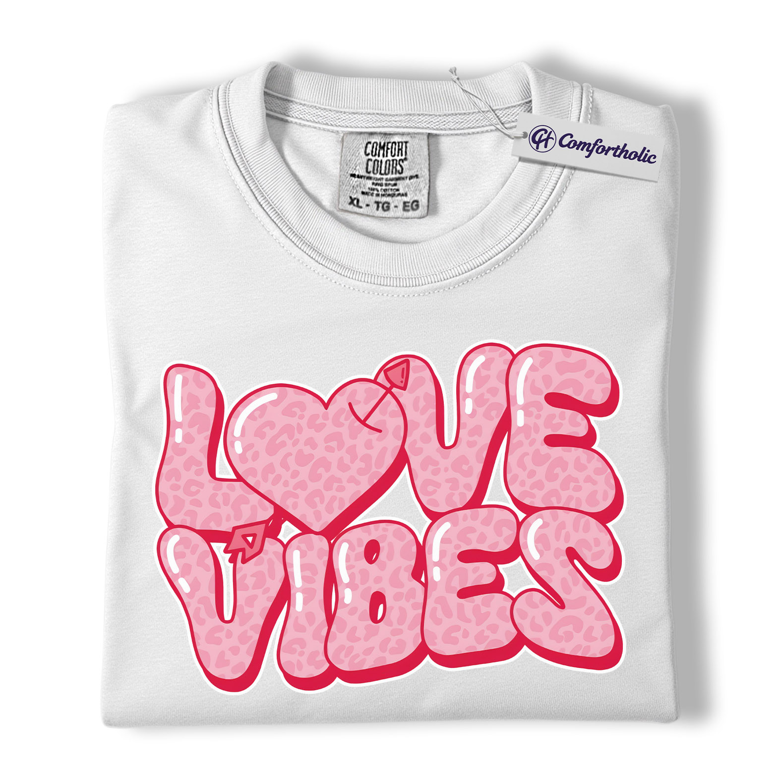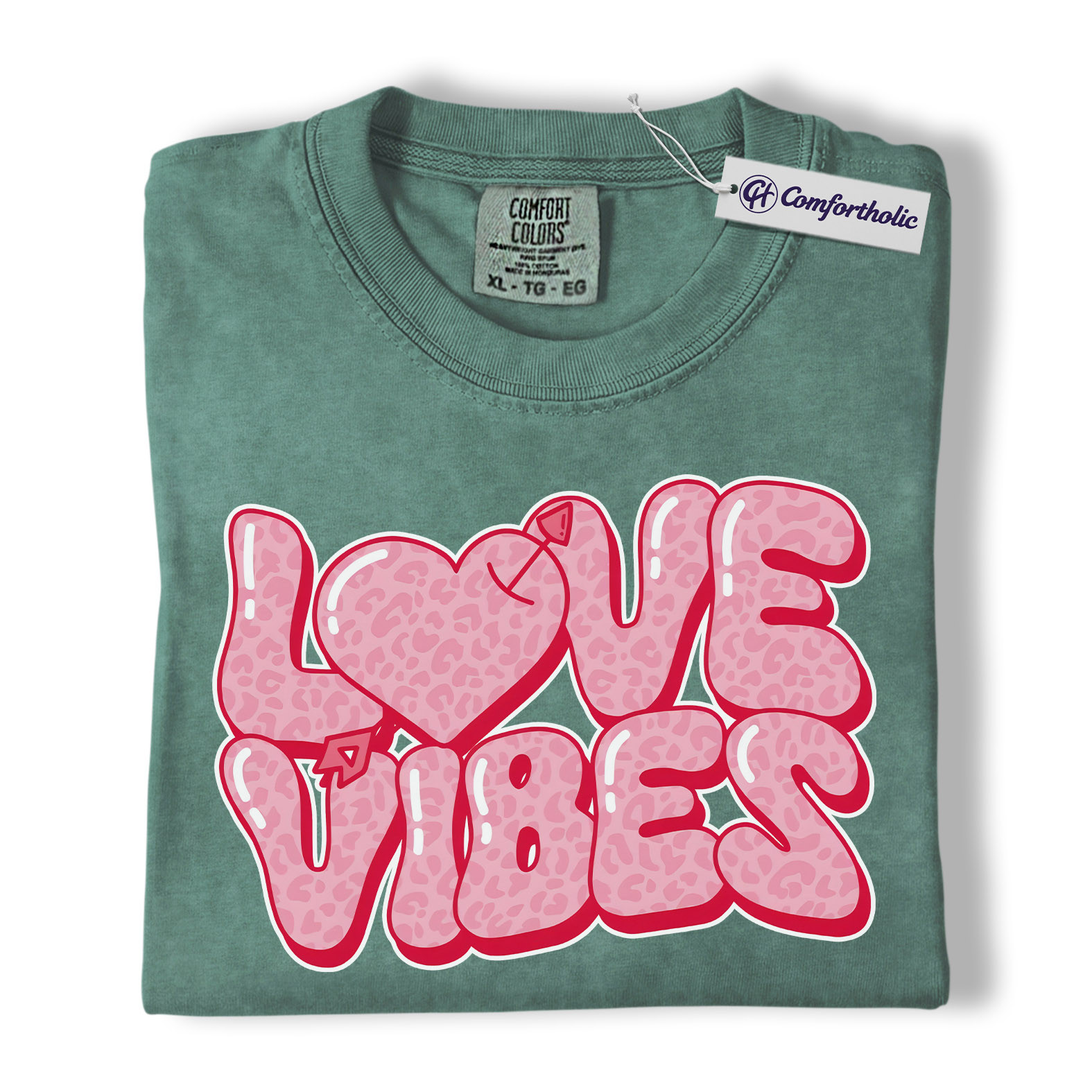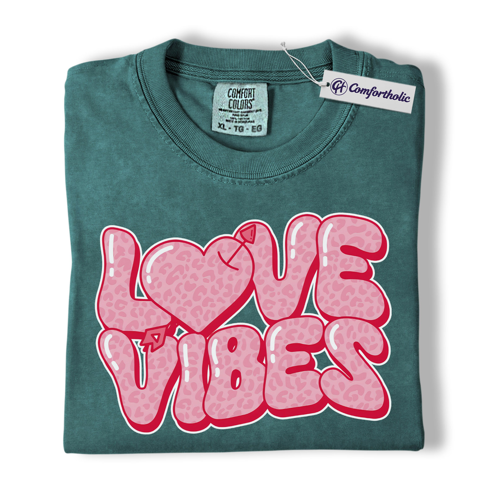 Love Vibes Shirt, Pink Leopard Heart Graphic Tee, Trendy Valentine’s Day T-Shirt, Cute Gift for Girlfriend & Women, Comfort Colors Shirt